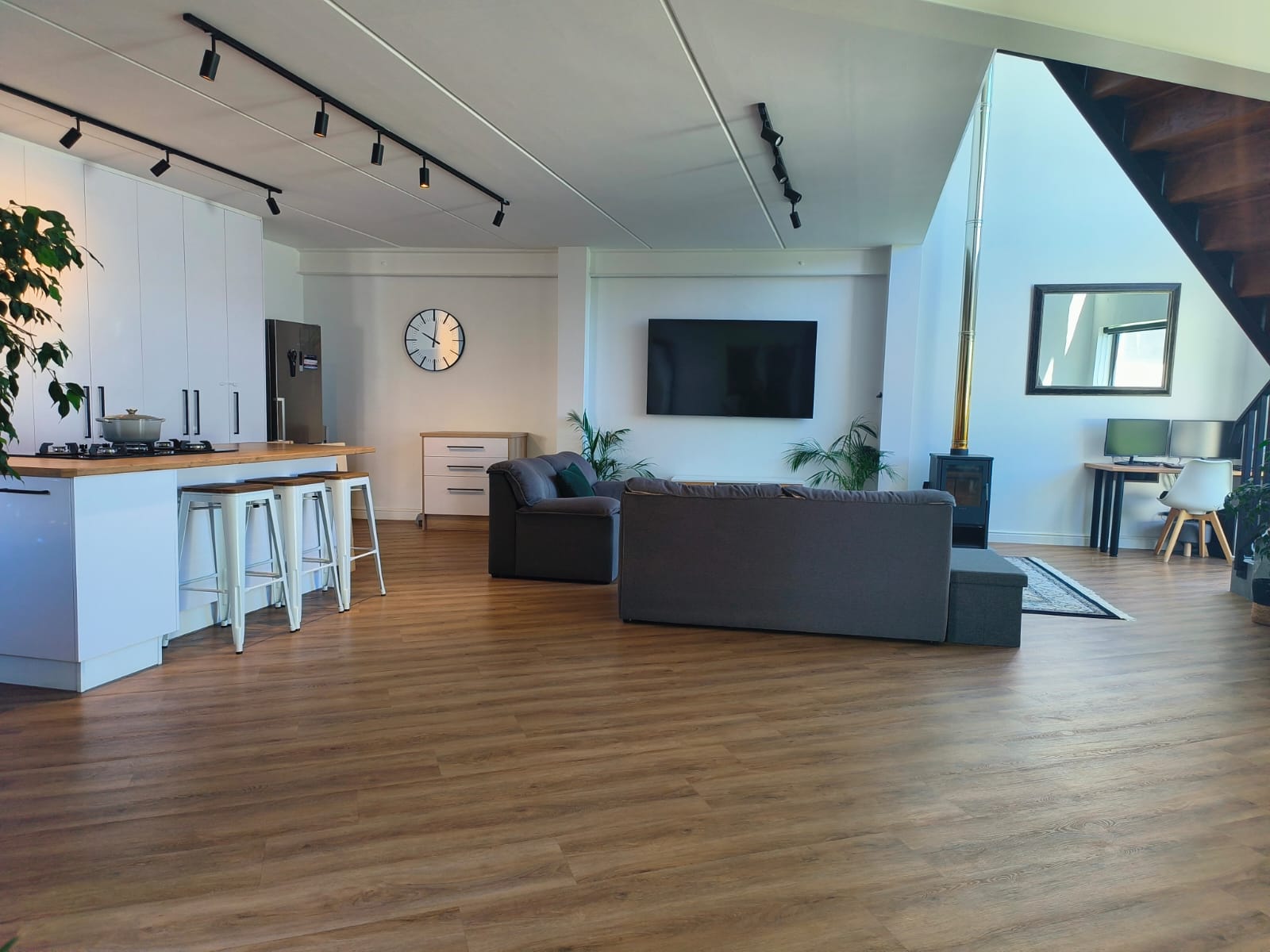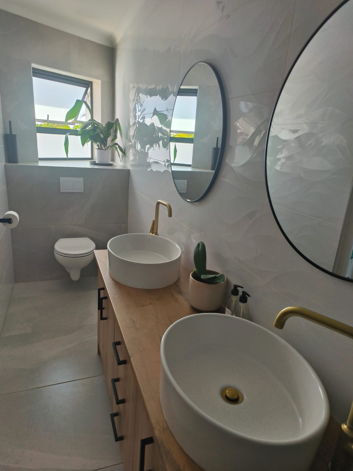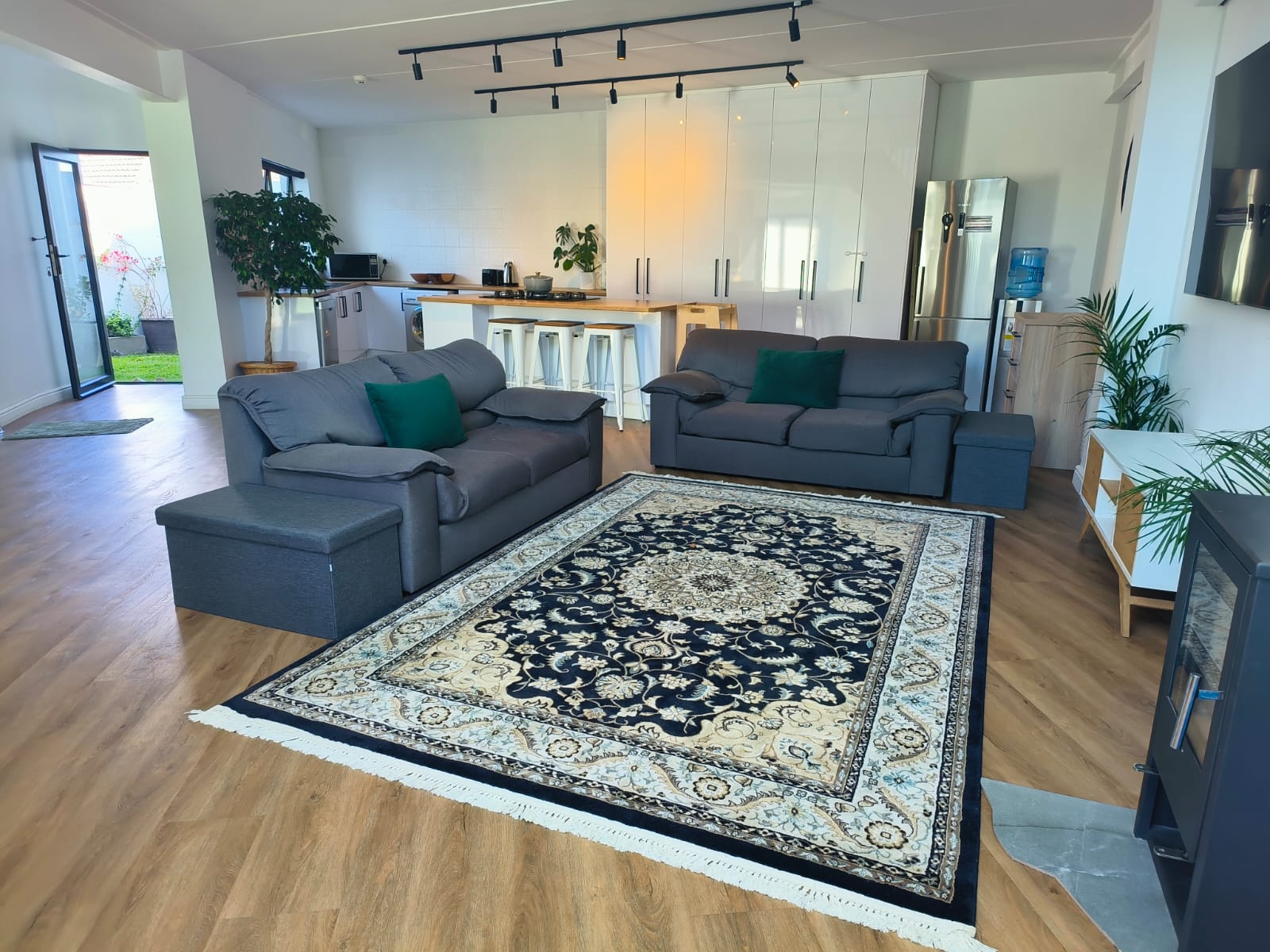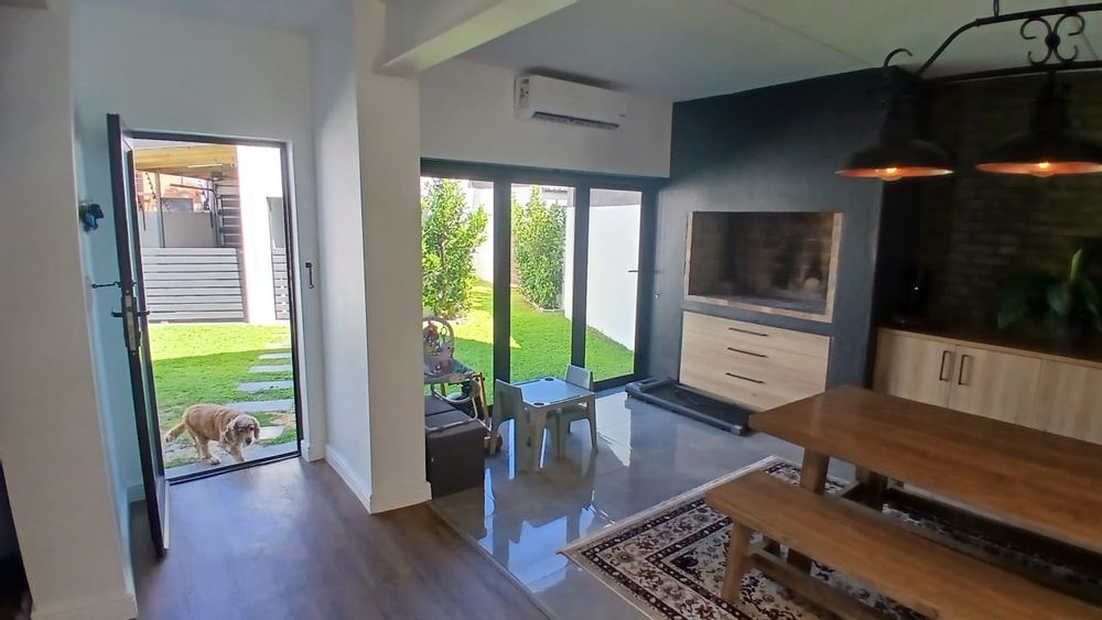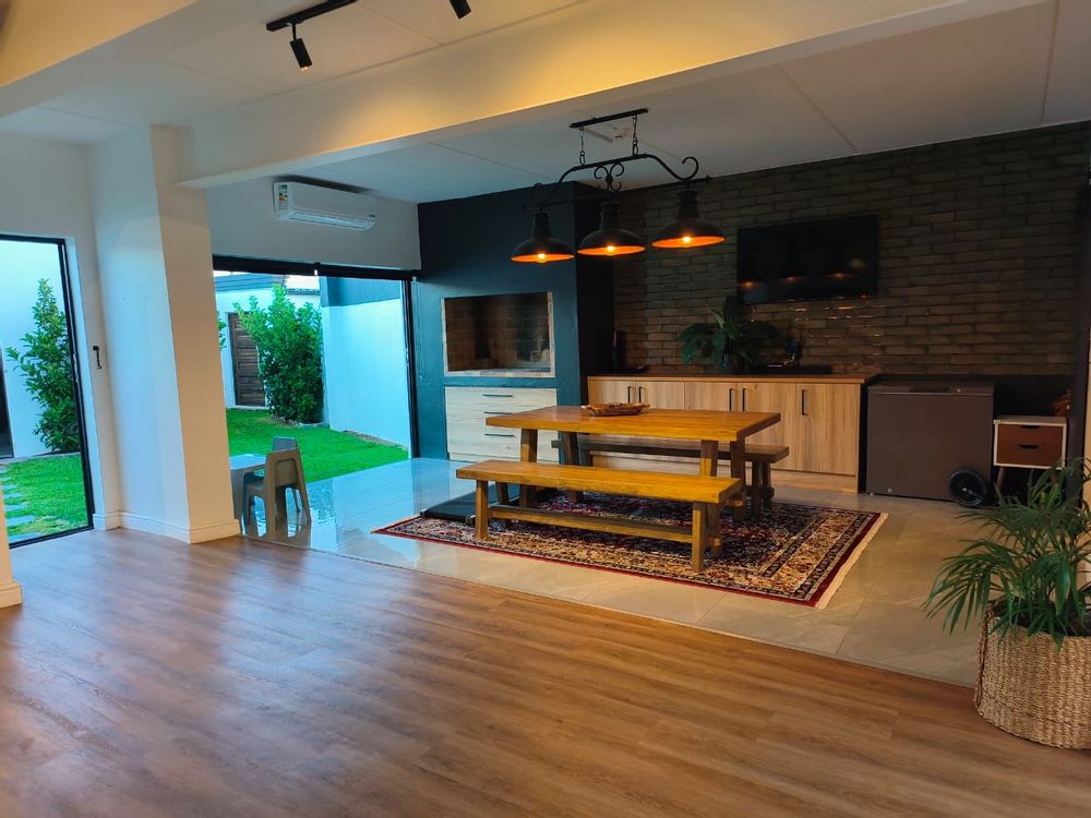 As you enter this beautifully designed home, you’re welcomed into a spacious open-plan kitchen, dining room, living room, and entertainment area, complete with an indoor braai. The living room also features a slow-combustion fireplace for added warmth during the winter months.