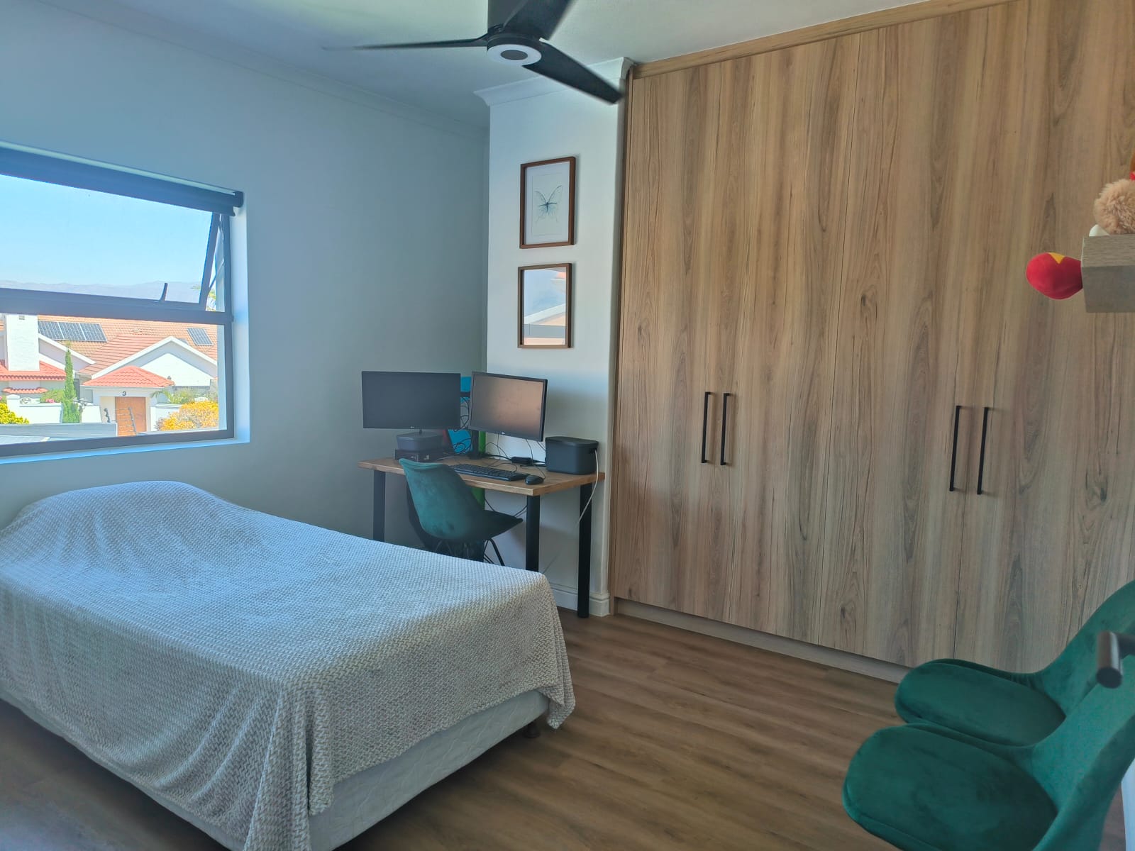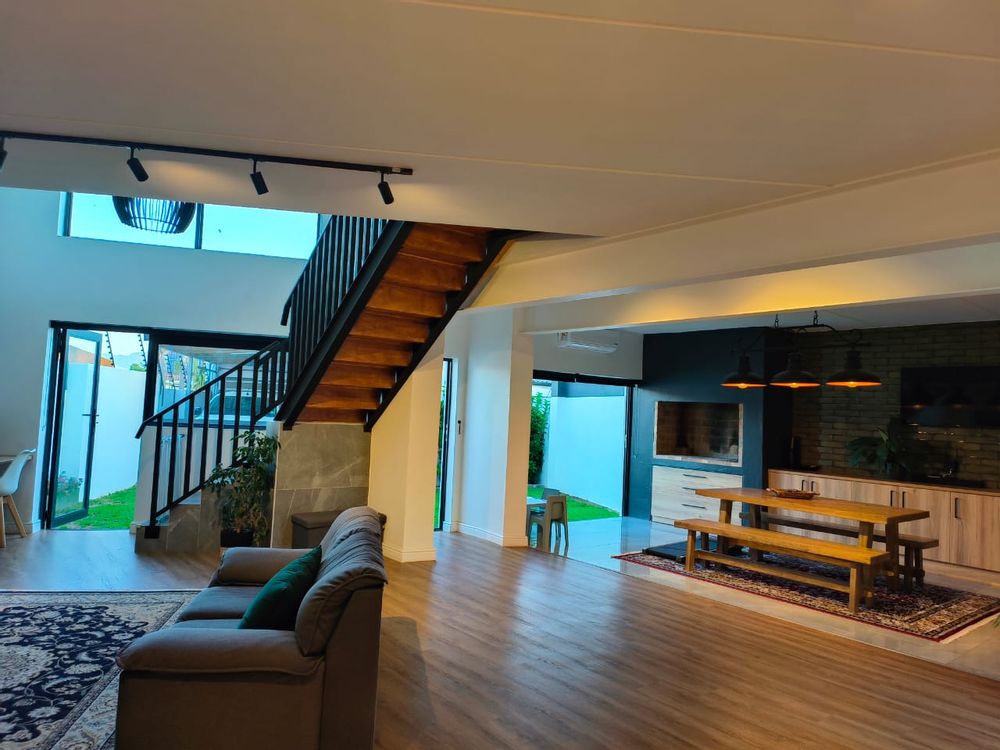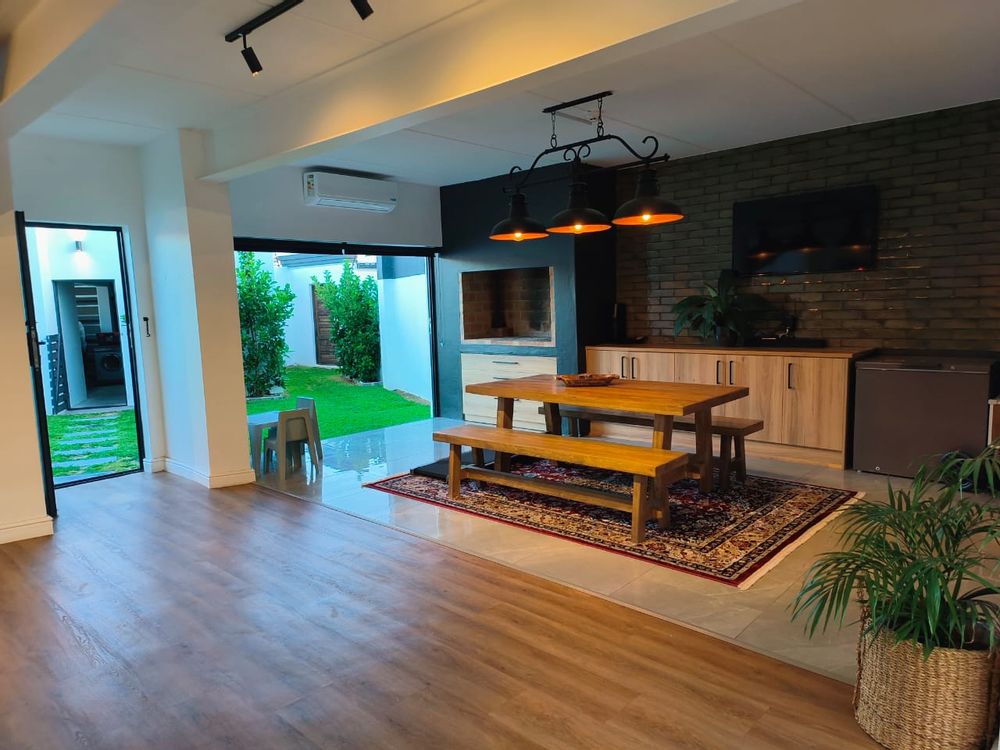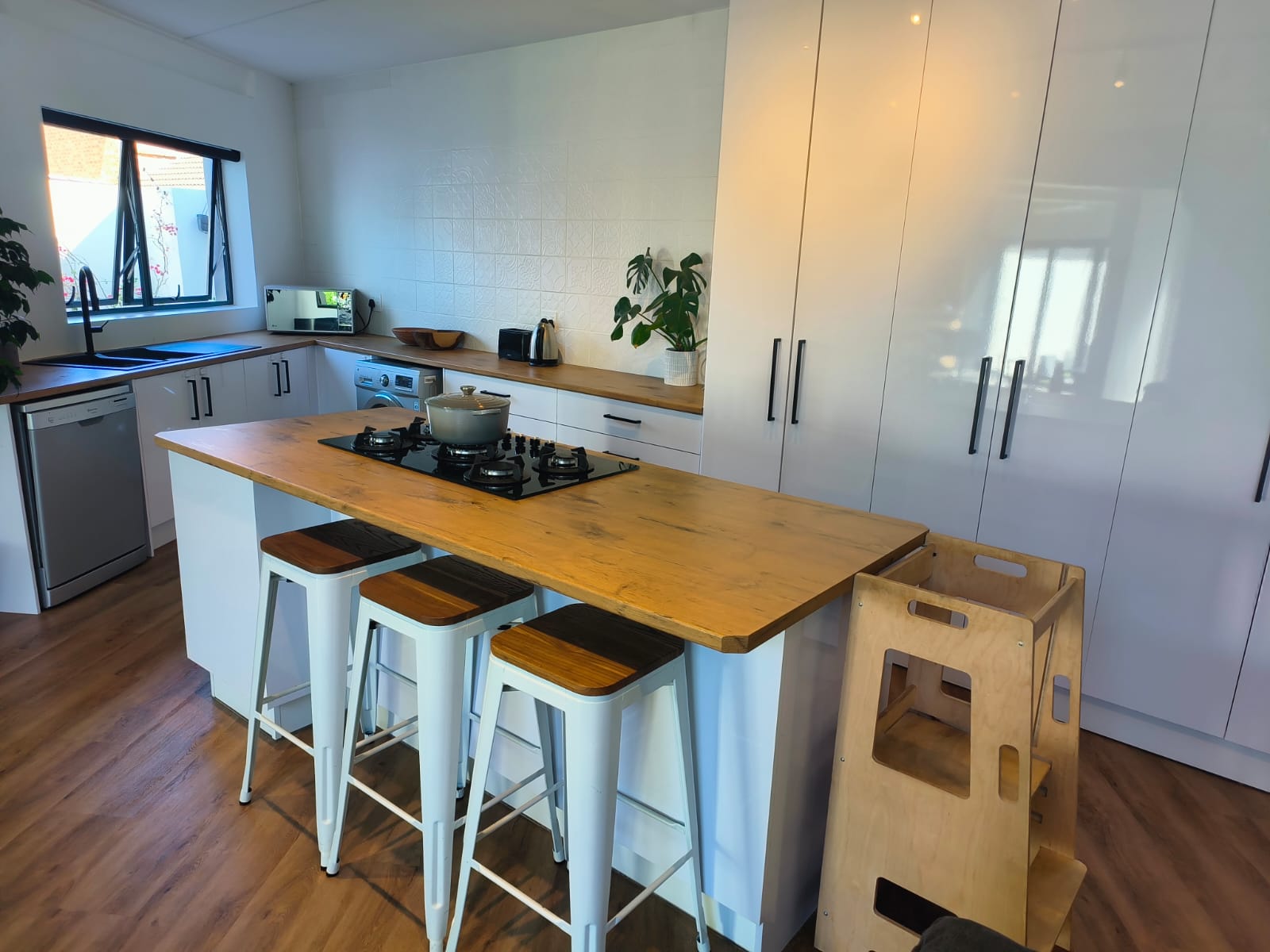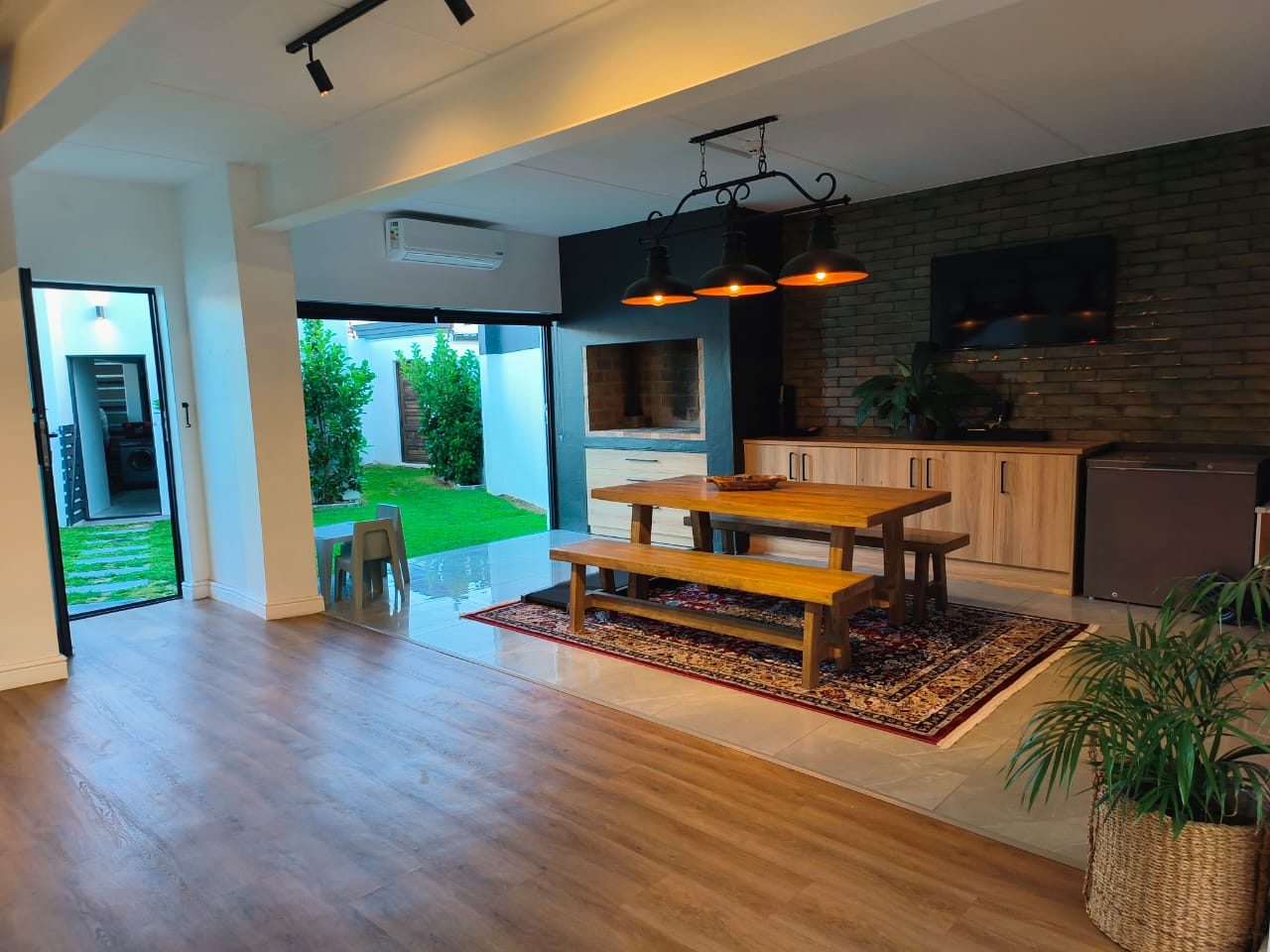 As you enter this beautifully designed home, you’re welcomed into a spacious open-plan kitchen, dining room, living room, and entertainment area, complete with an indoor braai. The living room also features a slow-combustion fireplace for added warmth during the winter months. The modern kitchen offers ample cupboard space, abundant work surfaces, and a gas stove—perfect for hassle-free cooking.