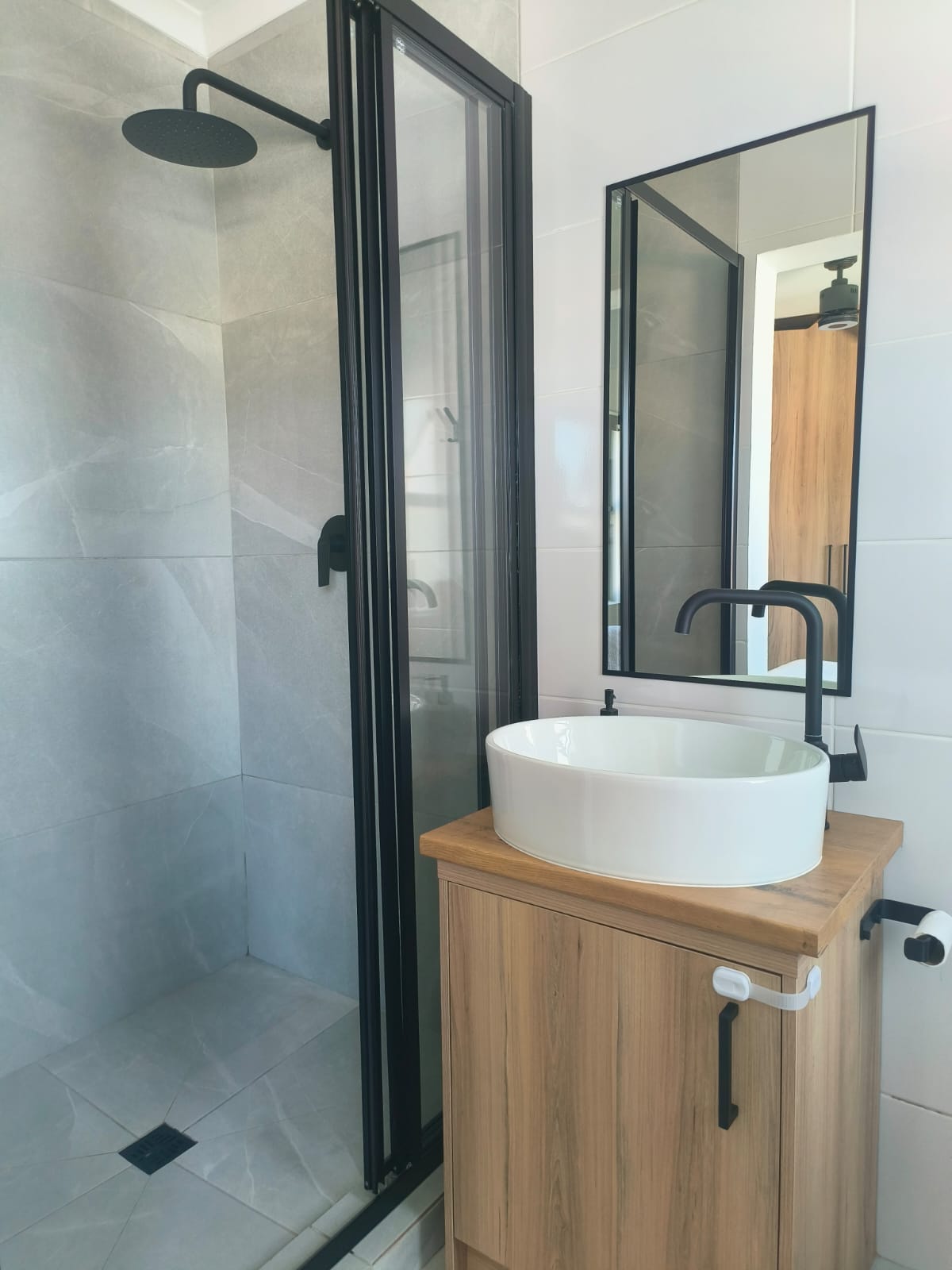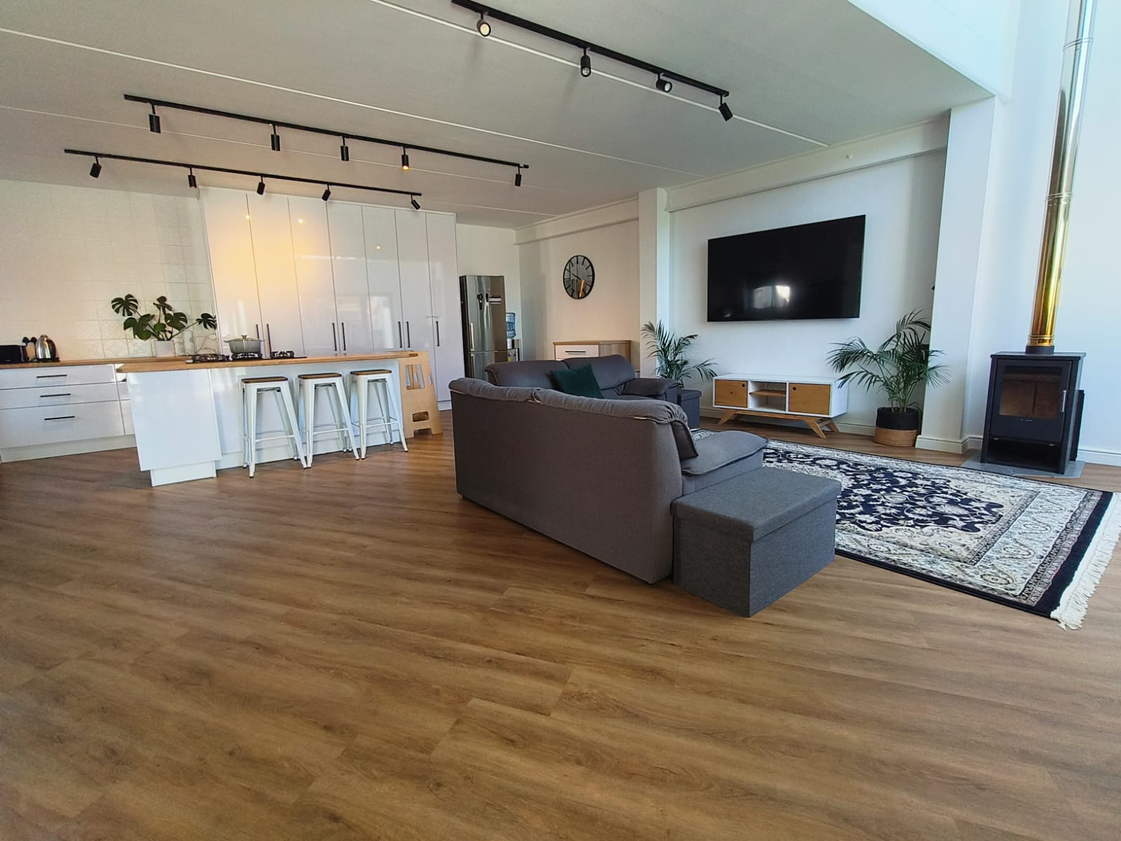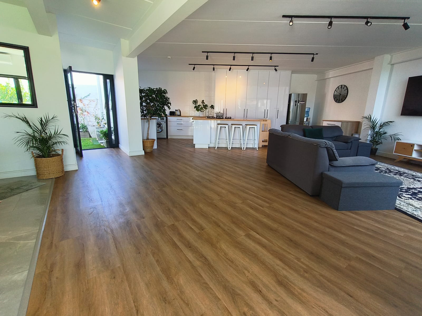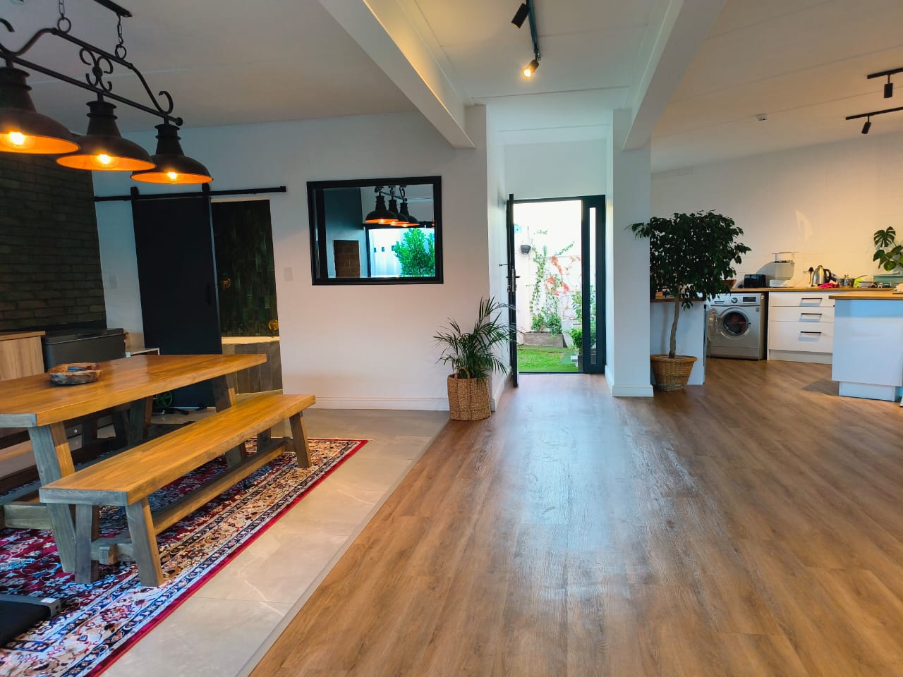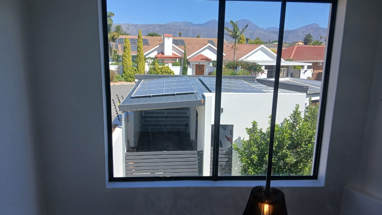 As you enter this beautifully designed home, you’re welcomed into a spacious open-plan kitchen, dining room, living room, and entertainment area, complete with an indoor braai. The living room also features a slow-combustion fireplace for added warmth during the winter months. The modern kitchen offers ample cupboard space, abundant work surfaces, and a gas stove—perfect for hassle-free cooking.