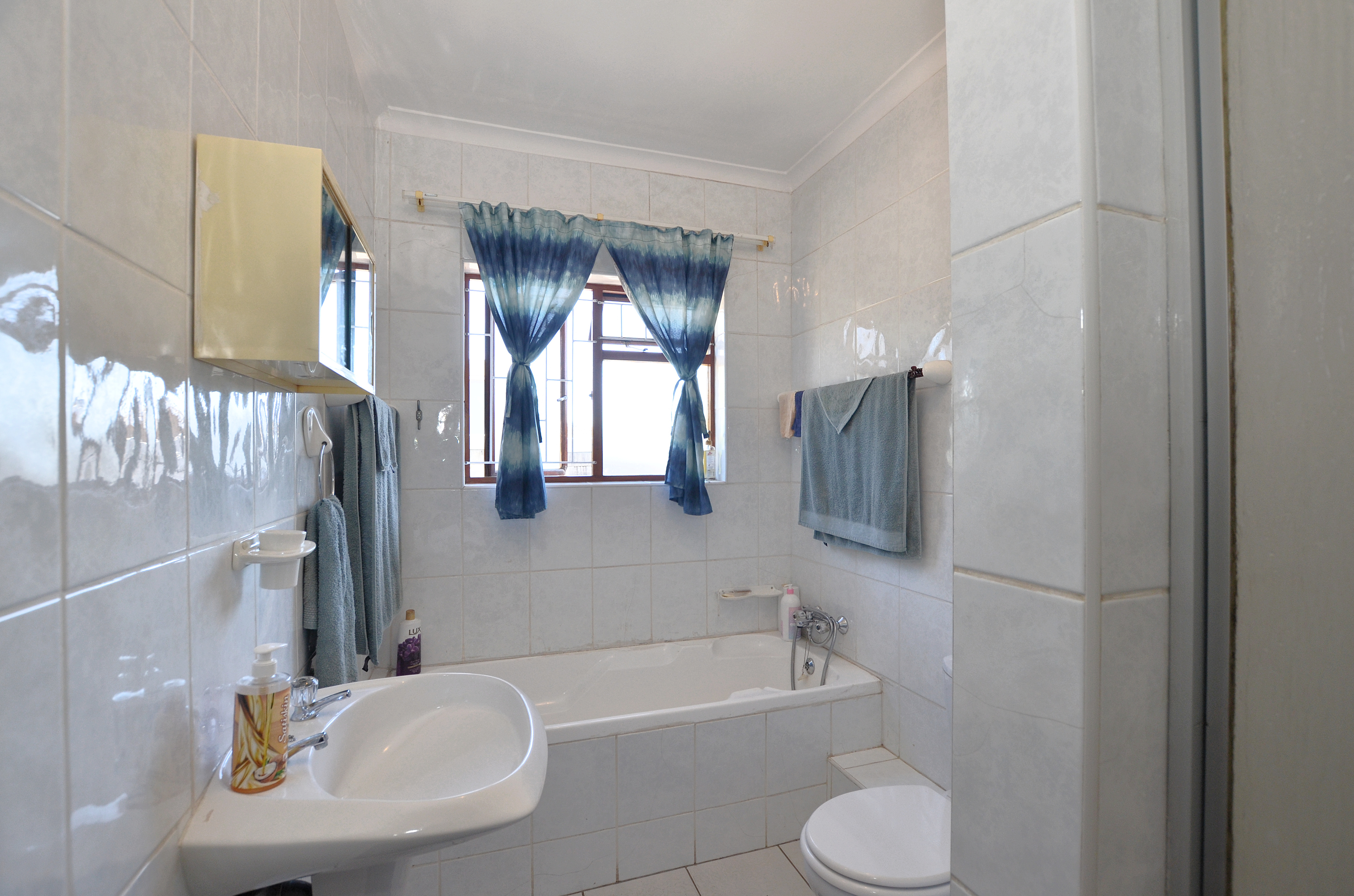 Two separate open-plan kitchens, each fitted with laminated cupboards and a breakfast nook, serve the home independently when the dual-unit configuration is in use. All four bedrooms have ample built-in cupboard space. Two full bathrooms serve this house for sale in Durbanville’s Goedemoed, with one bathroom en-suite.