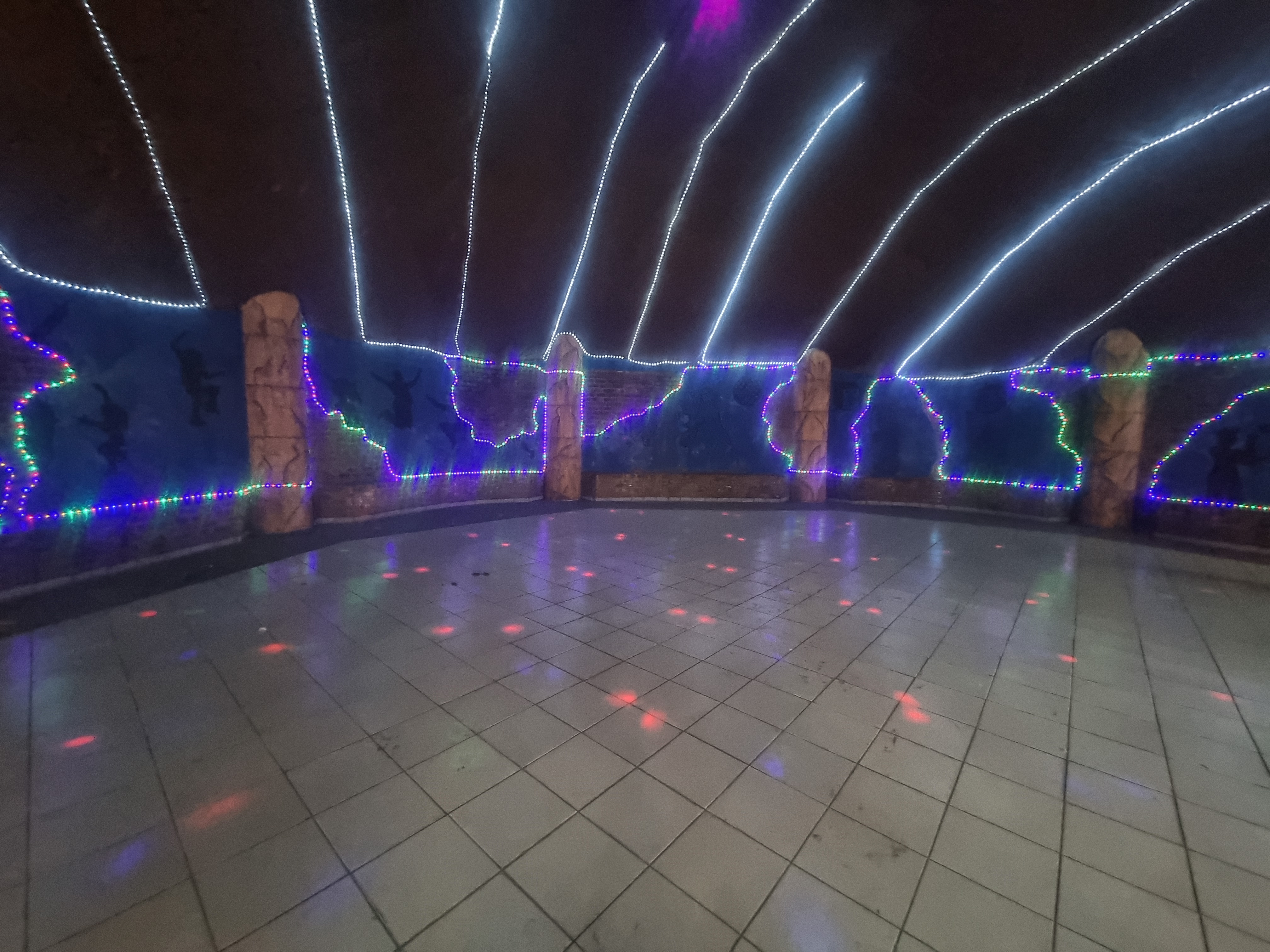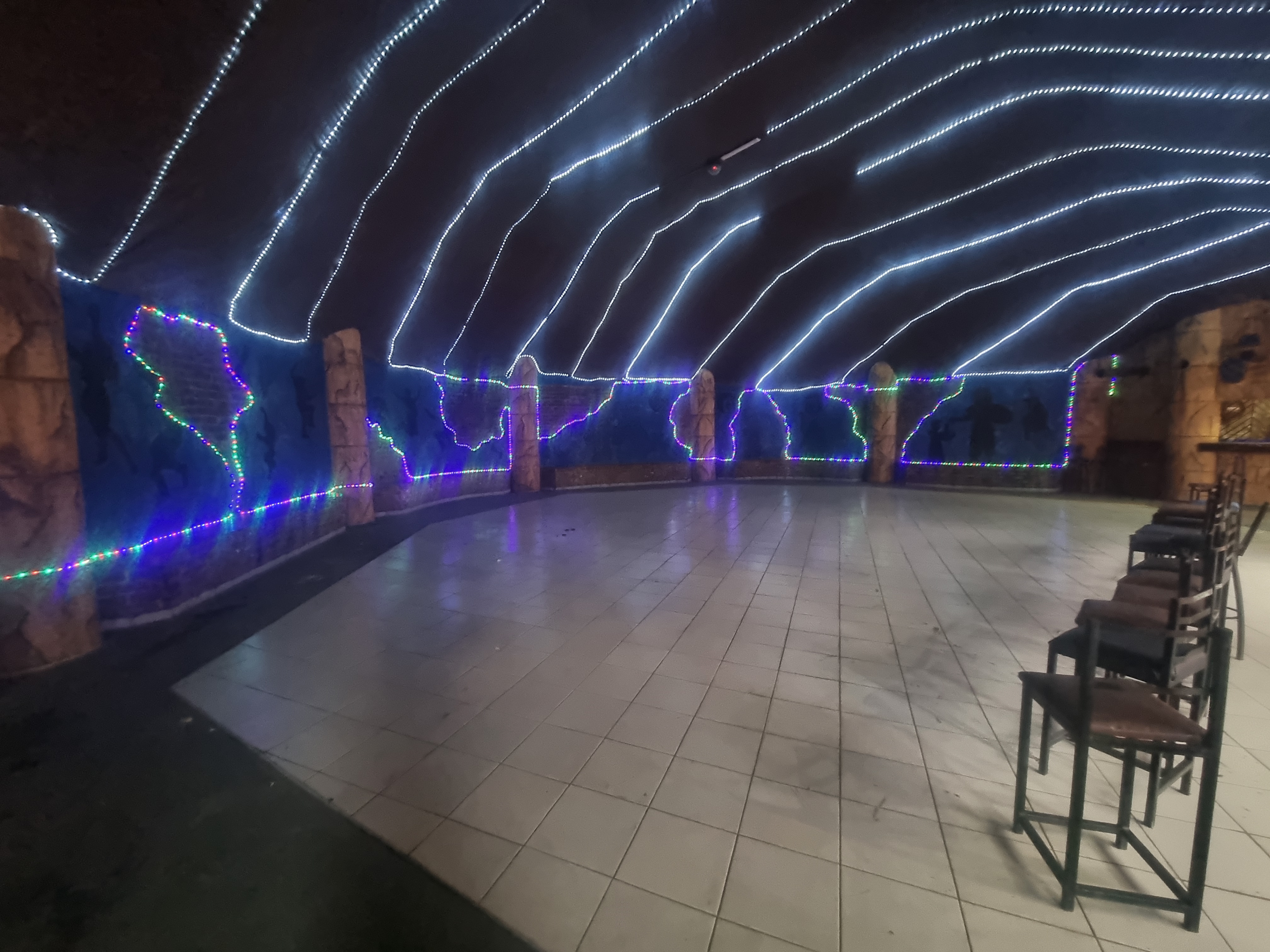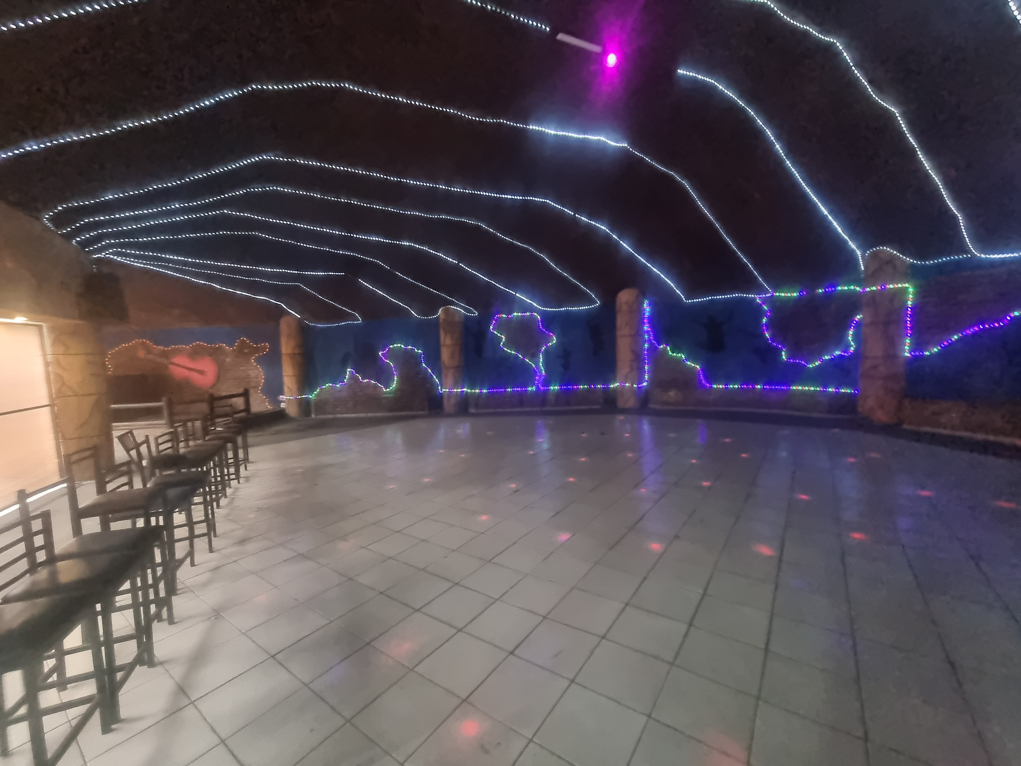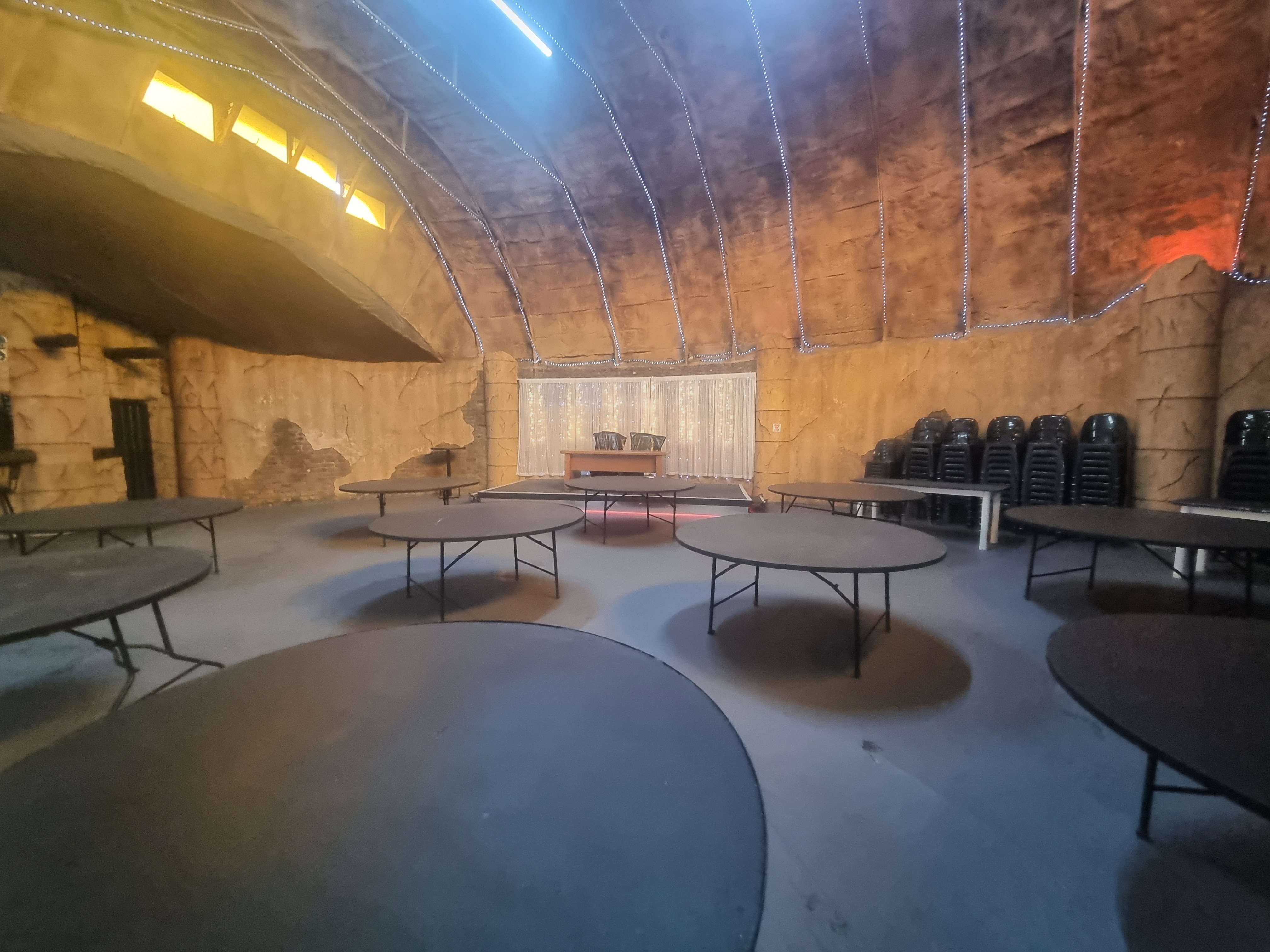 A reception area featuring a DJ booth and dance floor, complete with dining facilities, and a bar.