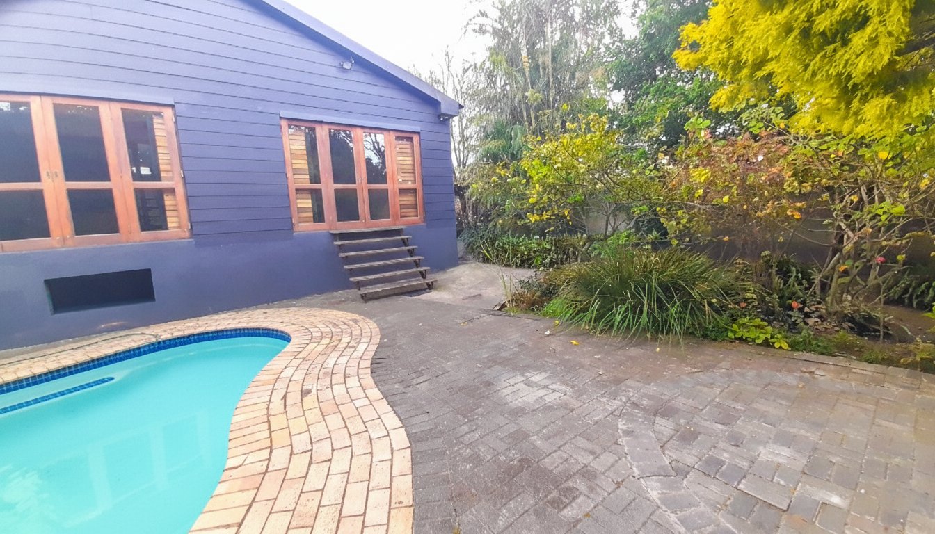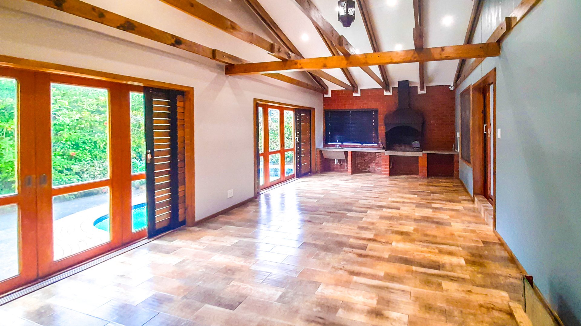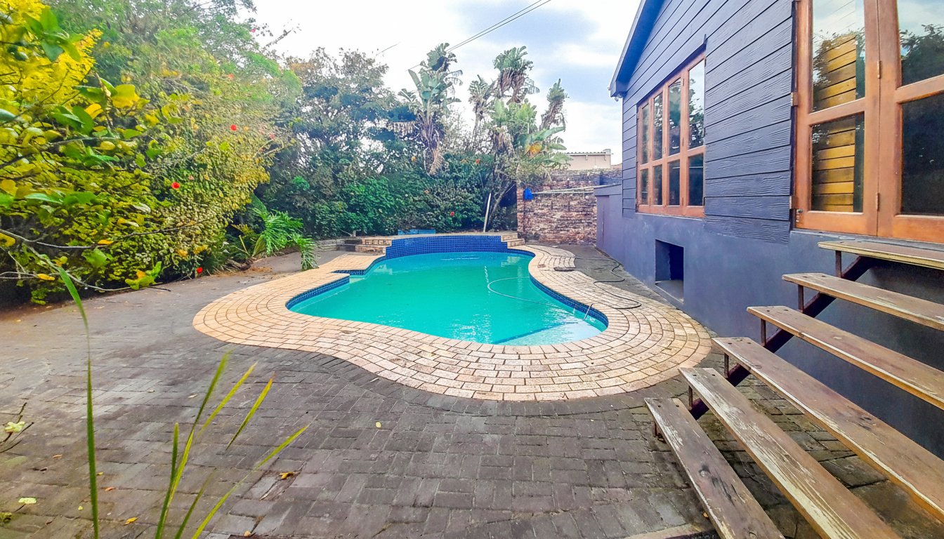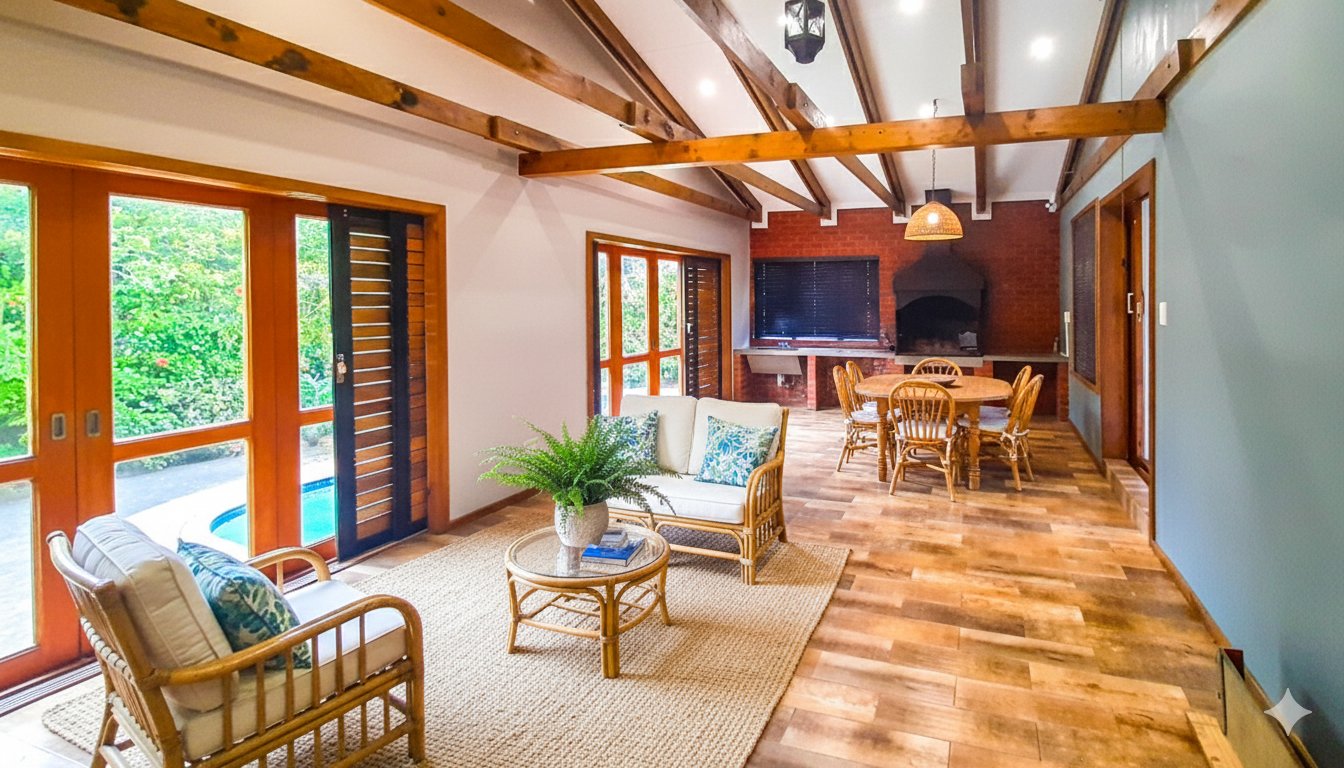 The entertainment lounge is pure magic: exposed trusses, built-in braai, and stack-away doors that open wide to reveal a backyard built for fun — sparkling pool and even a cricket practice net.