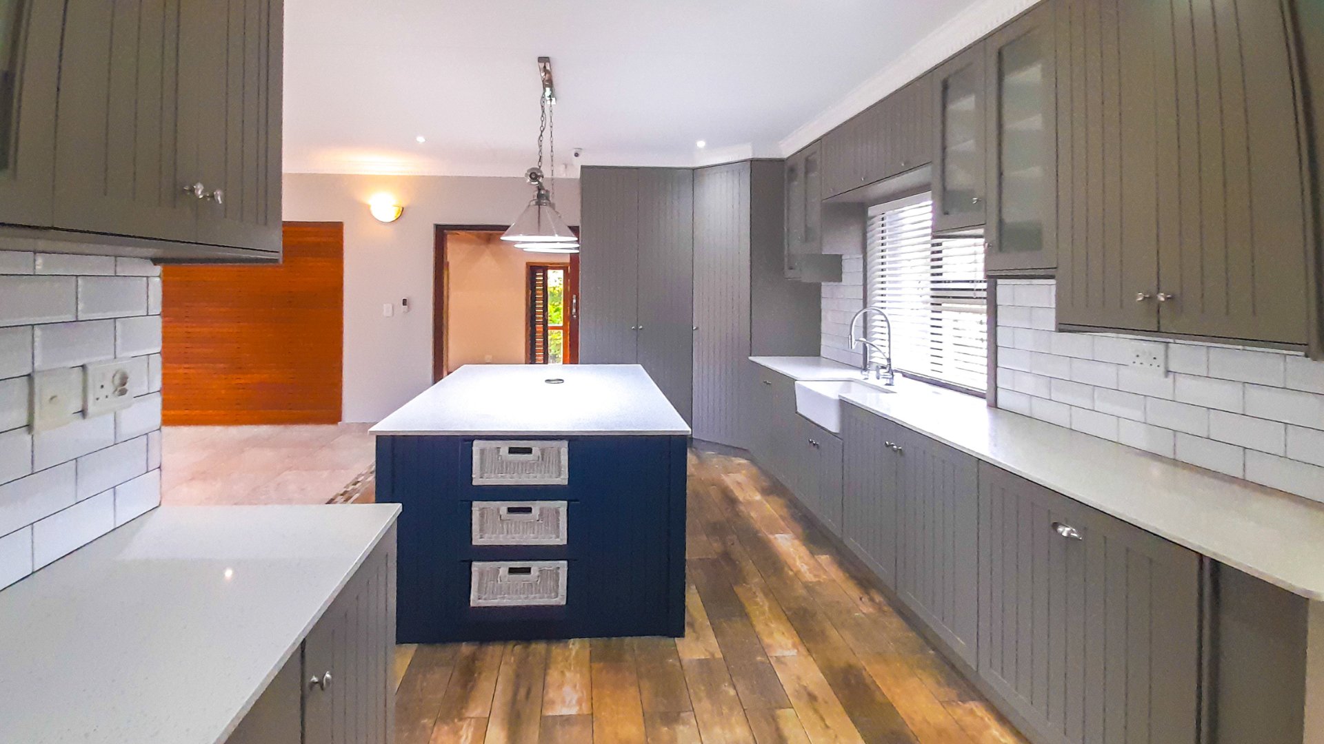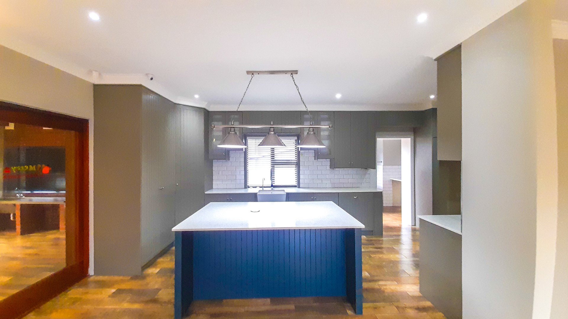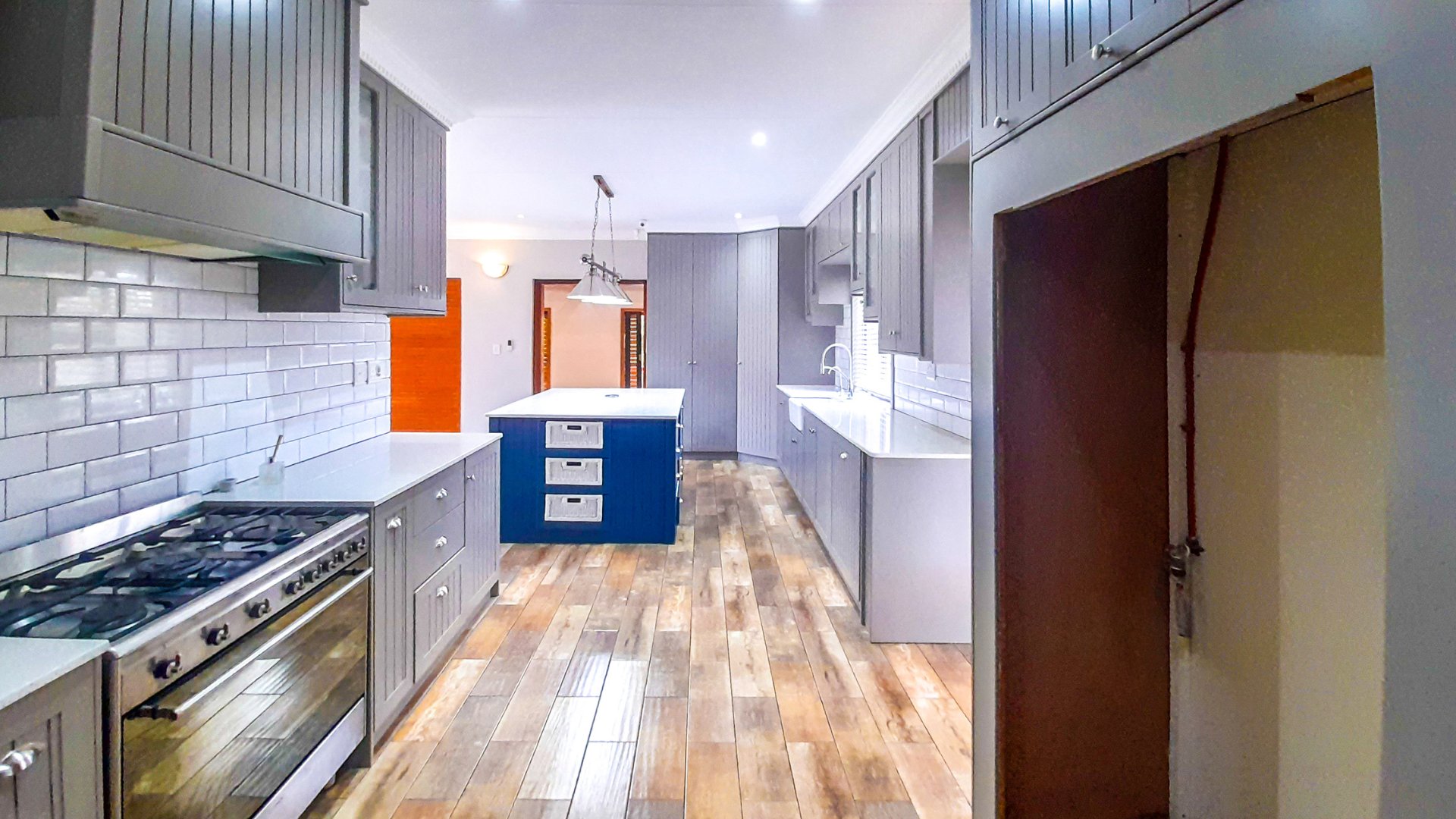 Step inside and you’ll immediately feel the difference. To the right, seamless access to the double garage. To the left, a lounge so expansive it feels ballroom-sized, anchored by a striking wooden feature wall. The kitchen is a showstopper — quartz counters, centre island, large gas hob, under-counter oven, extractor, and storage everywhere you look. A scullery keeps appliances tucked away and flows to a private deck with its own office space.