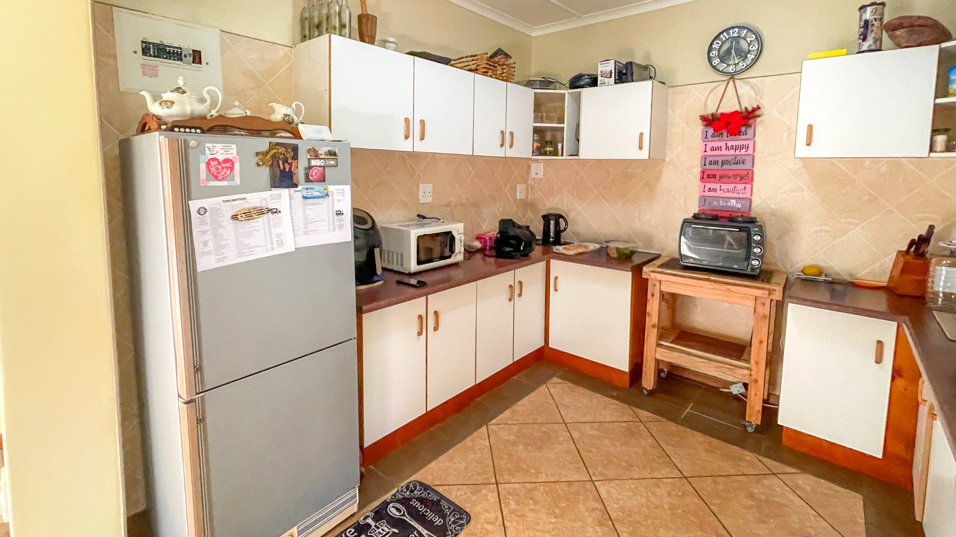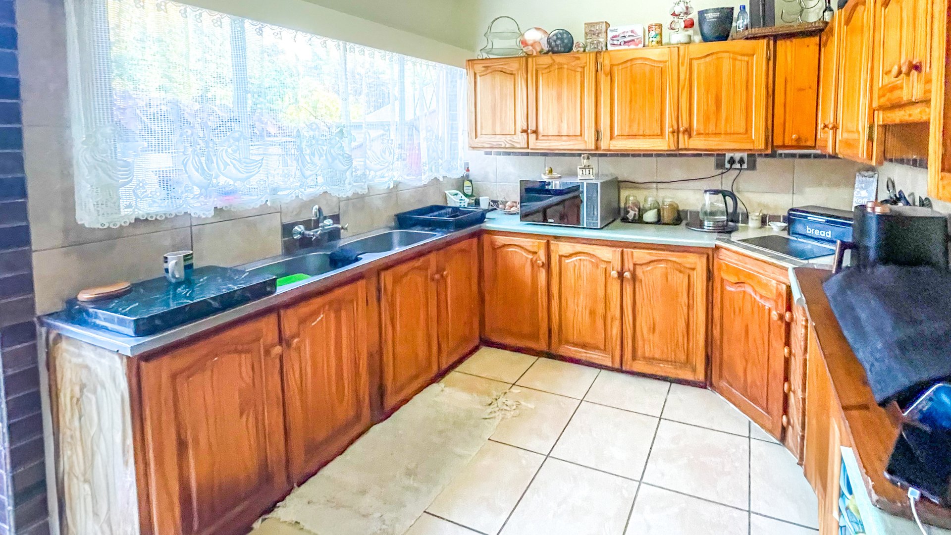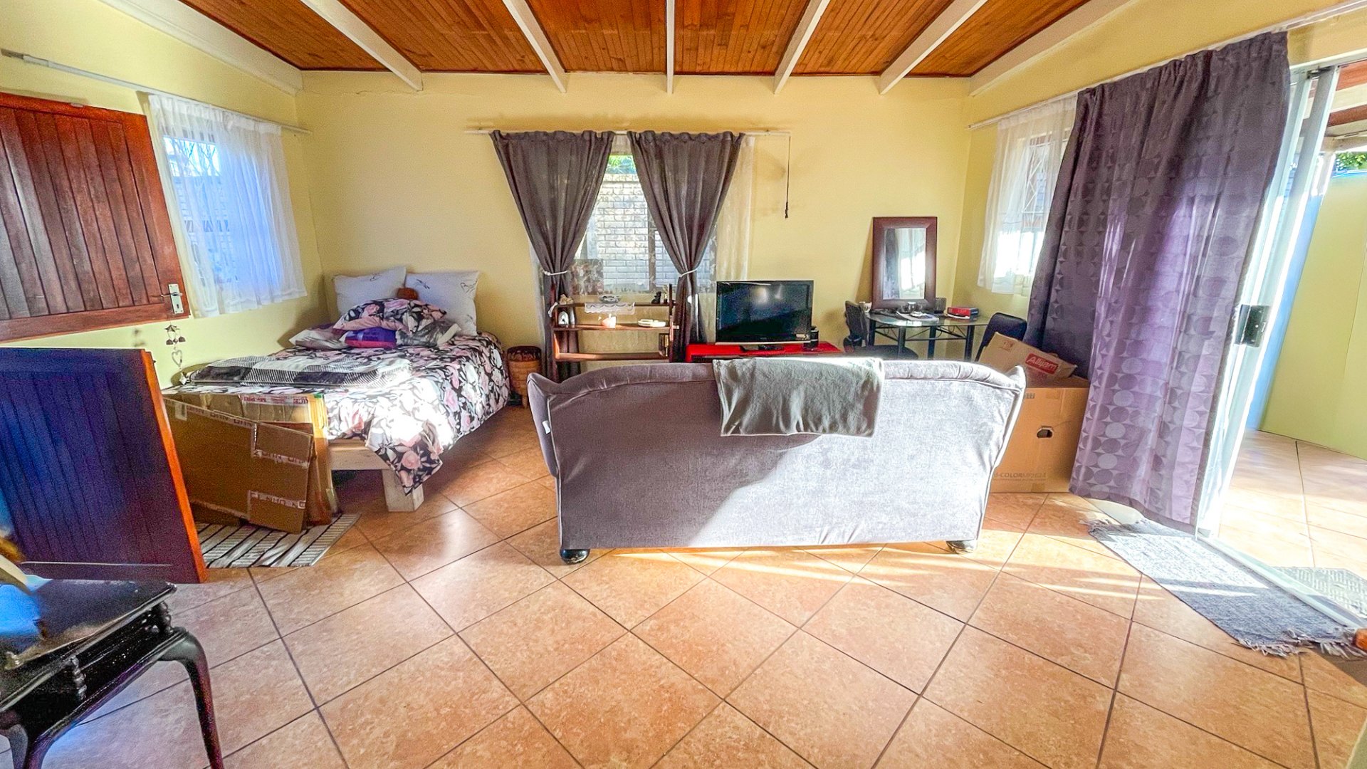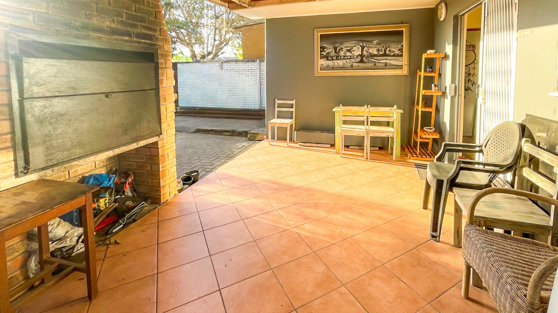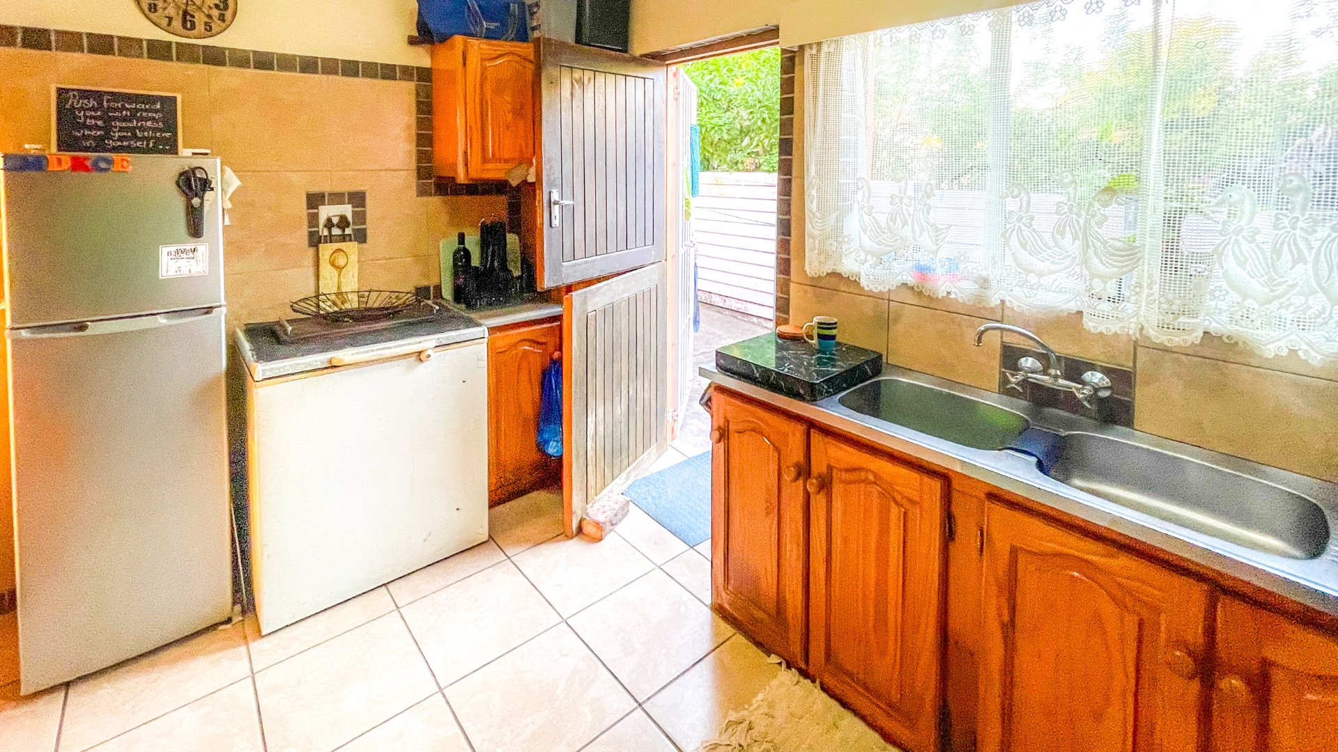 The main house is a spacious older home with three large bedrooms, a full family bathroom (plus en suite), and a generous lounge-dining combo that opens via sliders to a covered patio with built-in braai — perfect for anytime entertaining. The kitchen is fully fitted with space for a double-door fridge and double sink, ready for your own stove. It’s a home with heart, and a little TLC will go a long way in bringing out its full charm.