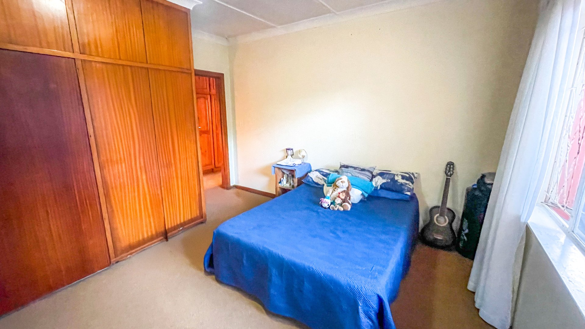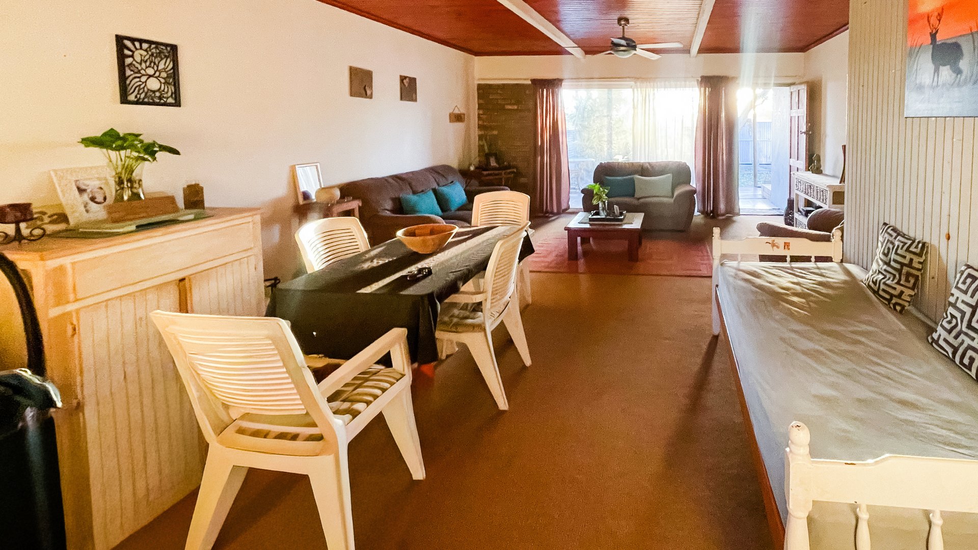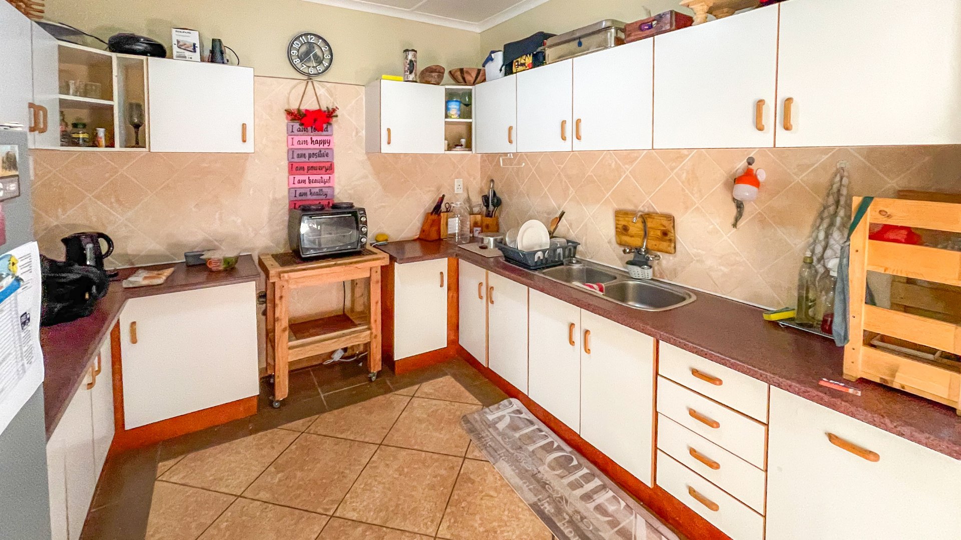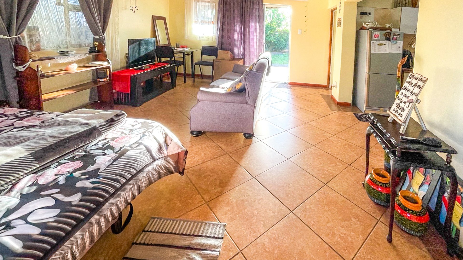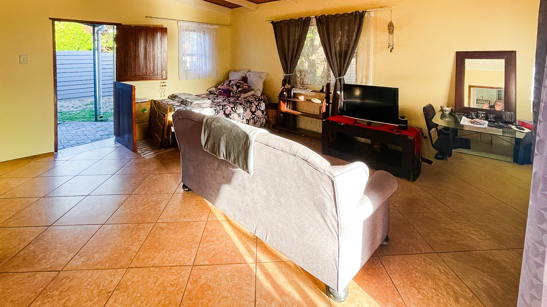 The main house is a spacious older home with three large bedrooms, a full family bathroom (plus en suite), and a generous lounge-dining combo that opens via sliders to a covered patio with built-in braai — perfect for anytime entertaining. The kitchen is fully fitted with space for a double-door fridge and double sink, ready for your own stove. It’s a home with heart, and a little TLC will go a long way in bringing out its full charm.