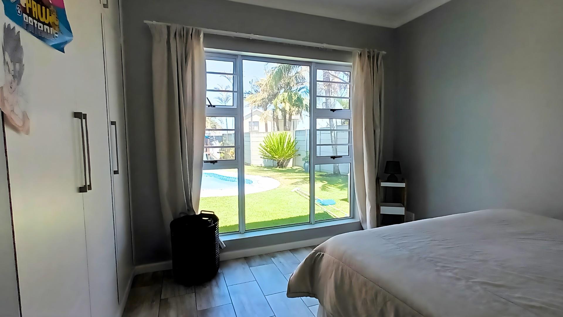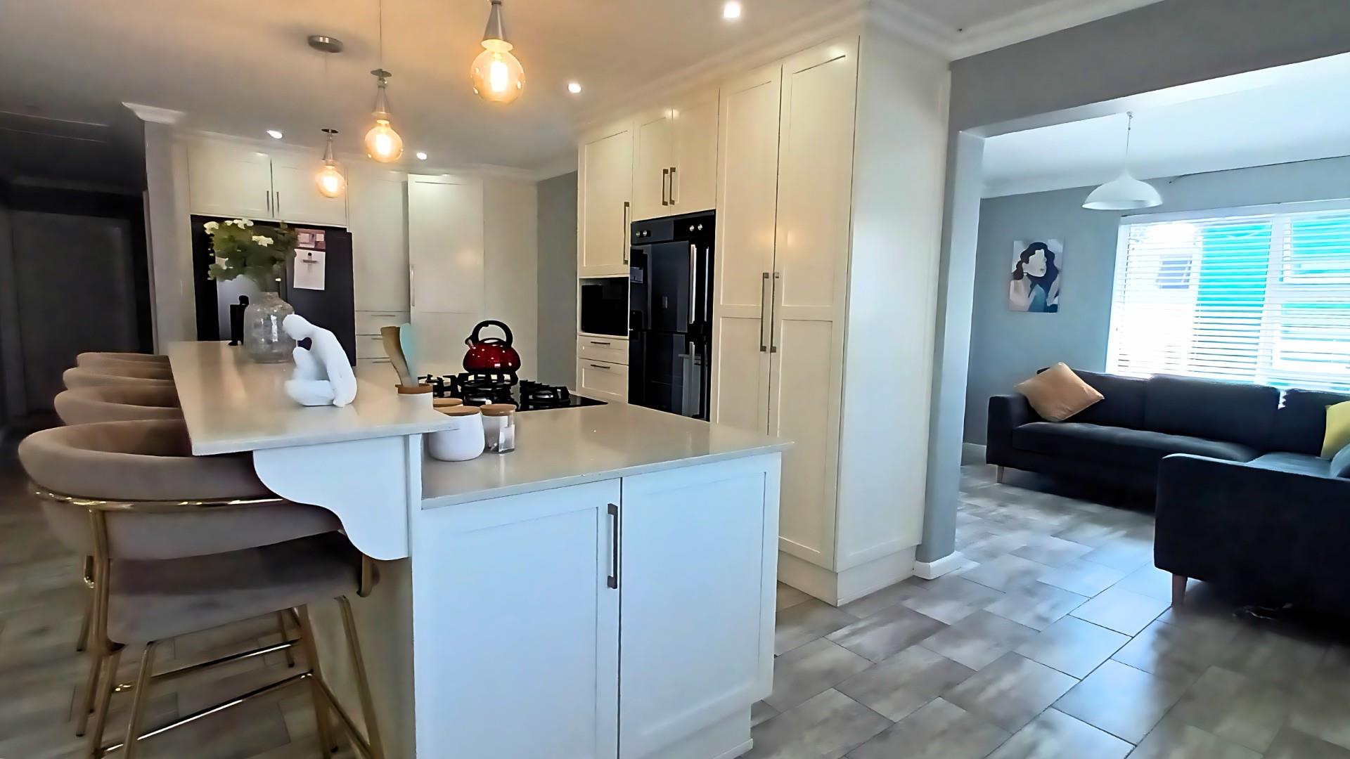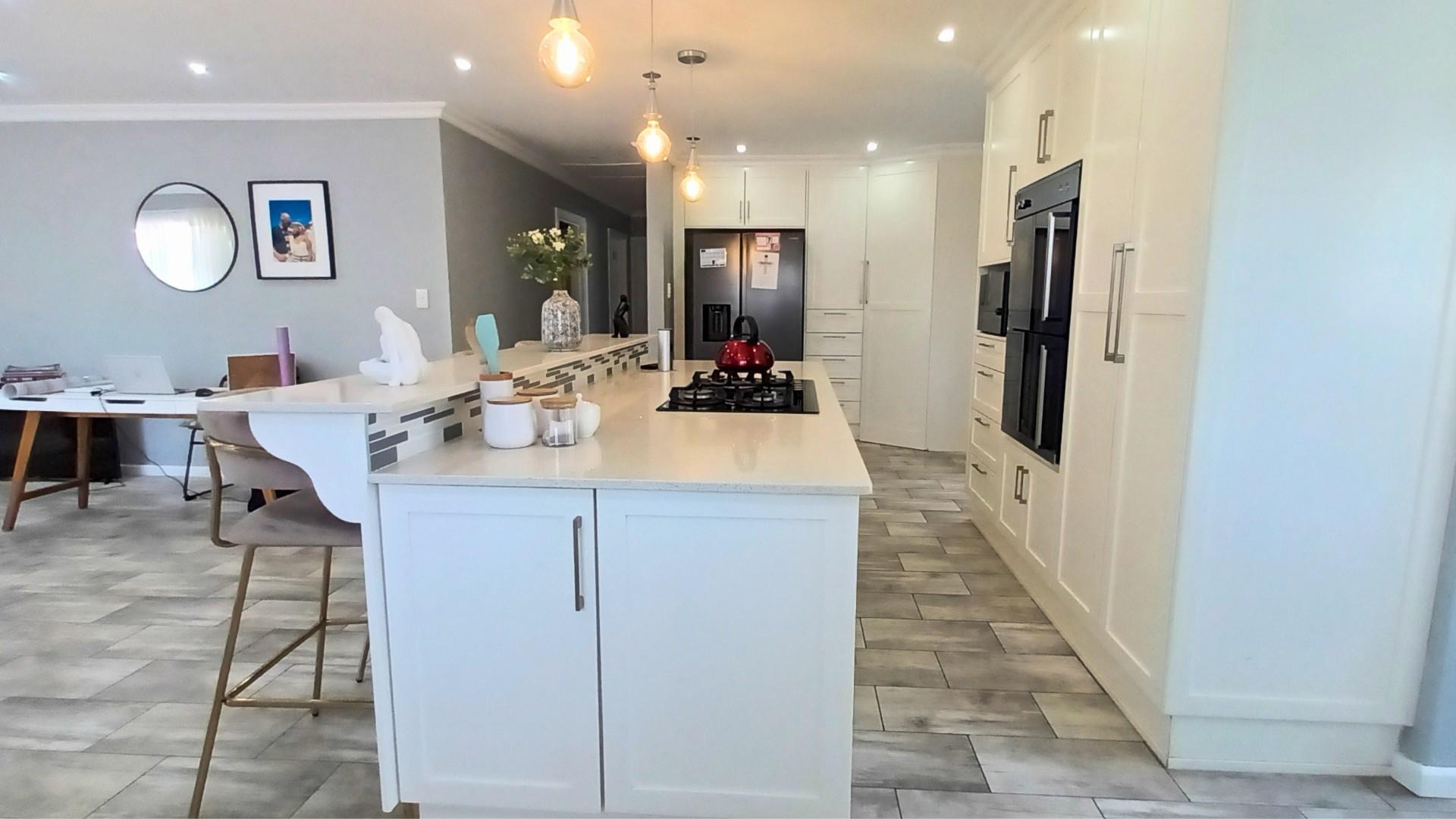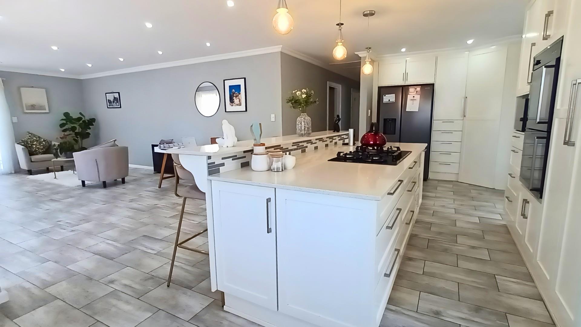 The heart of the home is a stunning open-plan kitchen with a breakfast counter where the family can gather. It’s beautifully fitted with an eye-level oven, gas hob, and separate scullery — ideal for anyone who loves to cook and entertain. The living area flows effortlessly from the kitchen to the lounge and out through patio doors to the pool and braai area, creating the perfect space for relaxed coastal living.