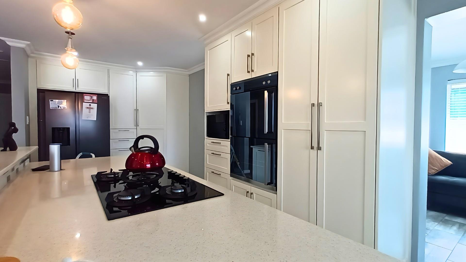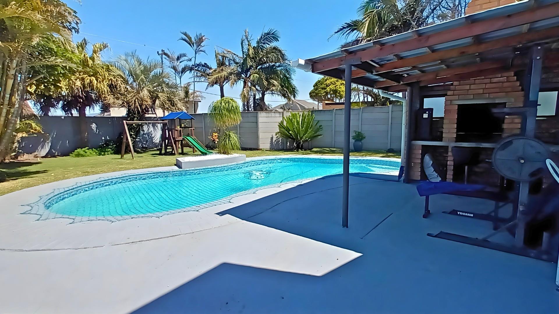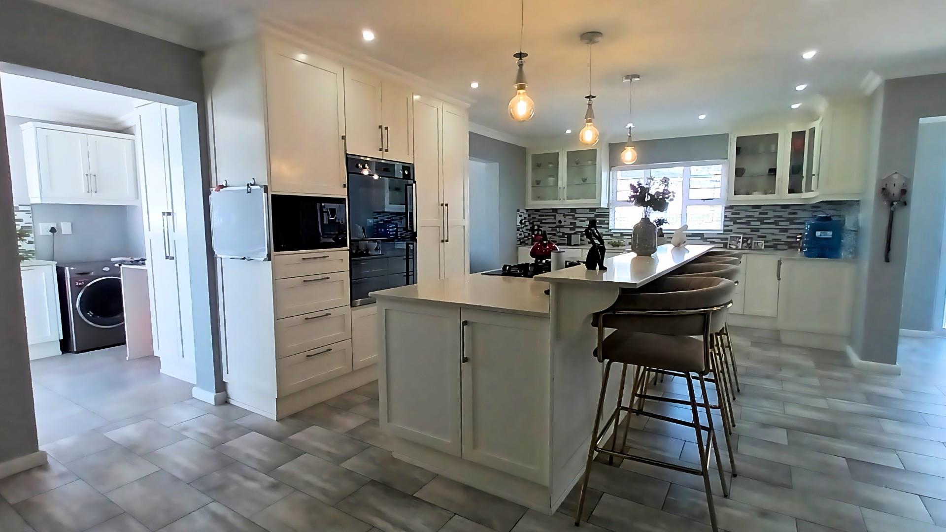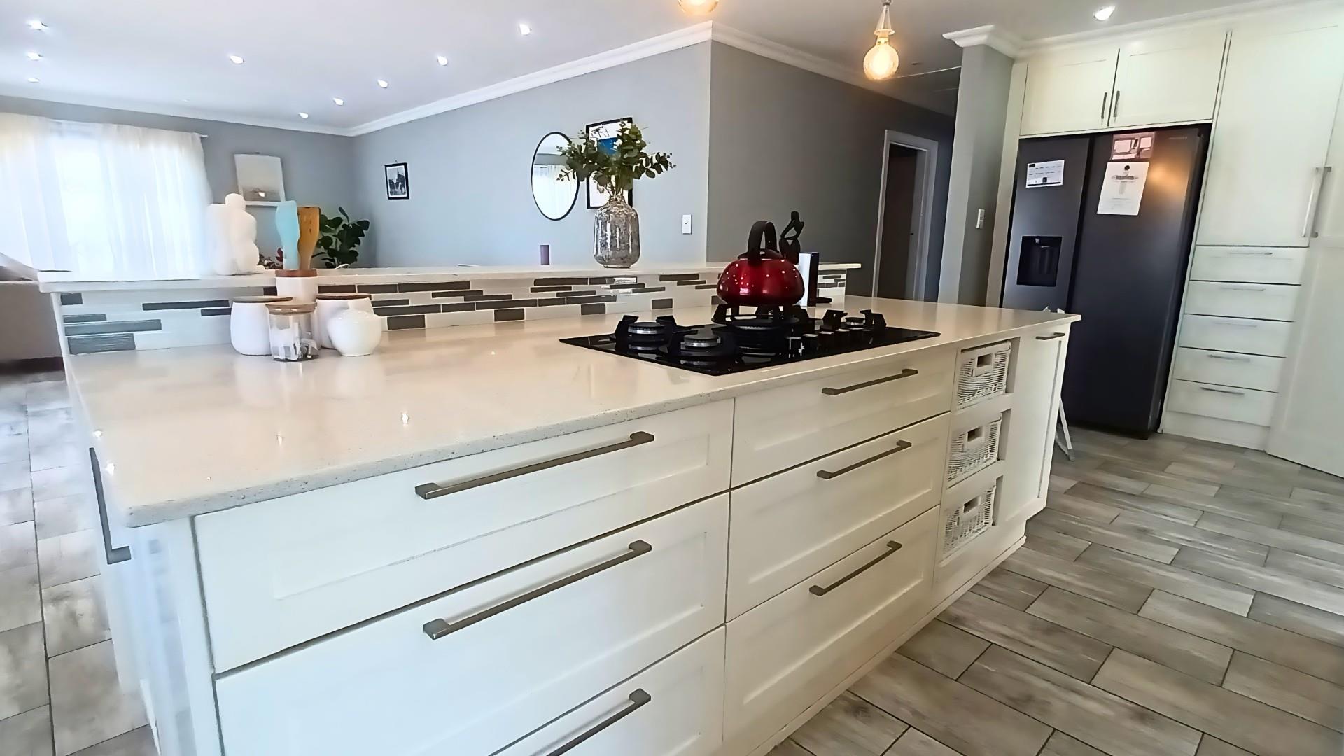 The heart of the home is a stunning open-plan kitchen with a breakfast counter where the family can gather. It’s beautifully fitted with an eye-level oven, gas hob, and separate scullery — ideal for anyone who loves to cook and entertain. The living area flows effortlessly from the kitchen to the lounge and out through patio doors to the pool and braai area, creating the perfect space for relaxed coastal living.