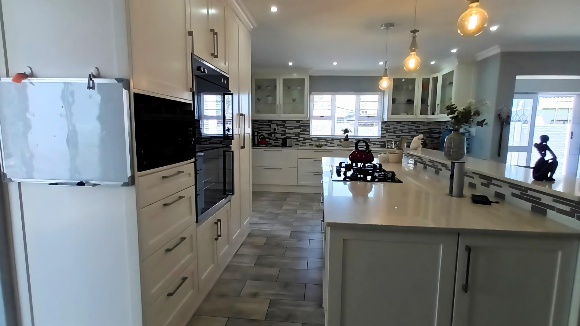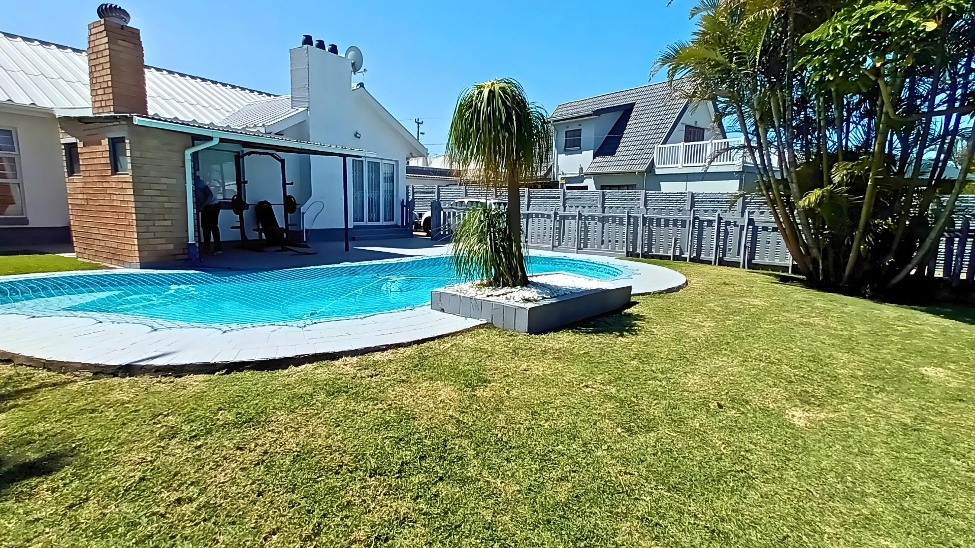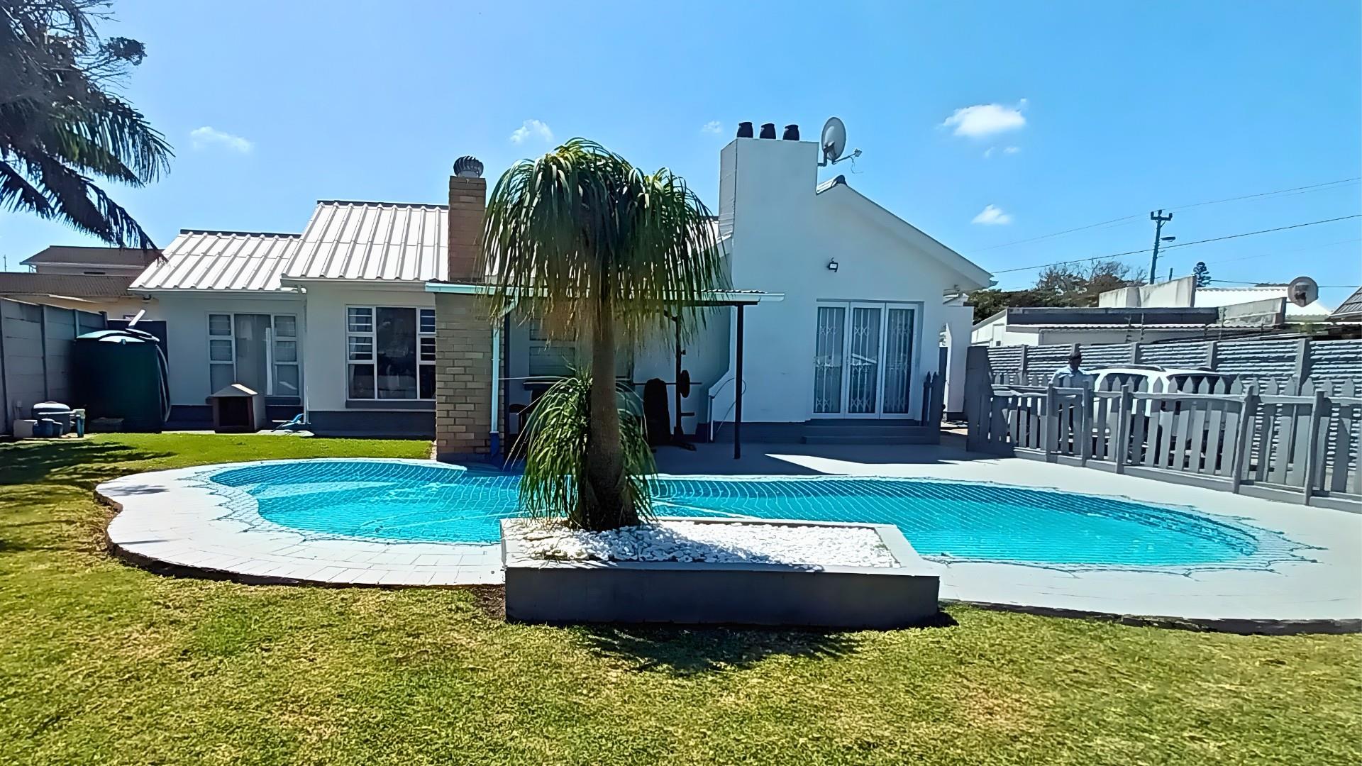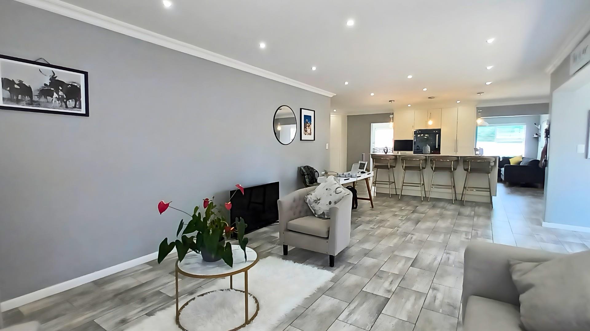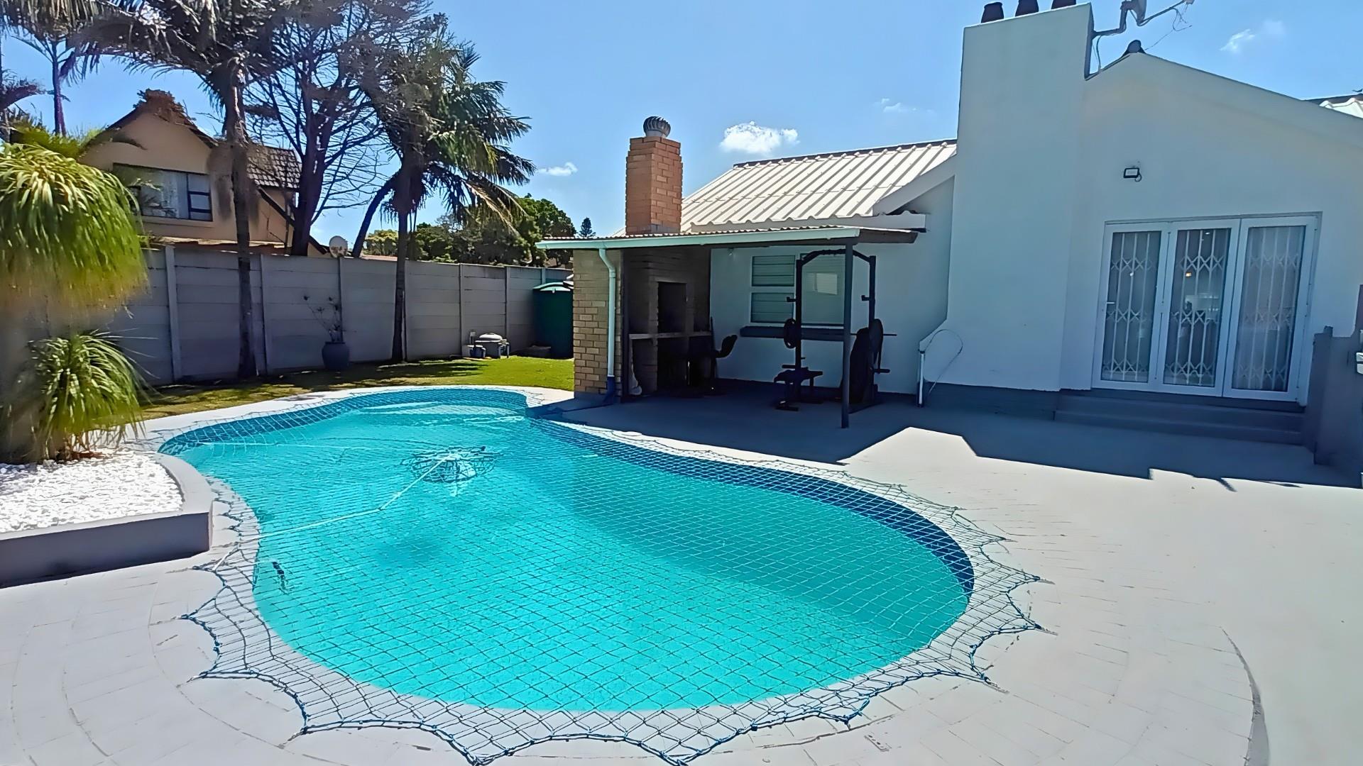 The heart of the home is a stunning open-plan kitchen with a breakfast counter where the family can gather. It’s beautifully fitted with an eye-level oven, gas hob, and separate scullery — ideal for anyone who loves to cook and entertain. The living area flows effortlessly from the kitchen to the lounge and out through patio doors to the pool and braai area, creating the perfect space for relaxed coastal living.