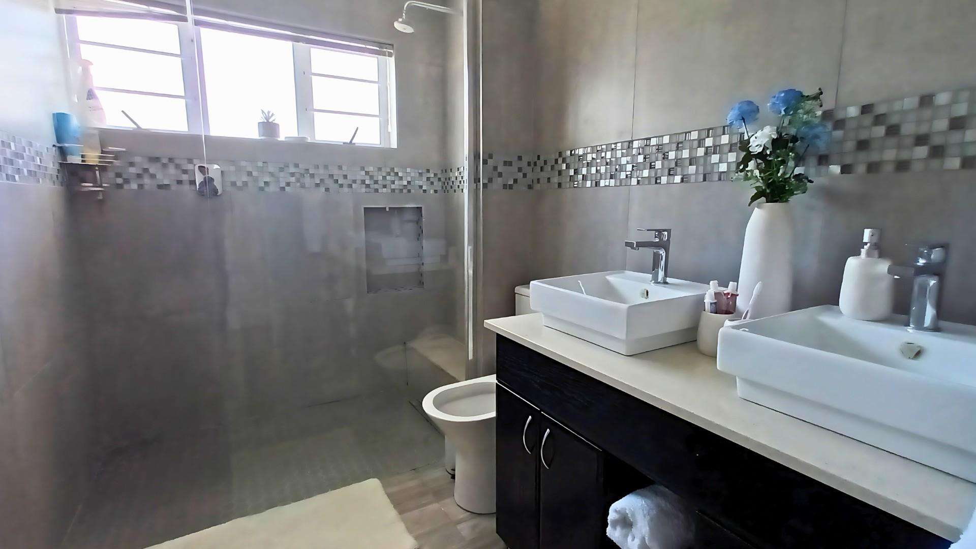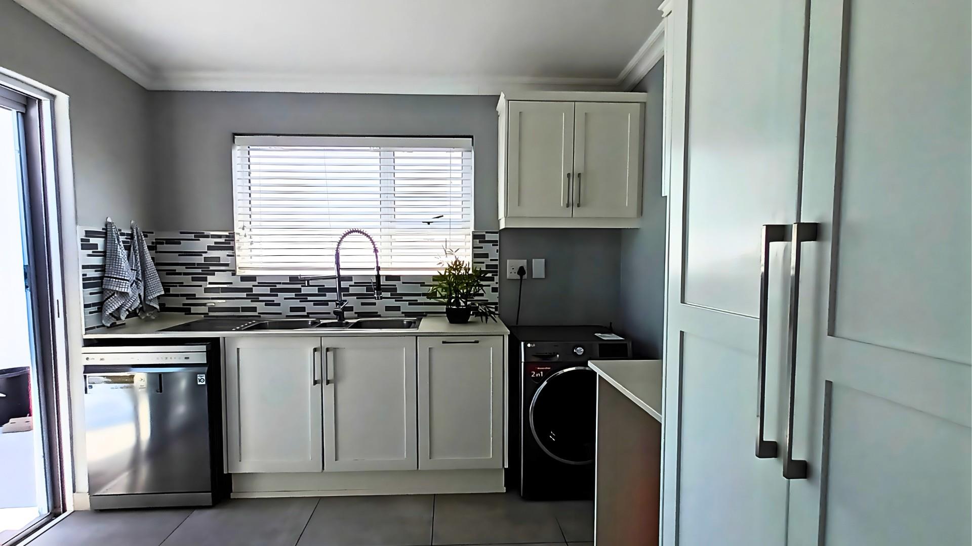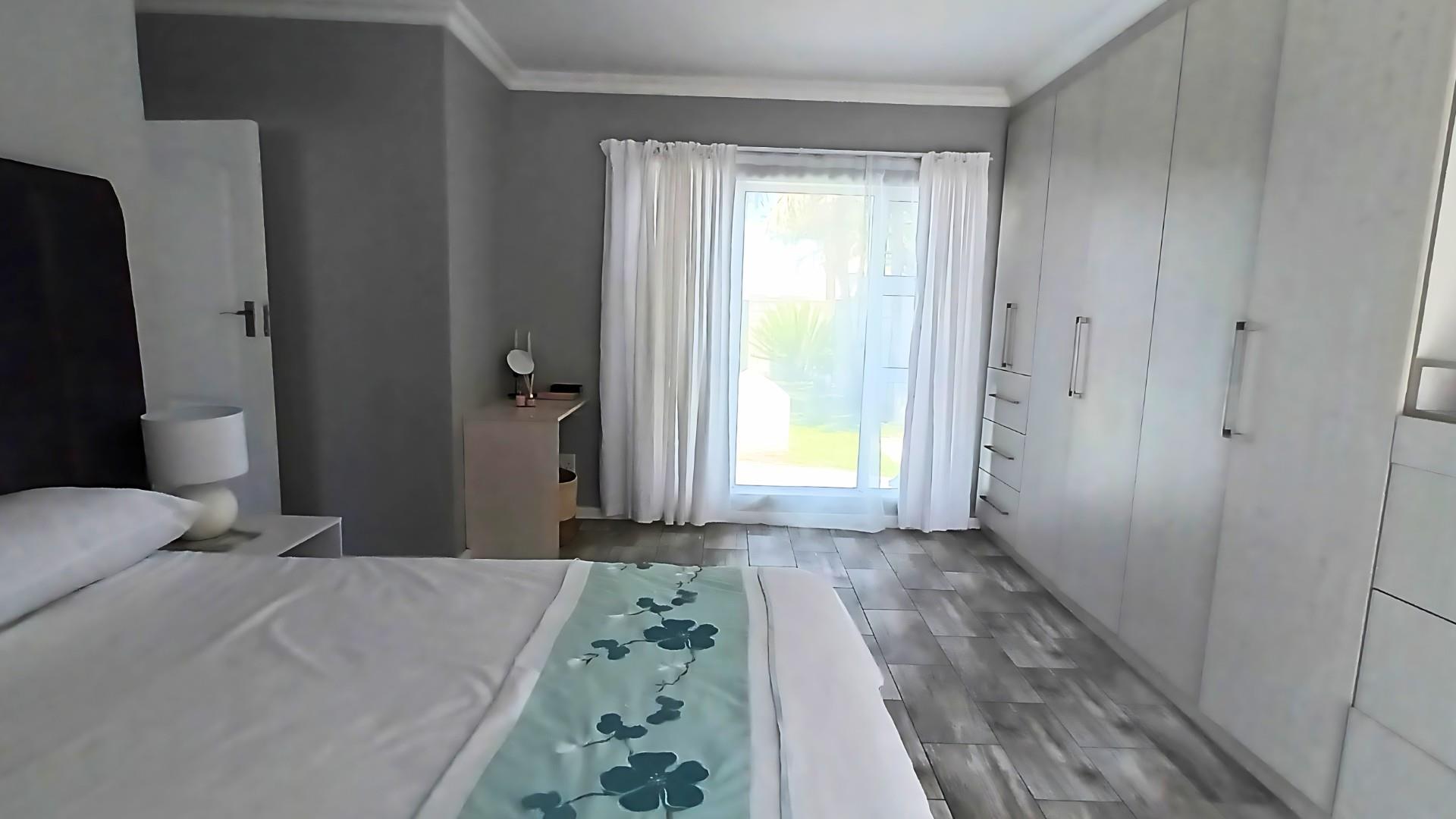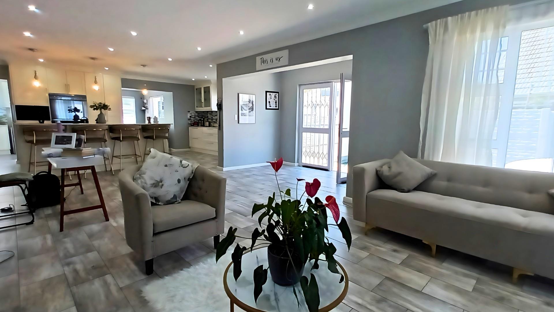 The heart of the home is a stunning open-plan kitchen with a breakfast counter where the family can gather. It’s beautifully fitted with an eye-level oven, gas hob, and separate scullery — ideal for anyone who loves to cook and entertain. The living area flows effortlessly from the kitchen to the lounge and out through patio doors to the pool and braai area, creating the perfect space for relaxed coastal living.