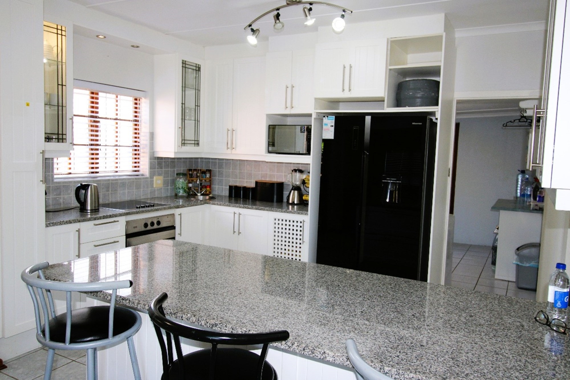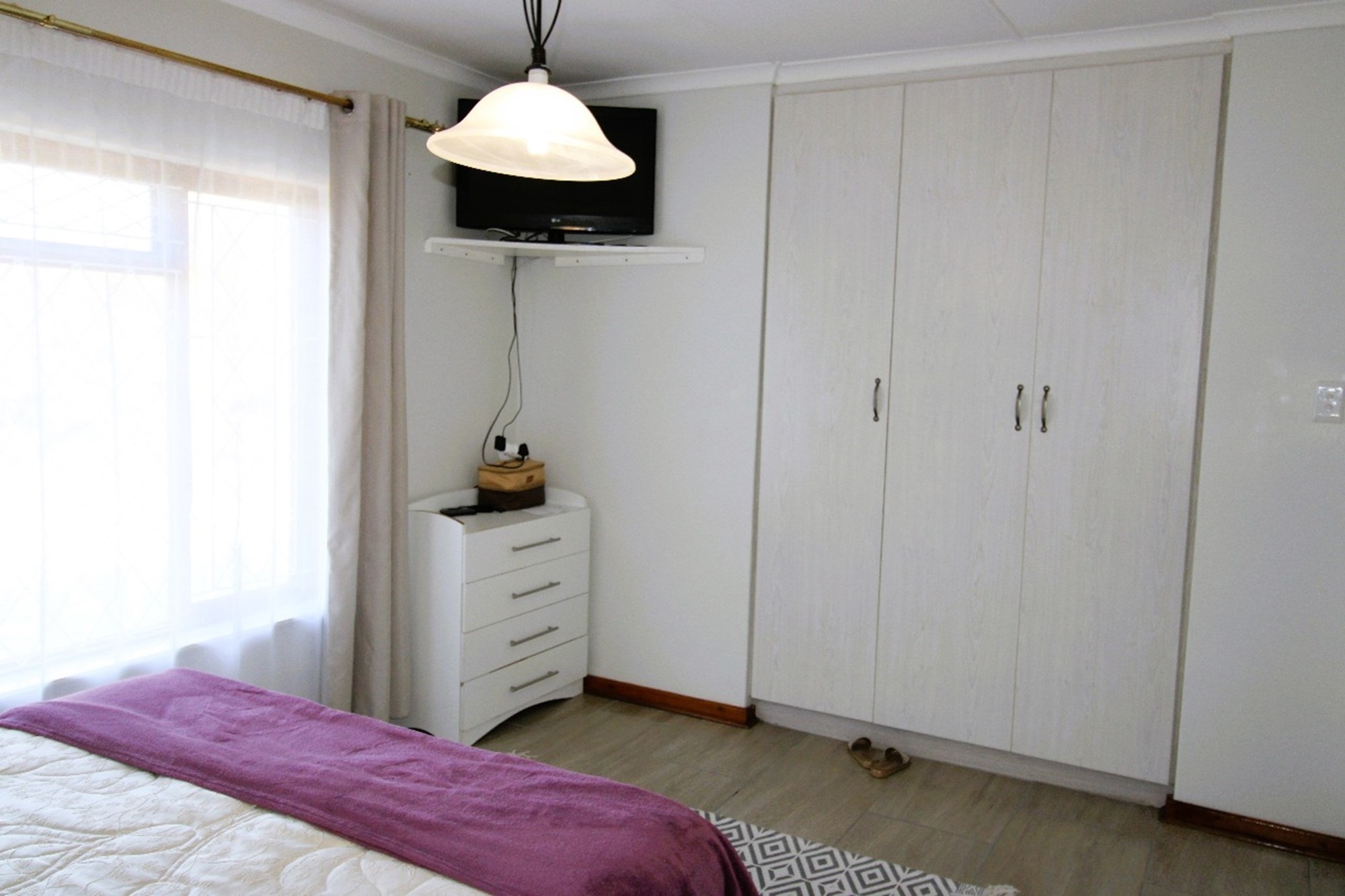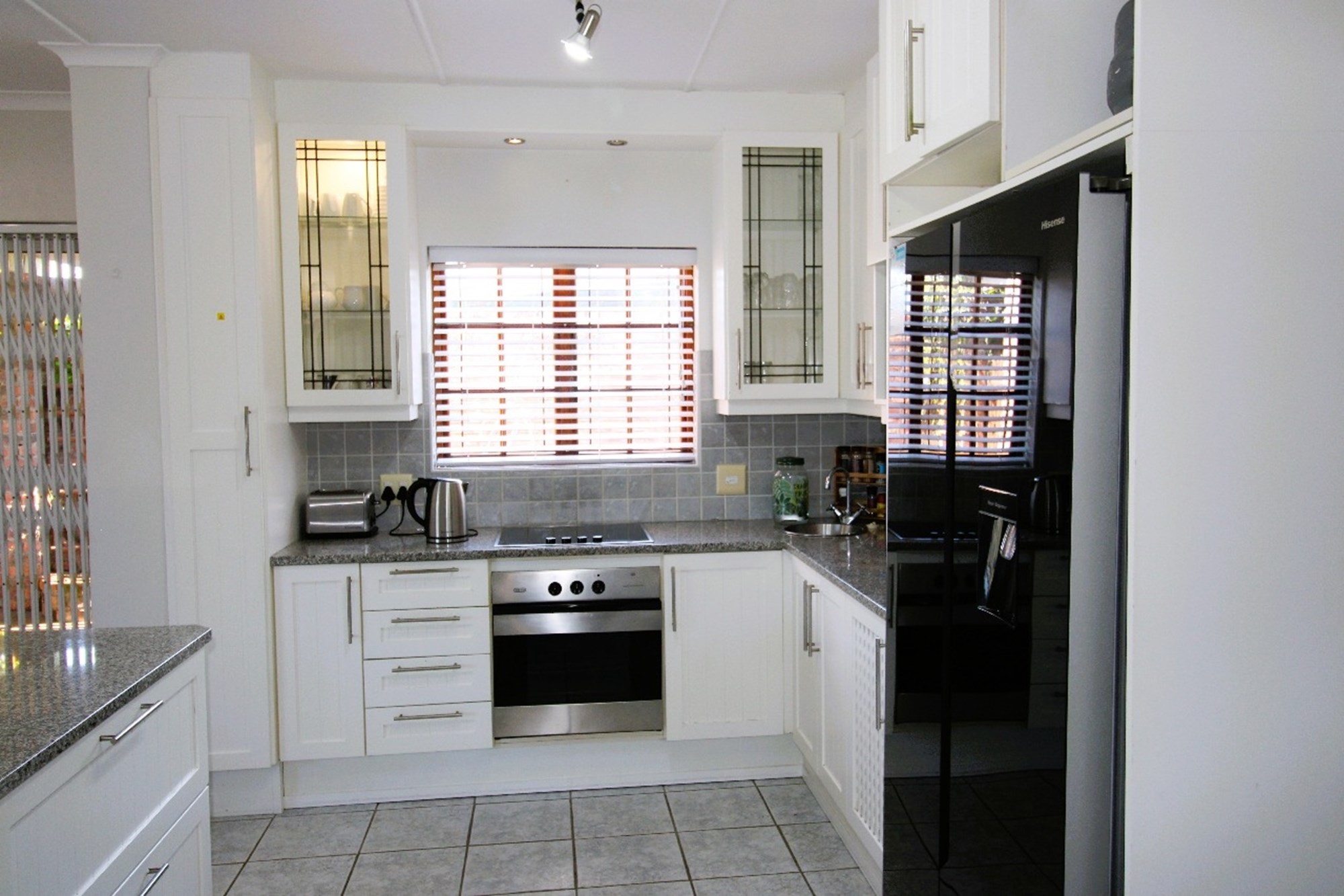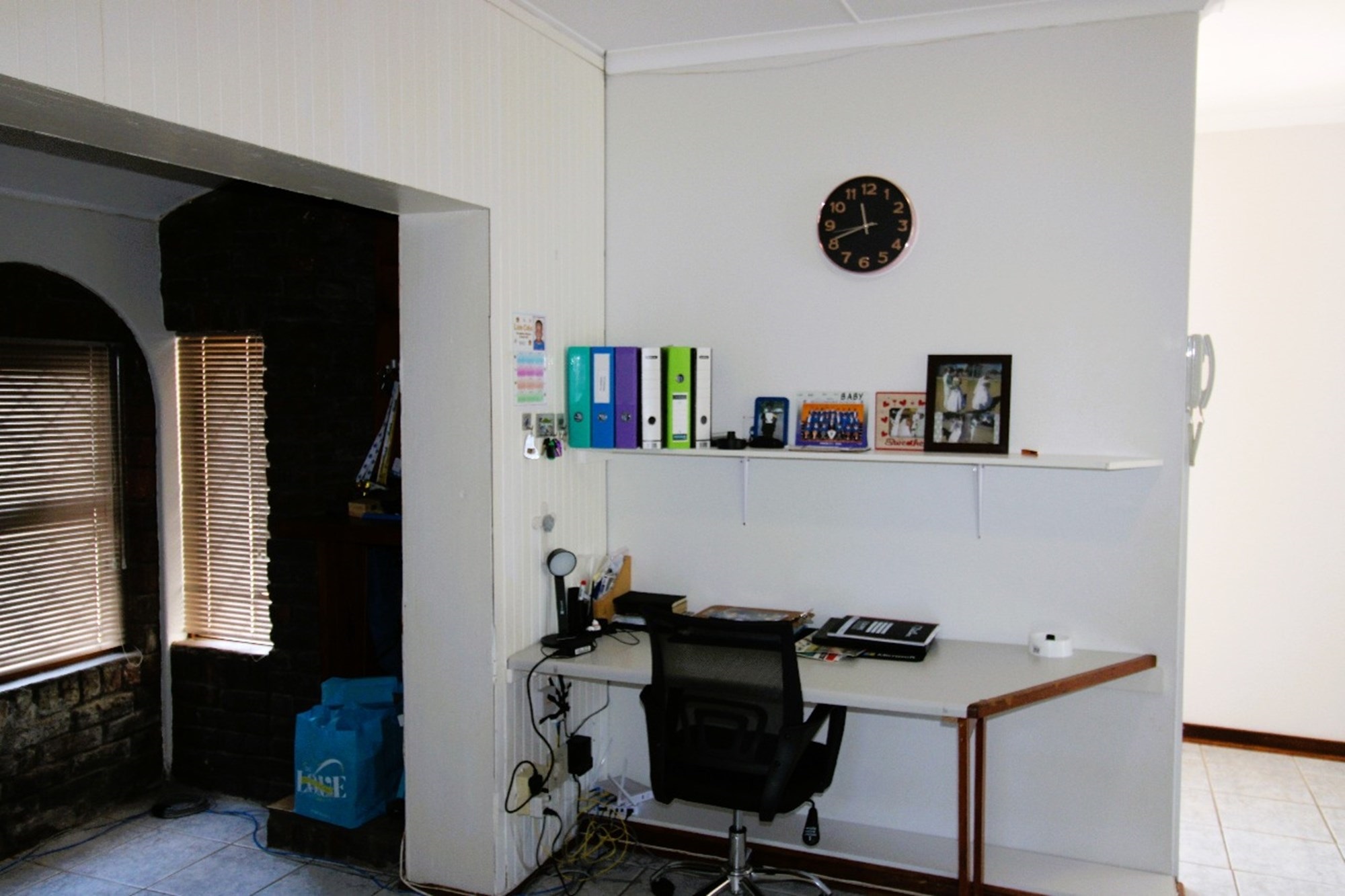 Outdoor features include a sparkling swimming pool, a covered veranda for entertaining, and a spacious garden. A secure garage with automatic door, alarm system, and water tank add peace of mind and convenience. Designated office area, with ample shelves and fibre internet is installed, making this an excellent option for work-from-home professionals. ( R400 additional cost)