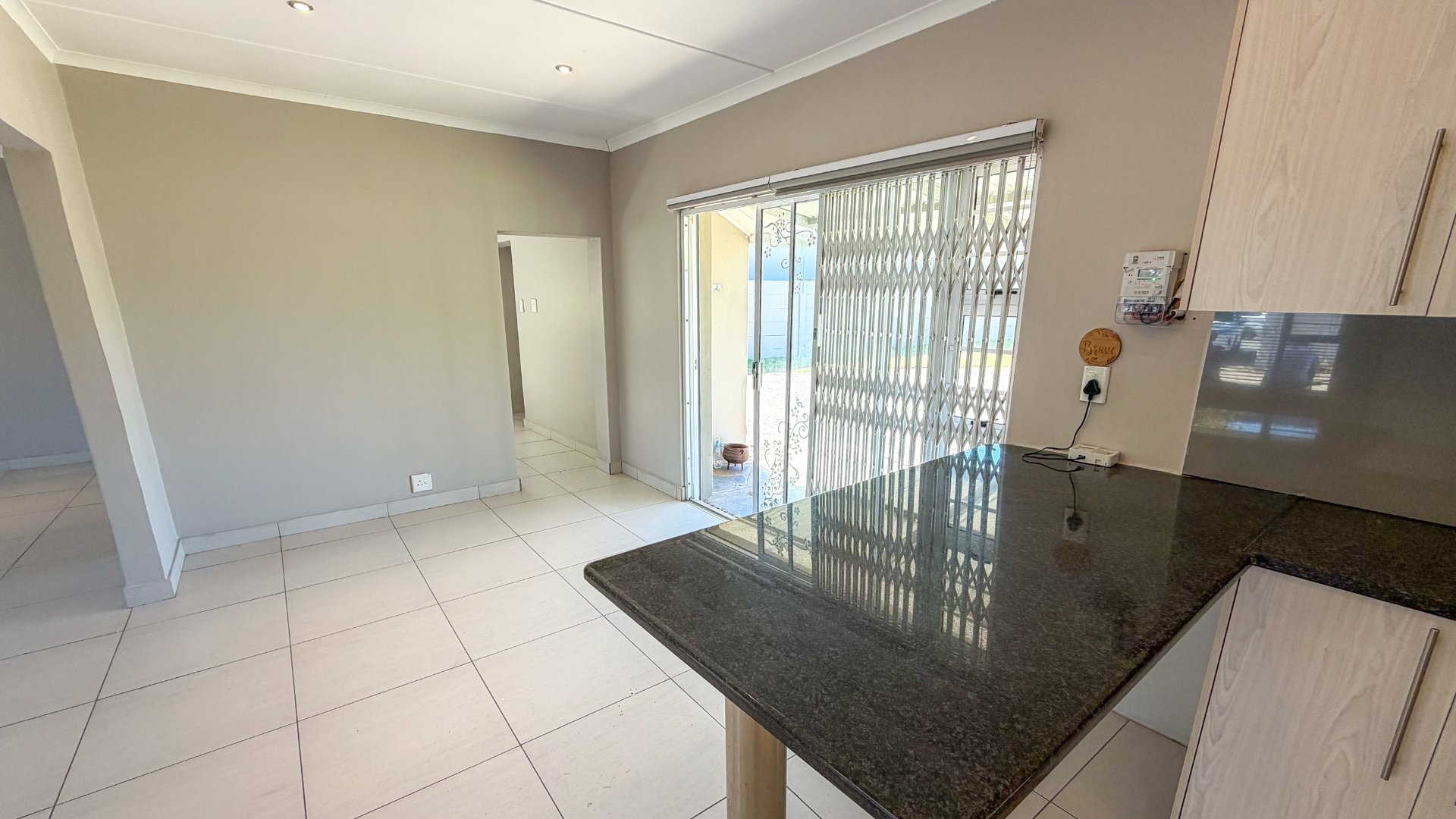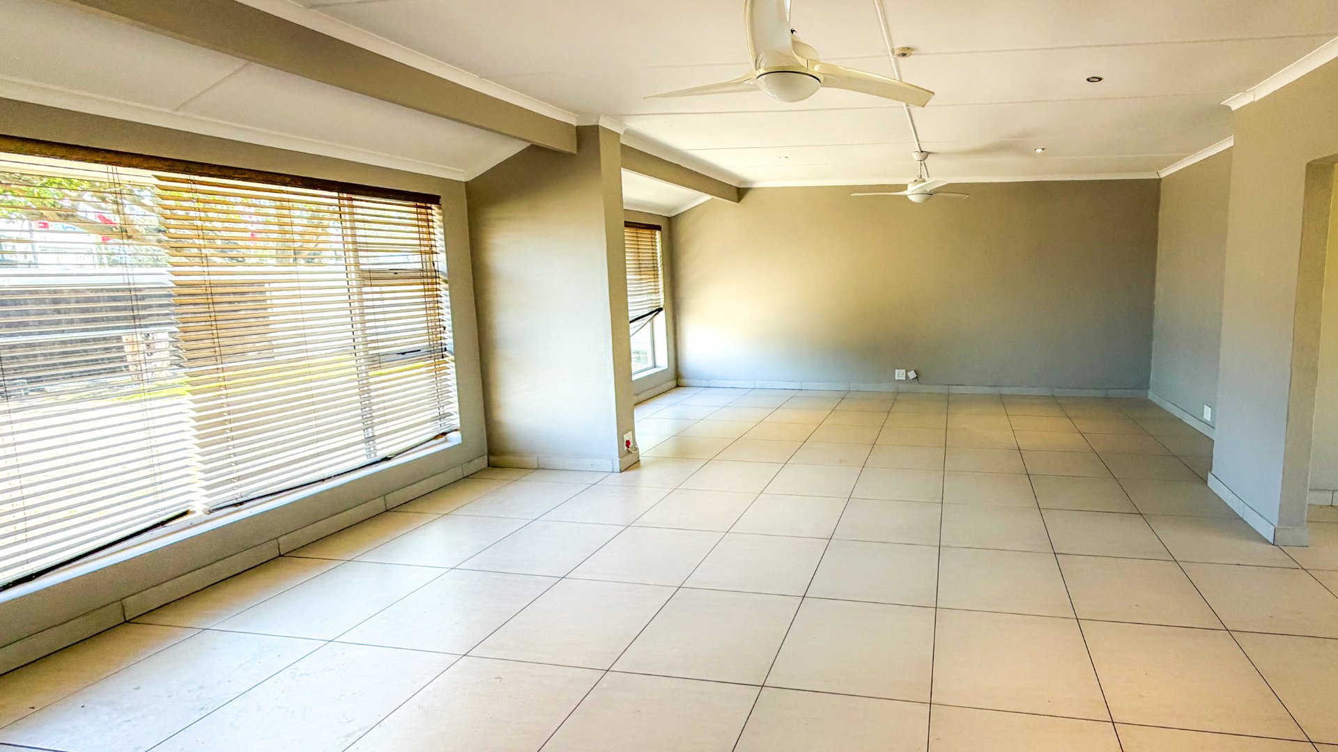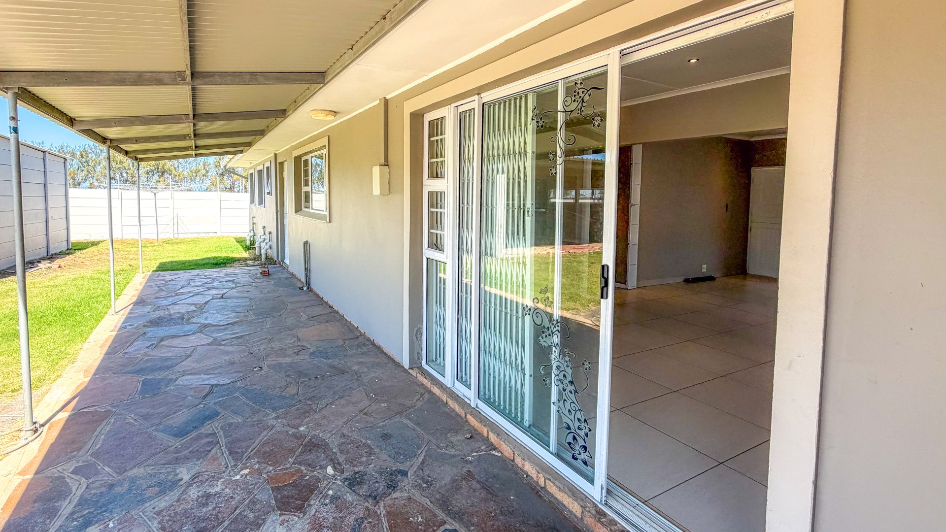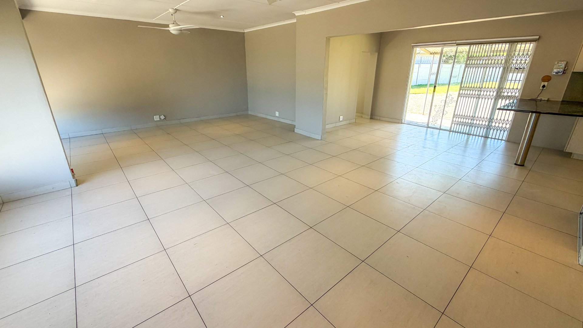 The open-plan lounge and dining area opens through sliding doors to a paved, covered entertainment space—perfect for braais, sundowners, or simply admiring the garden while plotting where the pool will go.