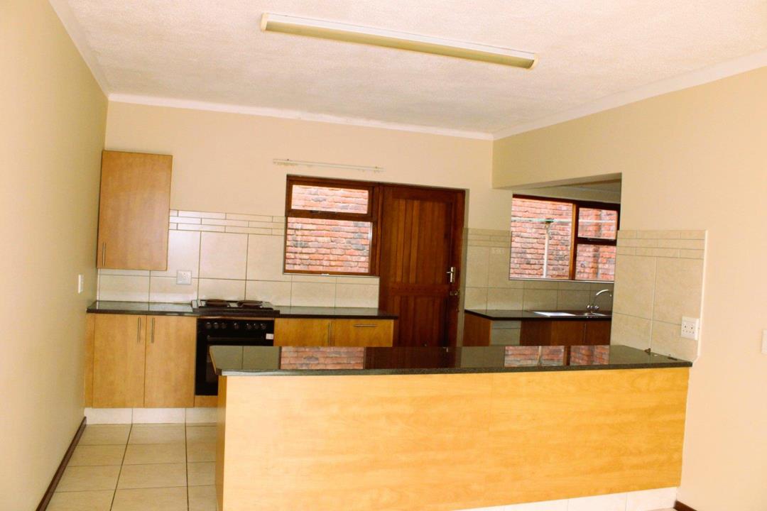 Well-equipped kitchen with built-in cupboards, ample storage, and access to a private courtyard.