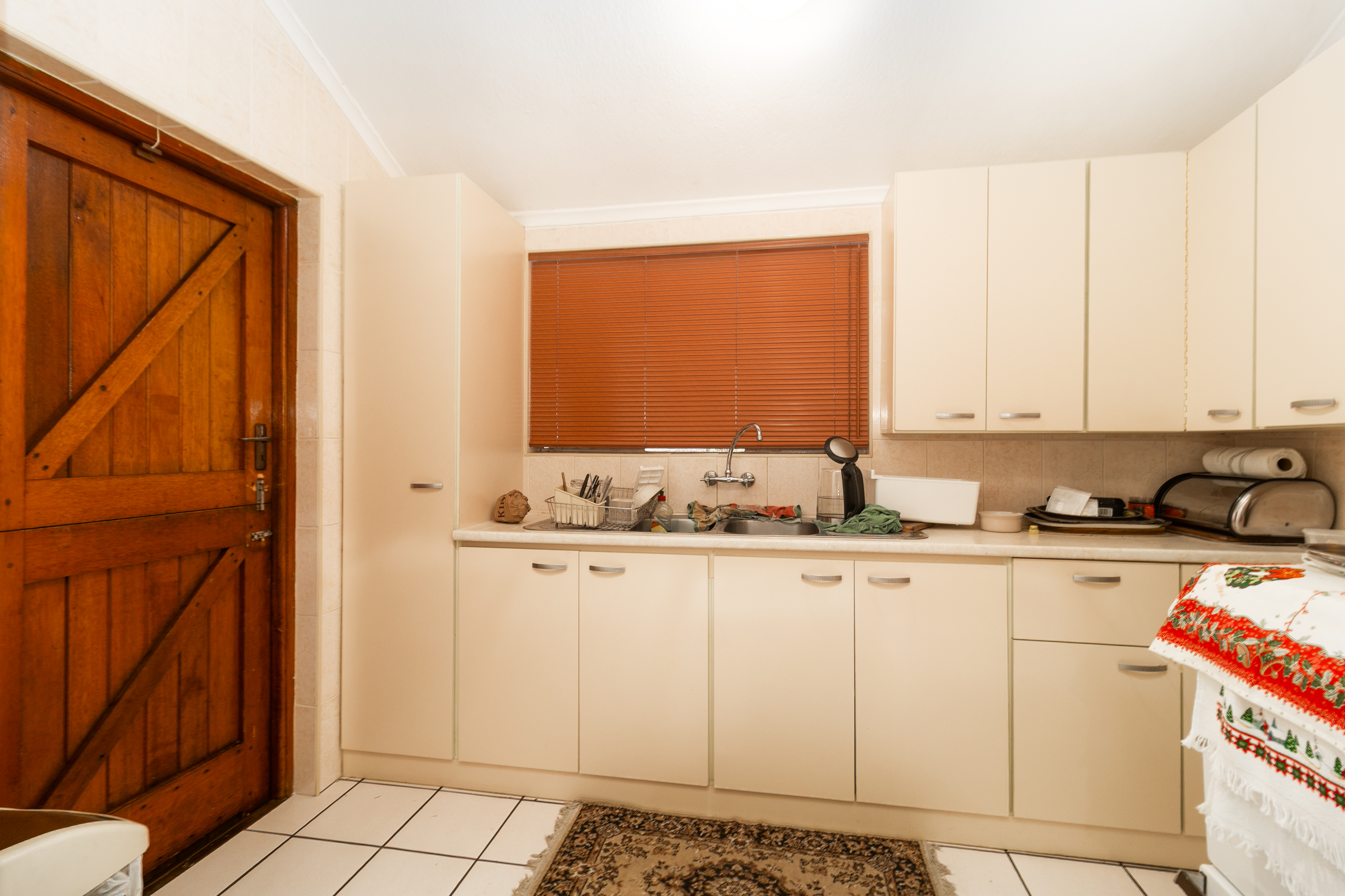 The outdoor area is designed for relaxed living and entertaining, featuring a covered patio overlooking a private garden where pets are welcome. This space is ideal for hosting friends and family, complete with a built-in braai for easy entertaining. Additional features include an enclosed laundry room with an outside wash basin, adding to the home’s practicality, as well as a single manual garage for secure parking.