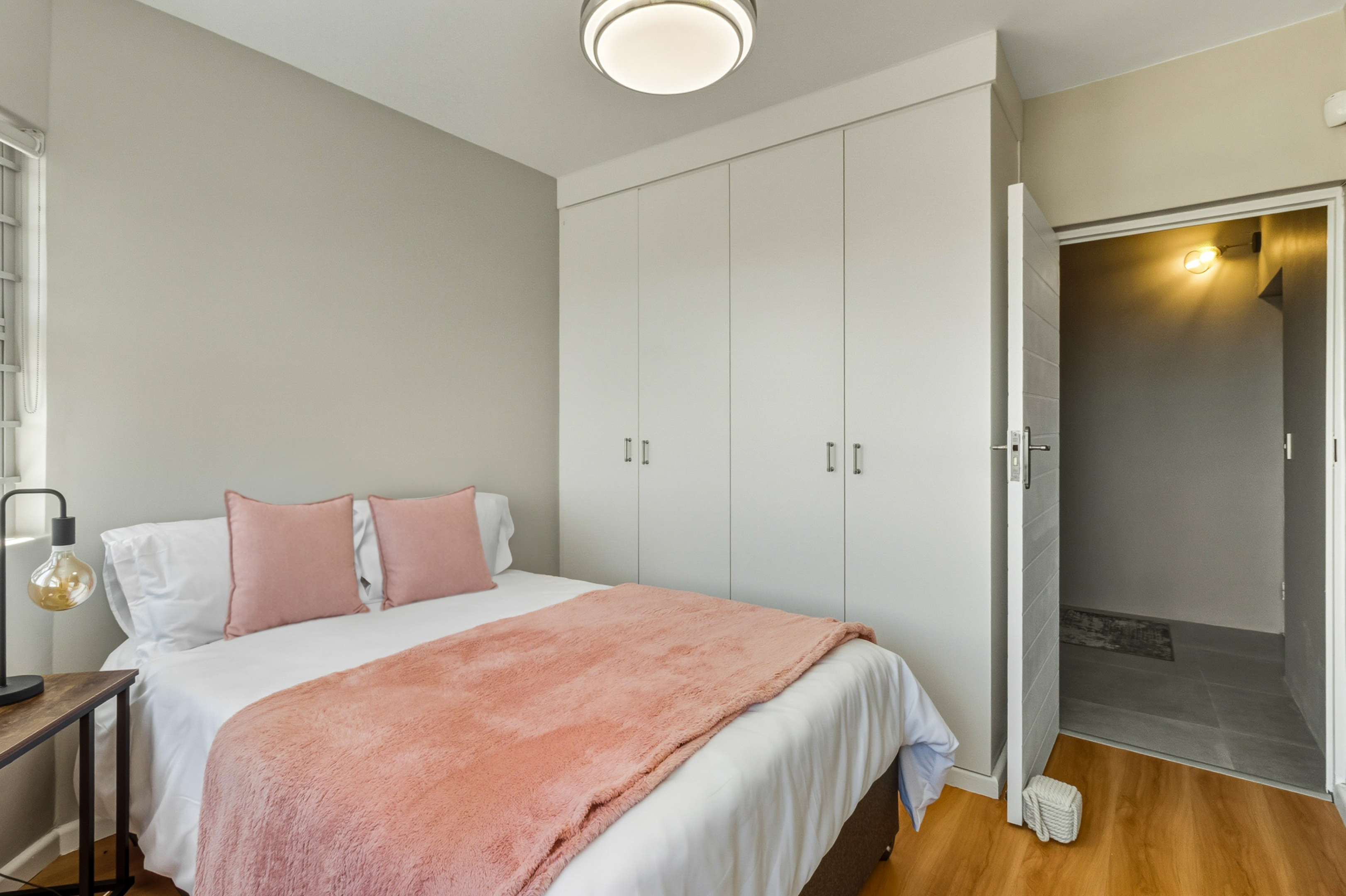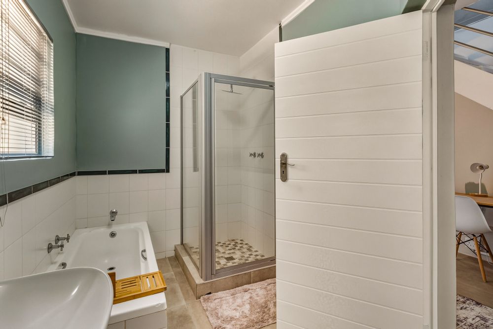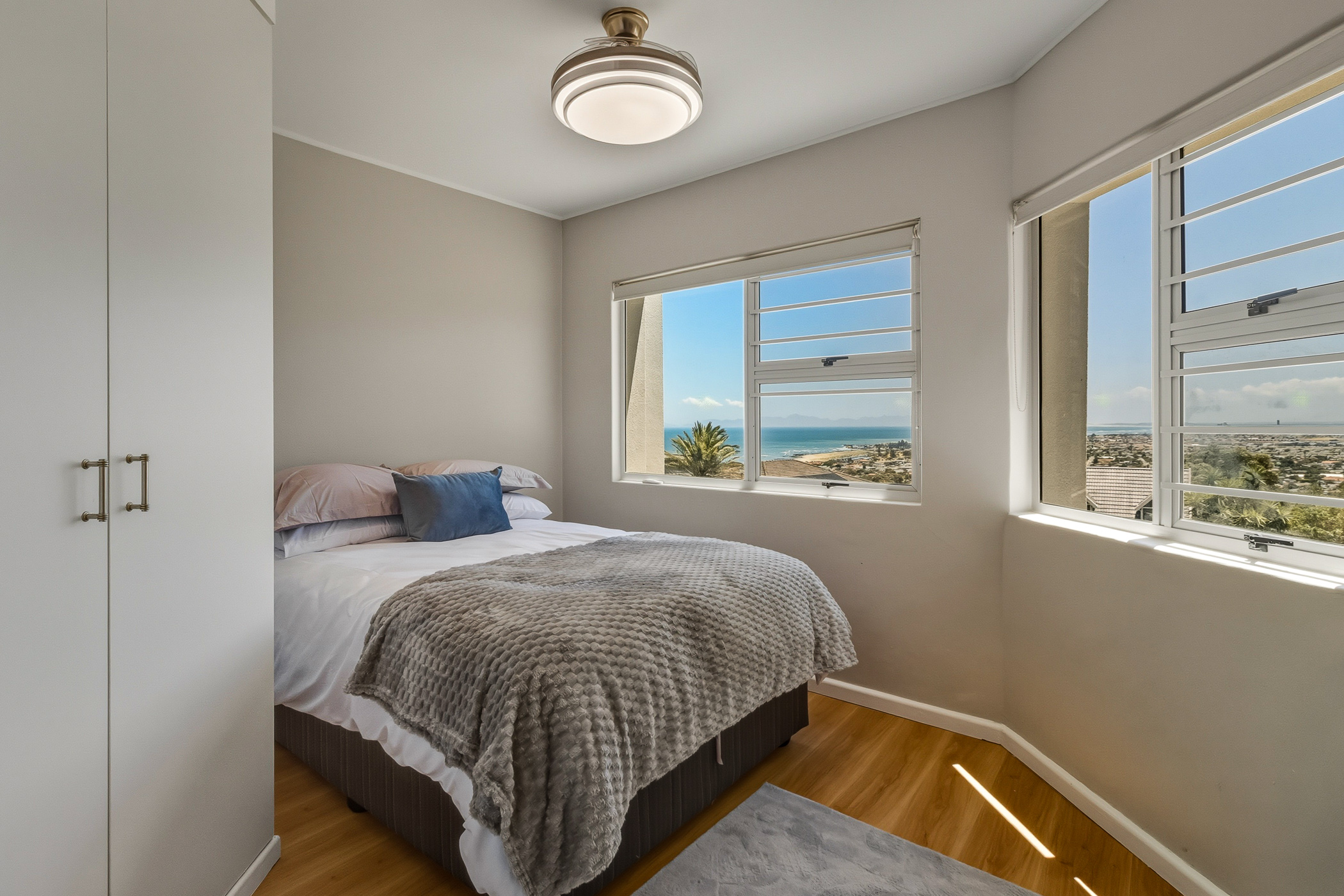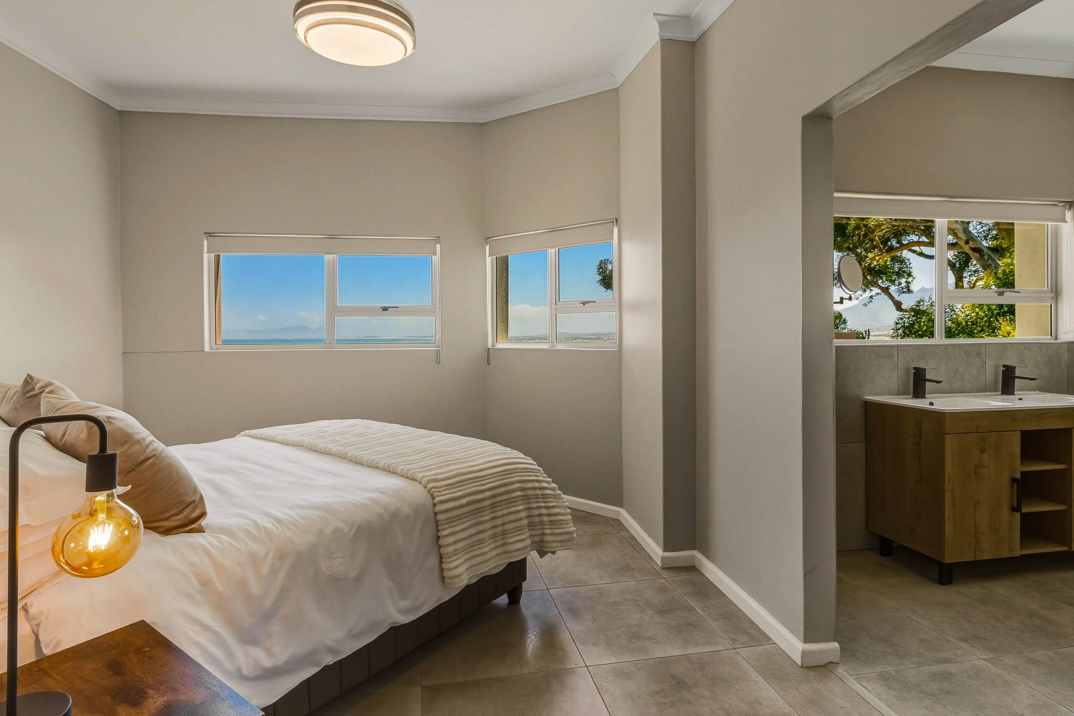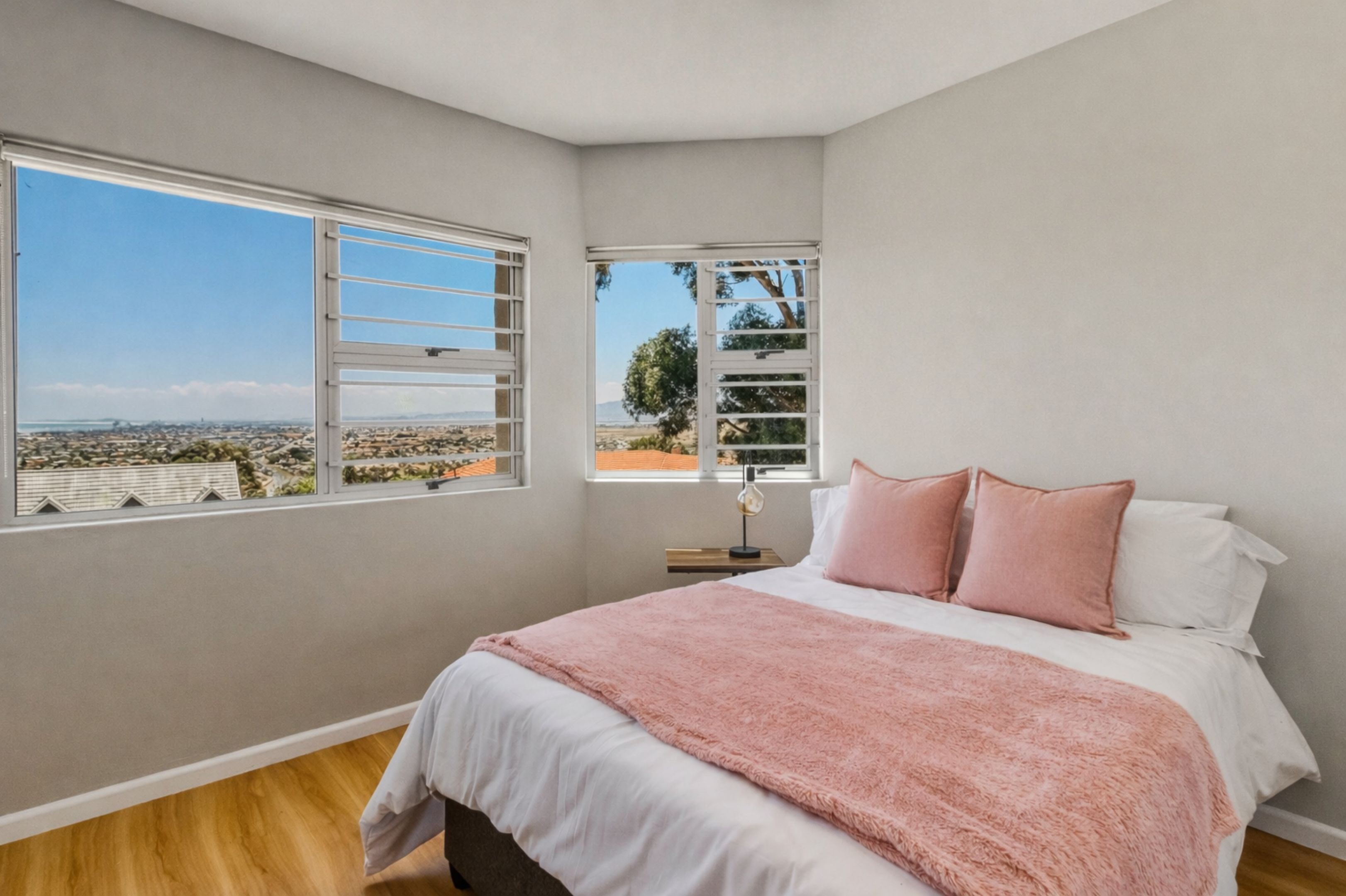 The open-plan living areas are bright and inviting, with clean lines and quality finishes throughout. Stacker doors open onto a balcony with breathtaking views of the Helderberg Mountains and False Bay, creating a serene backdrop for morning coffee, evening sunsets, or entertaining friends and family.