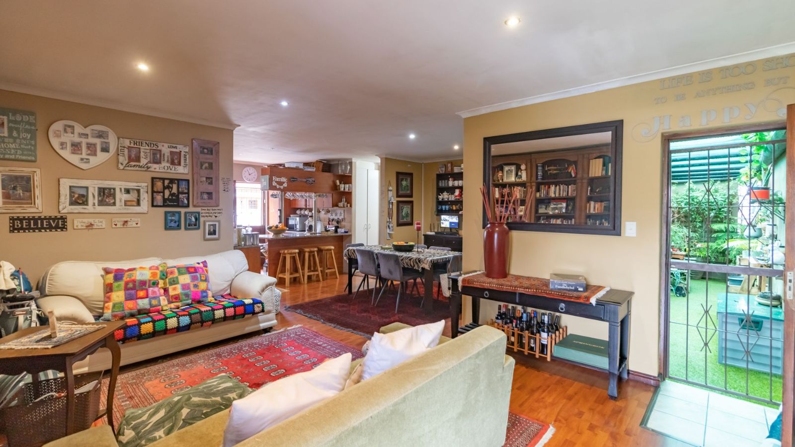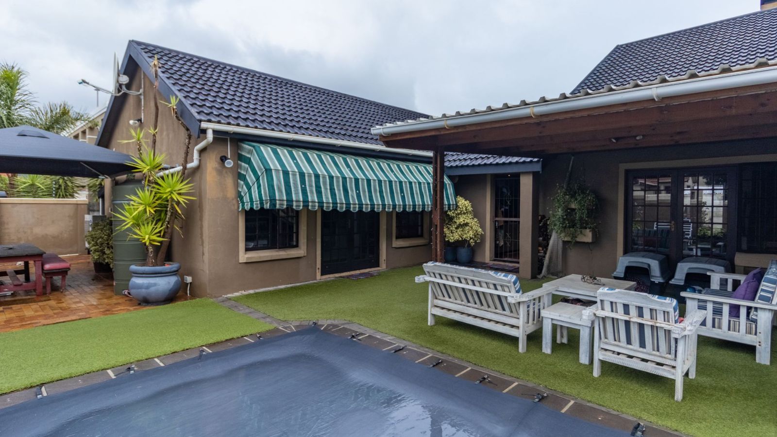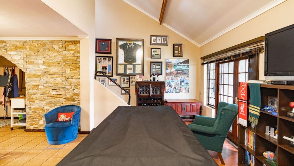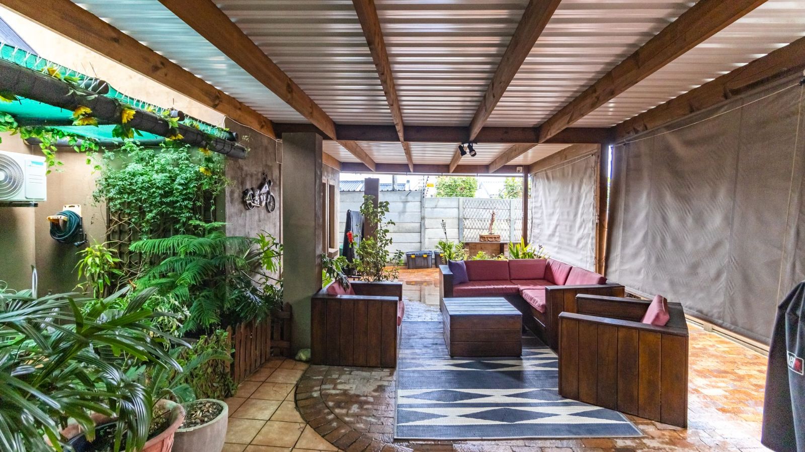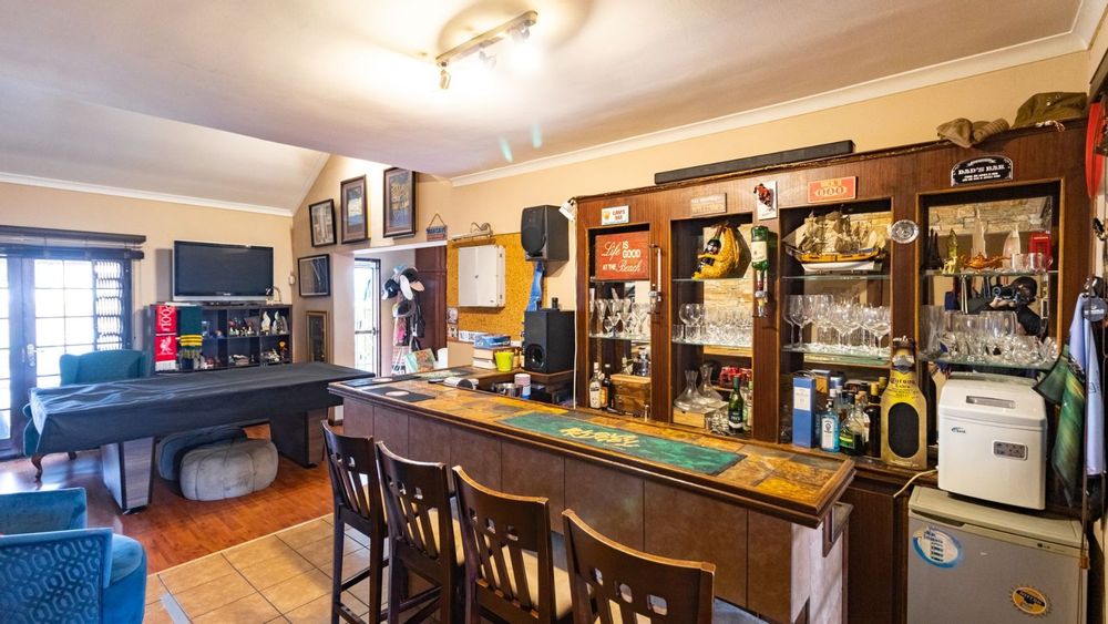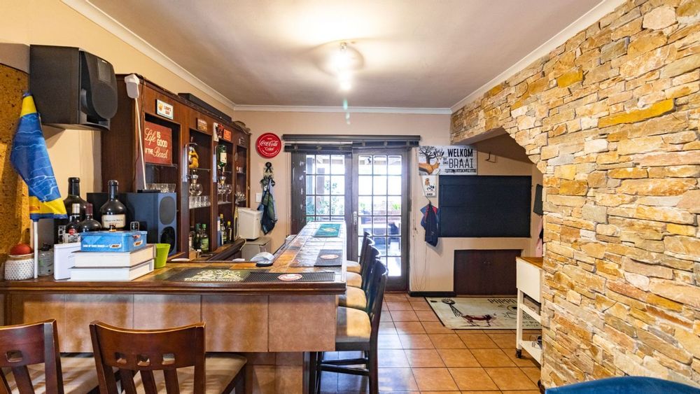 Friends and family gatherings is a dream with a large entertainment room featuring a bar, built-in braai and double doors leading out to covered patios. A large patio featuring a built-in braai, opening onto a small retreat style garden — a perfect peaceful nook for relaxed outdoor meals or quiet reflection.