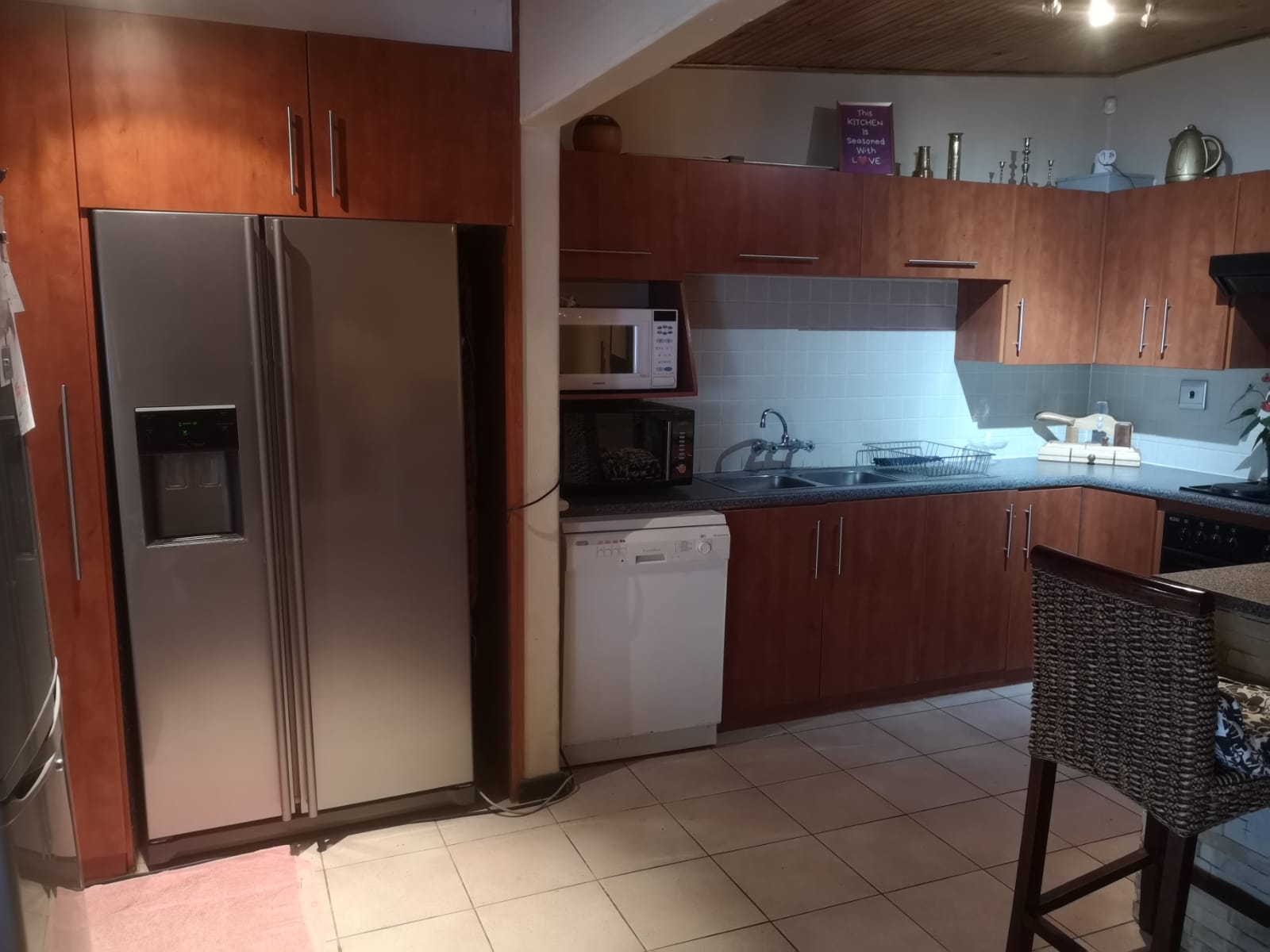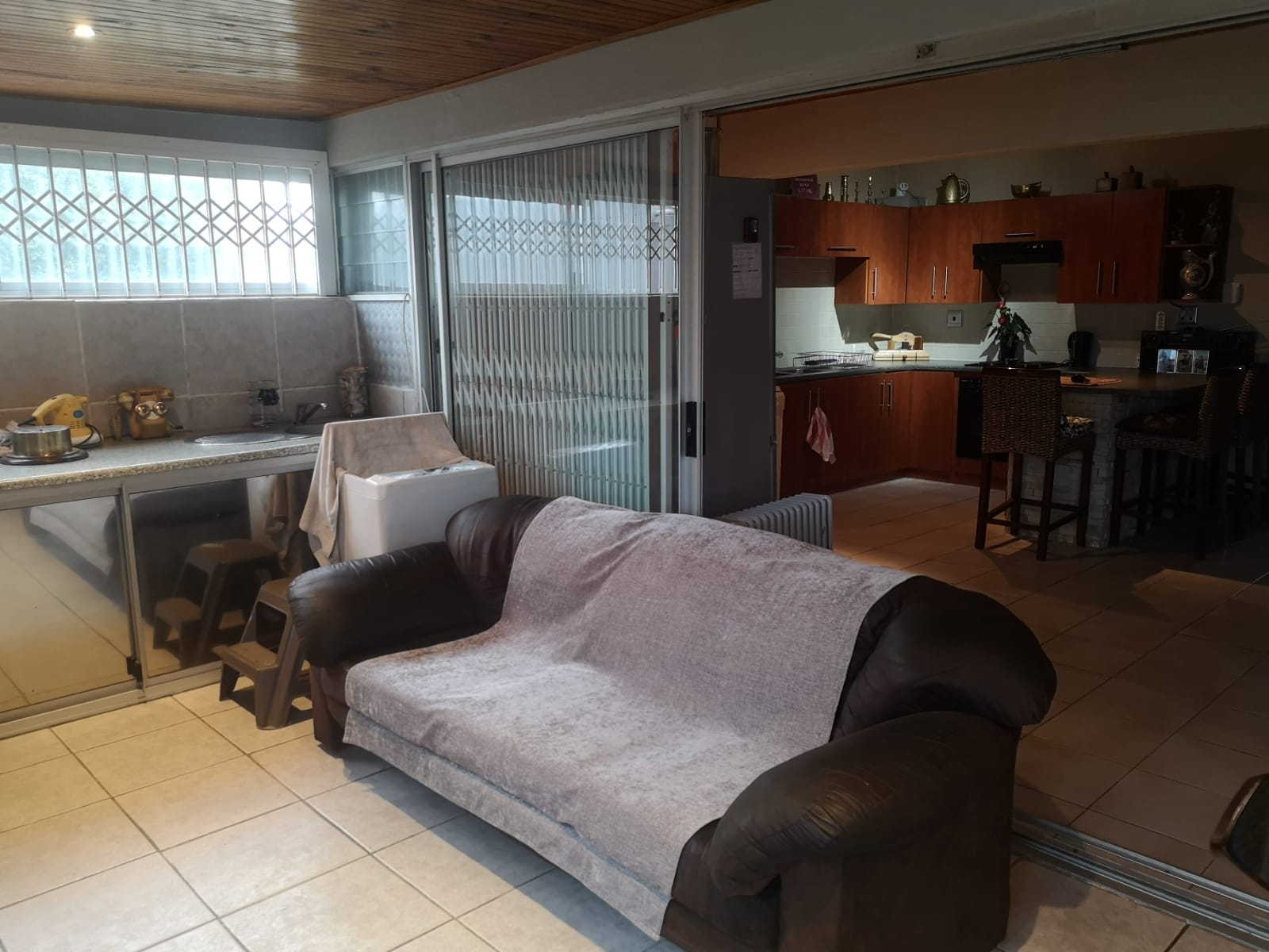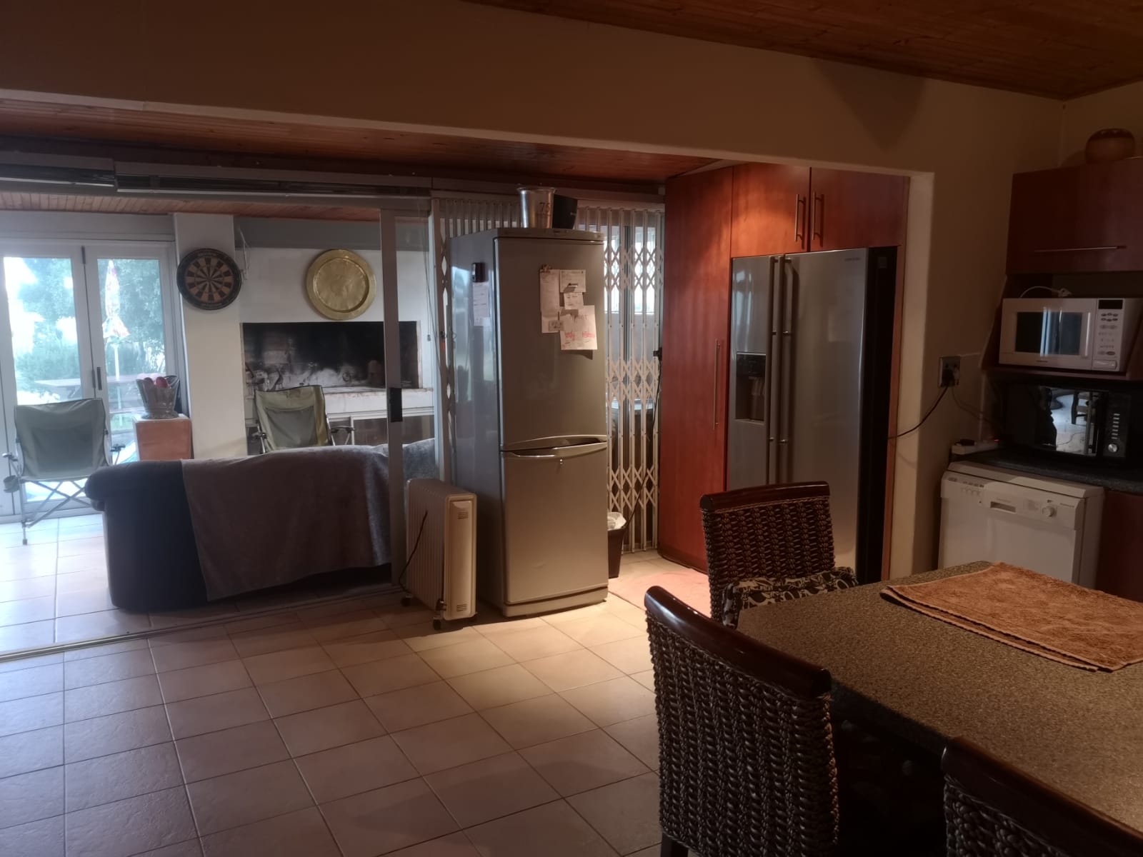 Tinted sliding doors take you into the entertainment area with built in braai and cozy dining room and open plan well equipped kitchen with large counter separating the lounge/tv area..