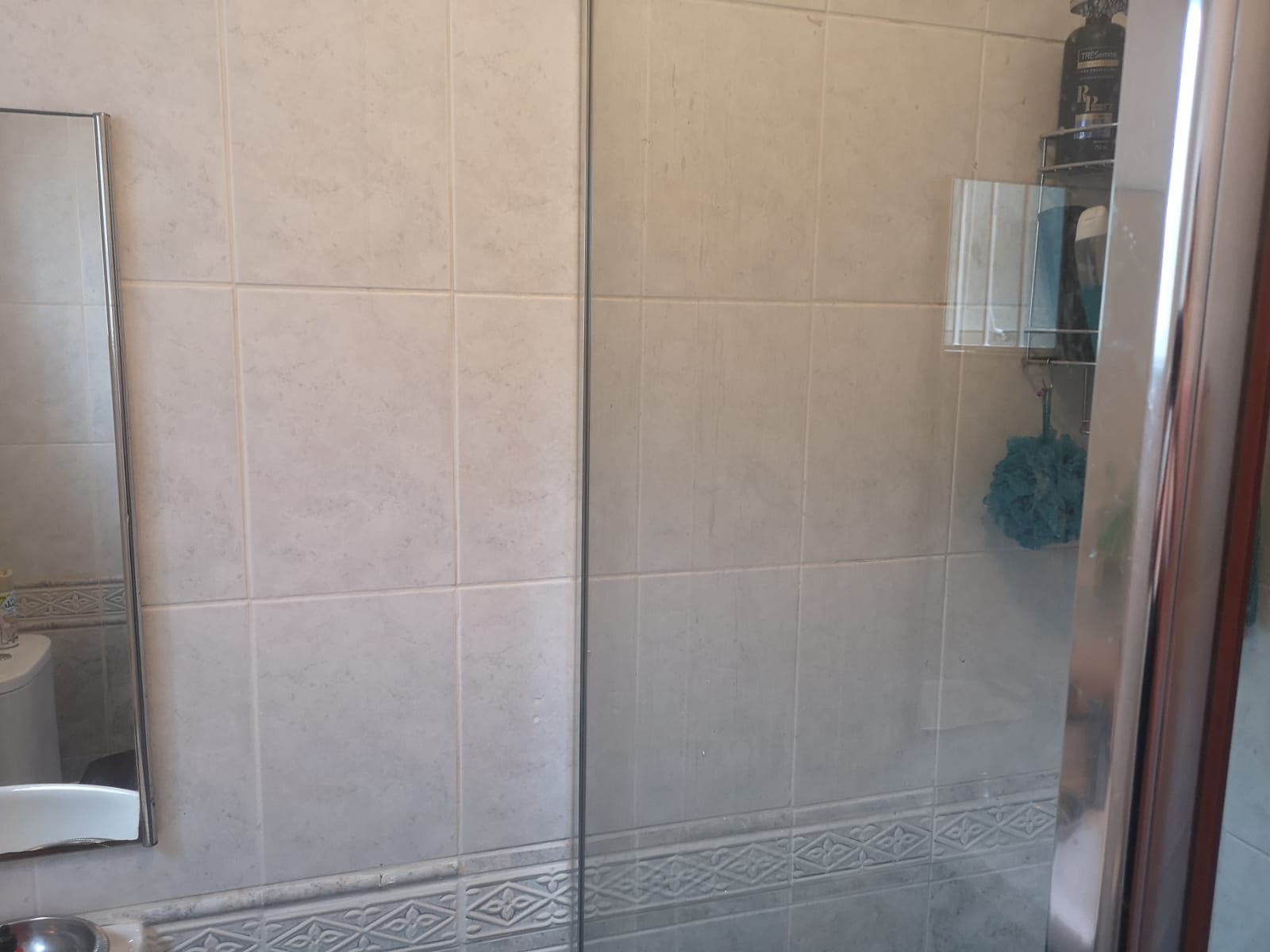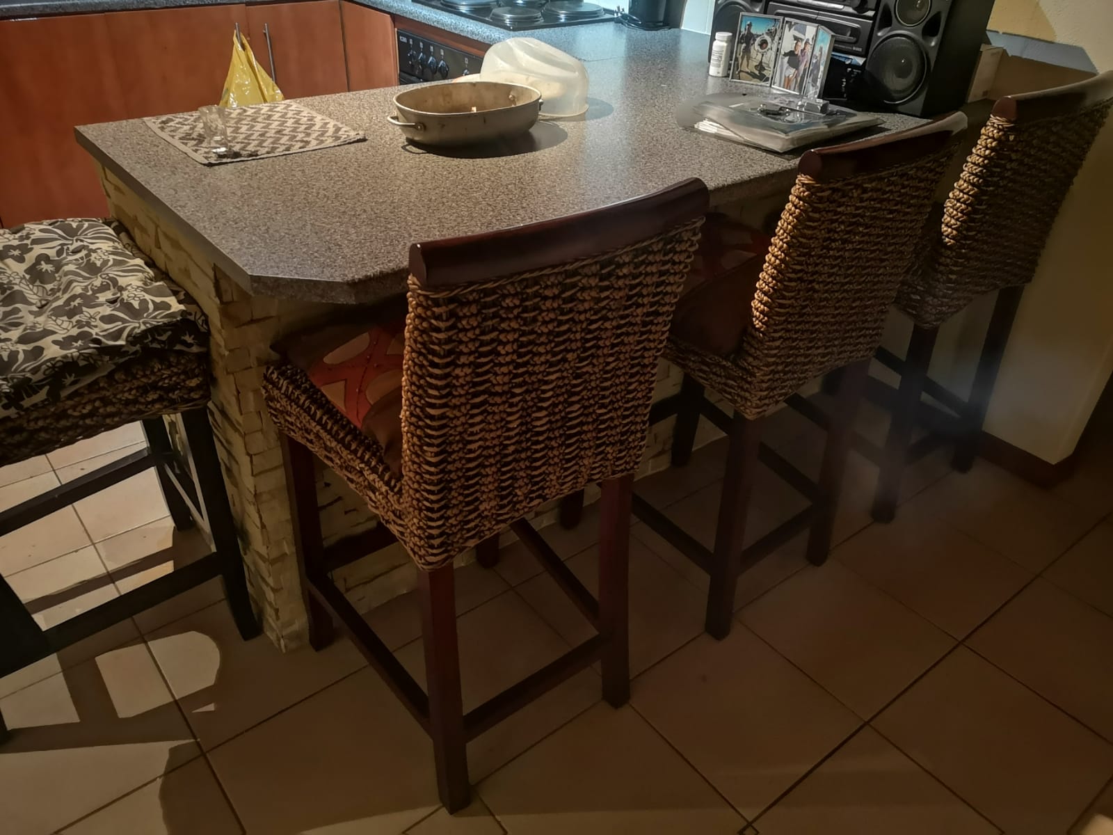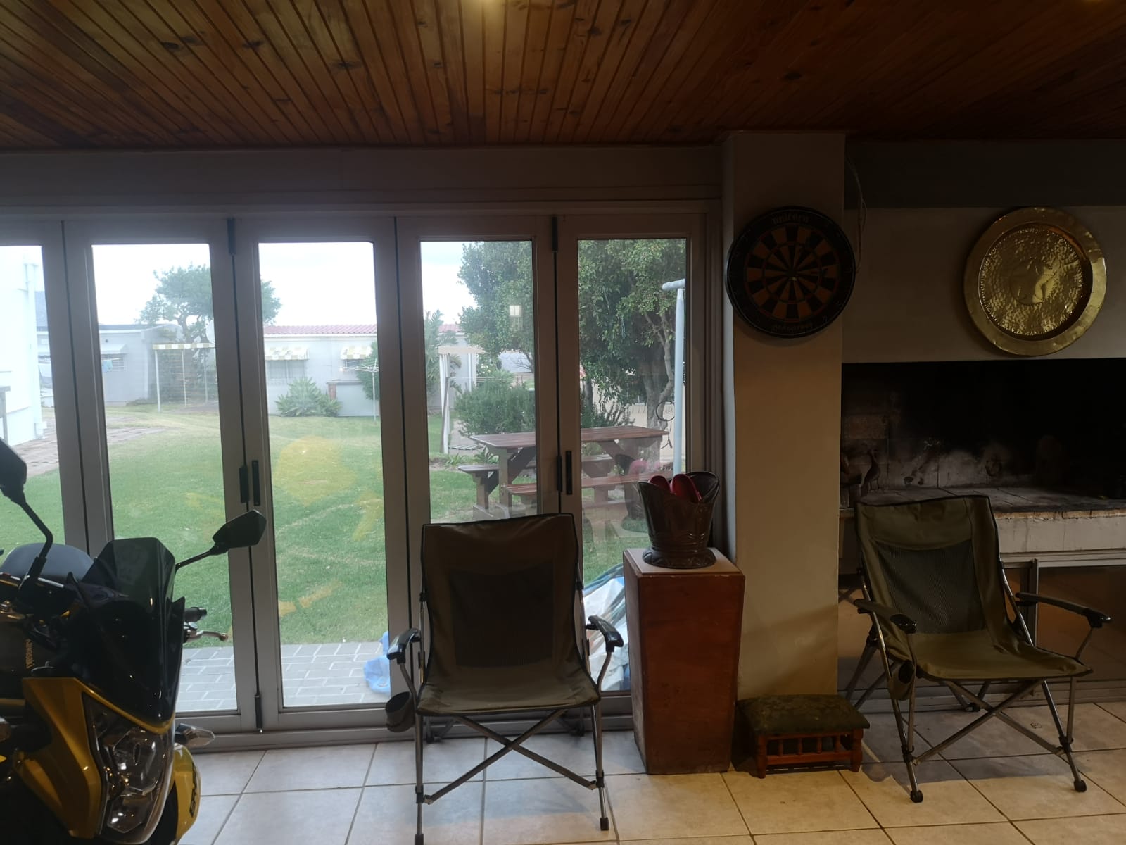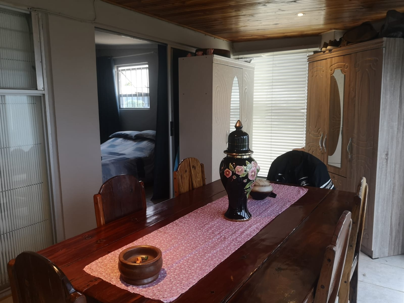 Tinted sliding doors take you into the entertainment area with built in braai and cozy dining room and open plan well equipped kitchen with large counter separating the lounge/tv area..
