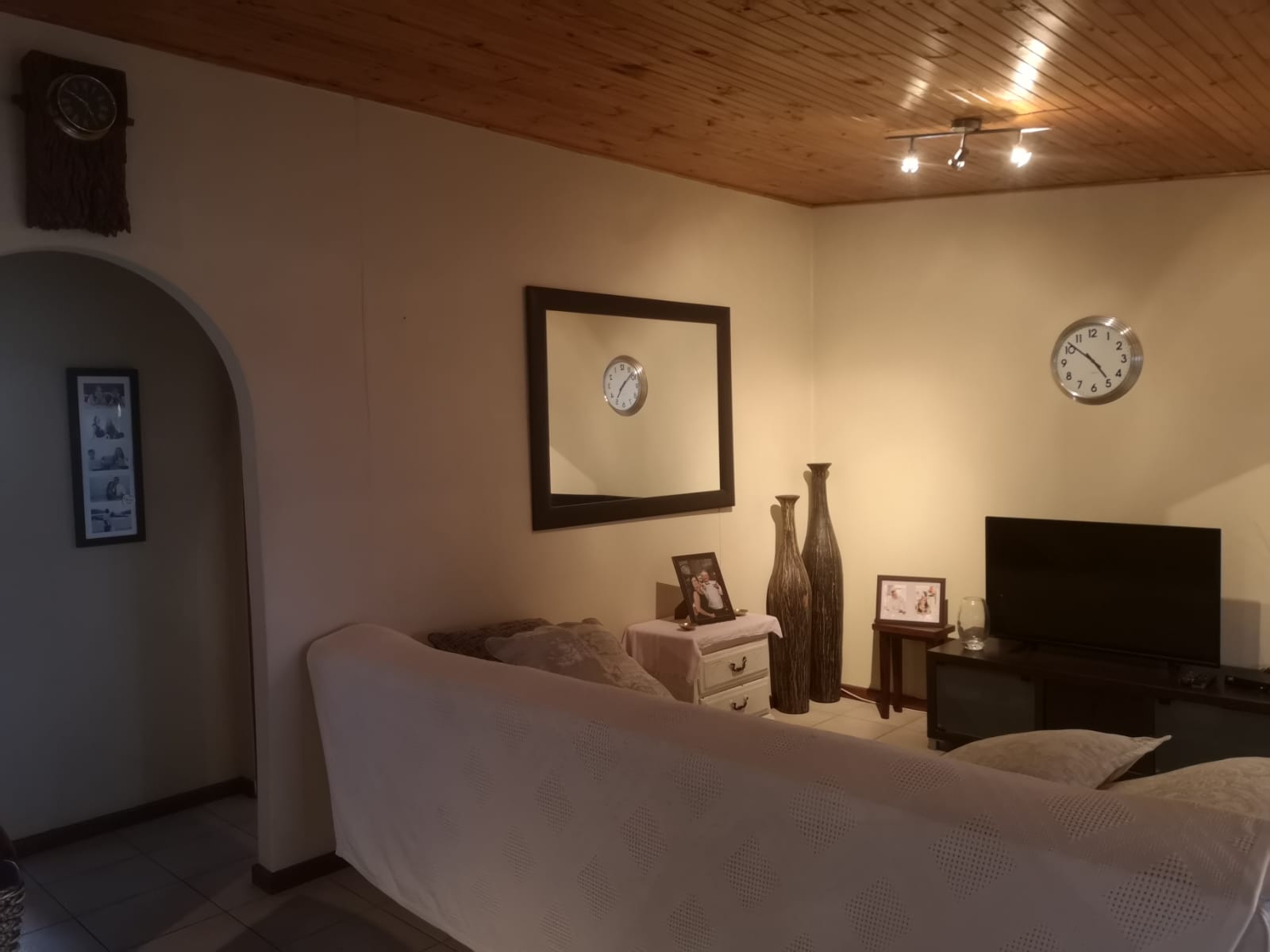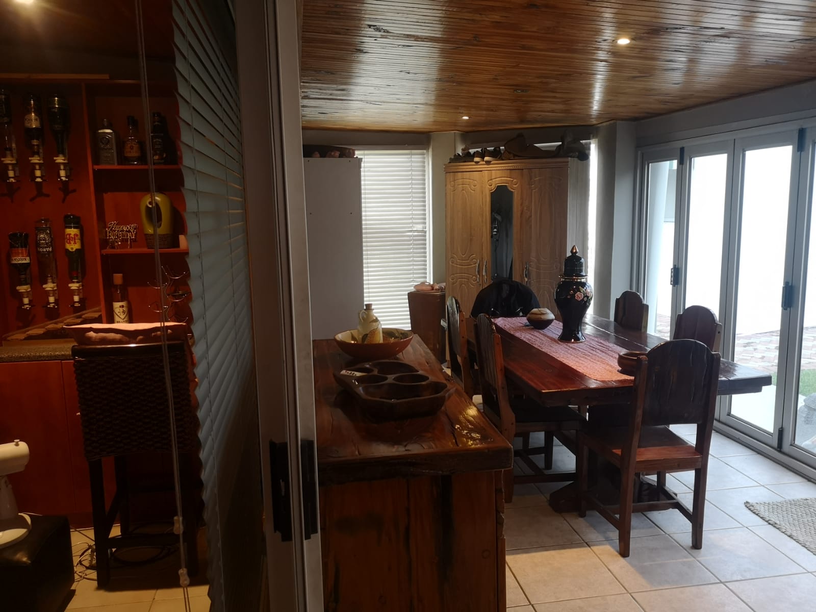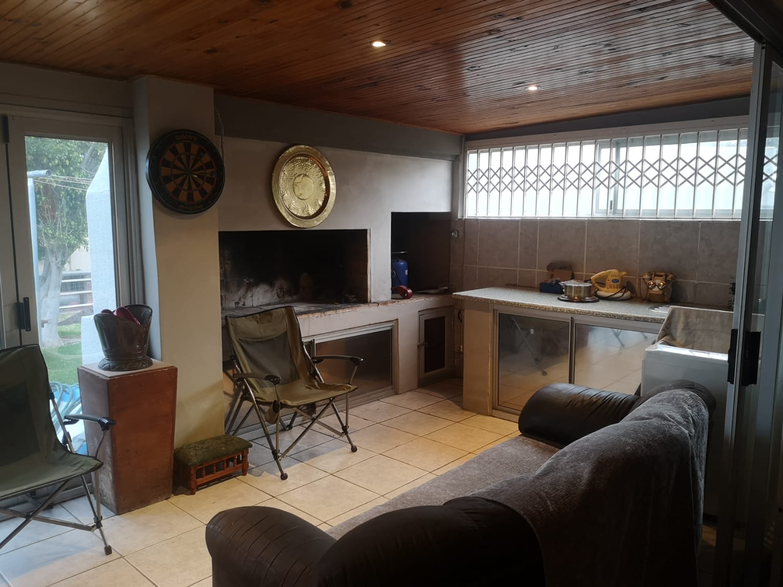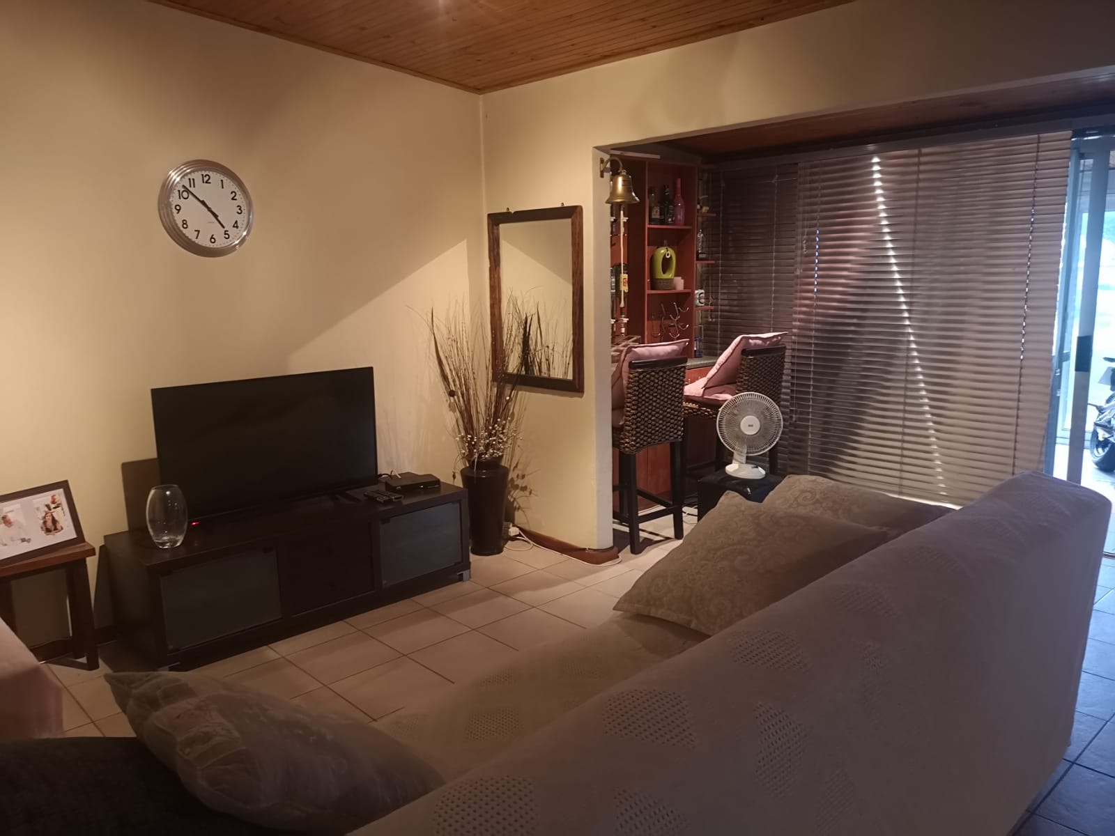 Tinted sliding doors take you into the entertainment area with built in braai and cozy dining room and open plan well equipped kitchen with large counter separating the lounge/tv area..