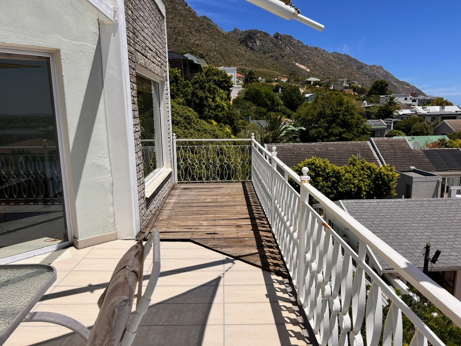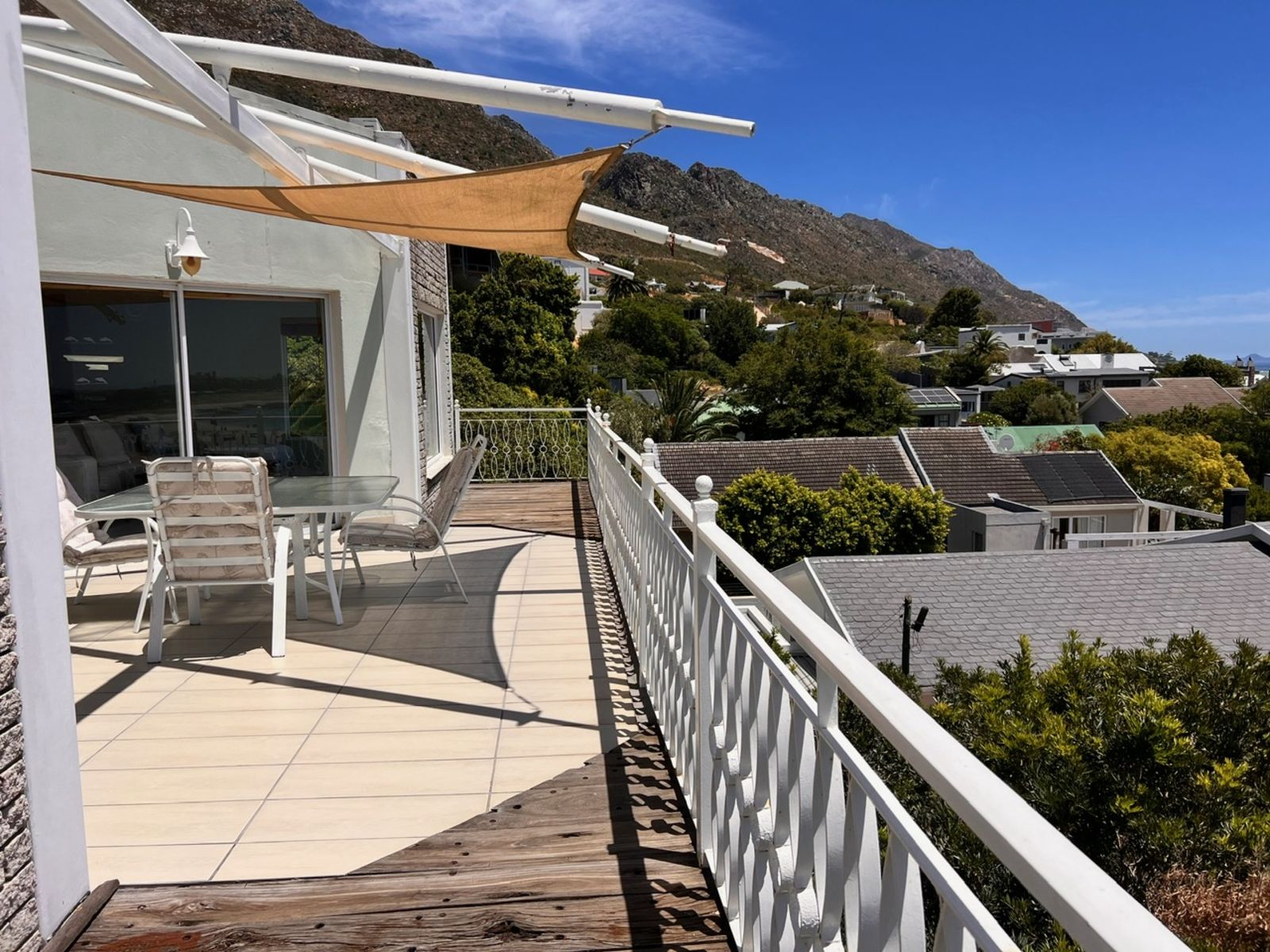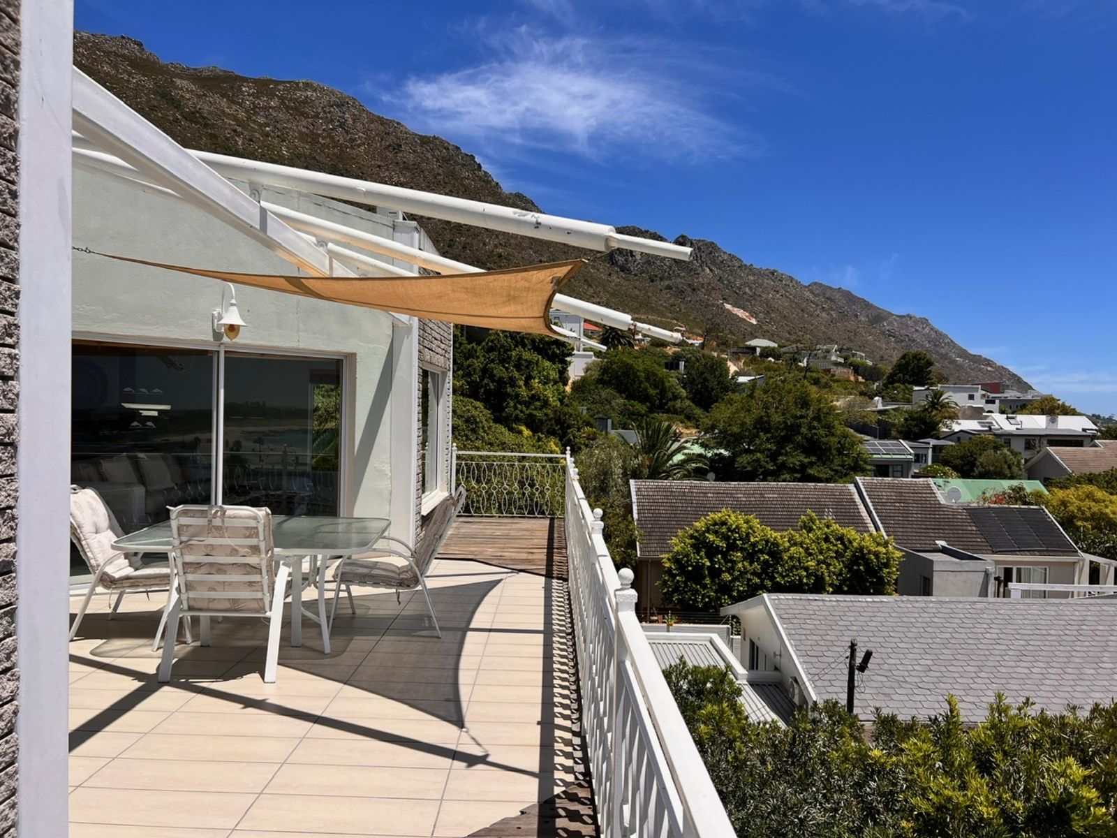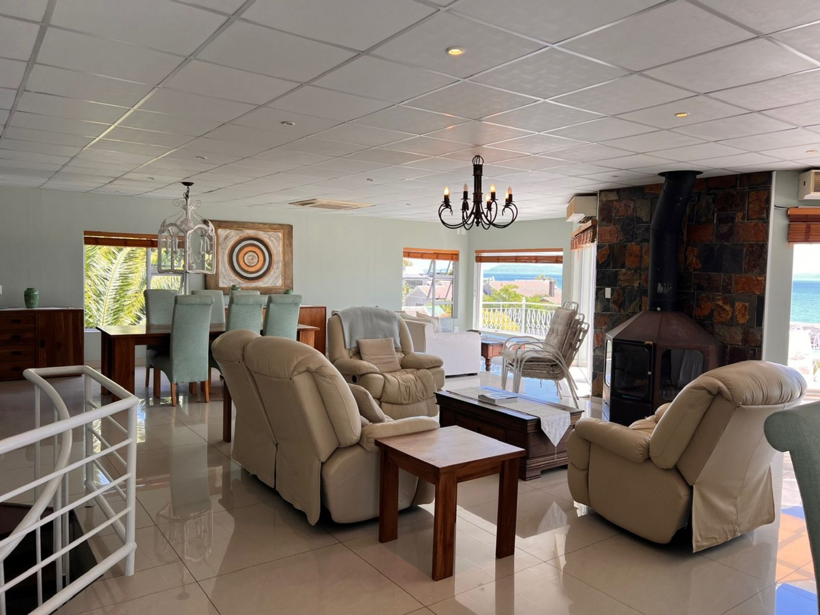 The property features a total of eleven spacious bedrooms, seven of which are en-suite, while the remaining five enjoy their own separate private bathrooms. The layout is ideal for accommodating high guest volumes, family bookings, and group stays. The top floor offers an expansive entertainment level with an open-plan lounge, two dining areas and a striking central fireplace, flowing out onto a large sea-facing patio overlooking Gordon’s Bay’s main beach—an exceptional setting for guest relaxation and special events.