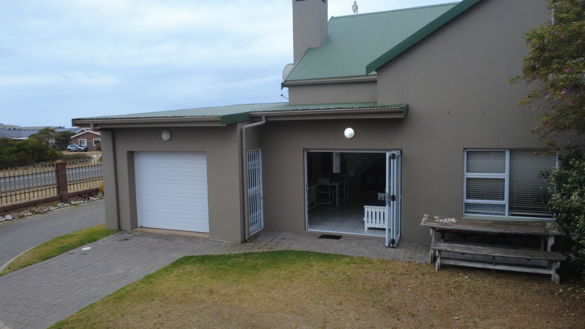 Downstairs features a spacious main bedroom with ample built-in cupboards and an en-suite bathroom comprising a bath, shower, basin, and toilet. The modern kitchen flows seamlessly into the living area, which includes a built-in braai and aluminium stacking doors that allow for abundant natural light and extend the living space onto a private lawn.