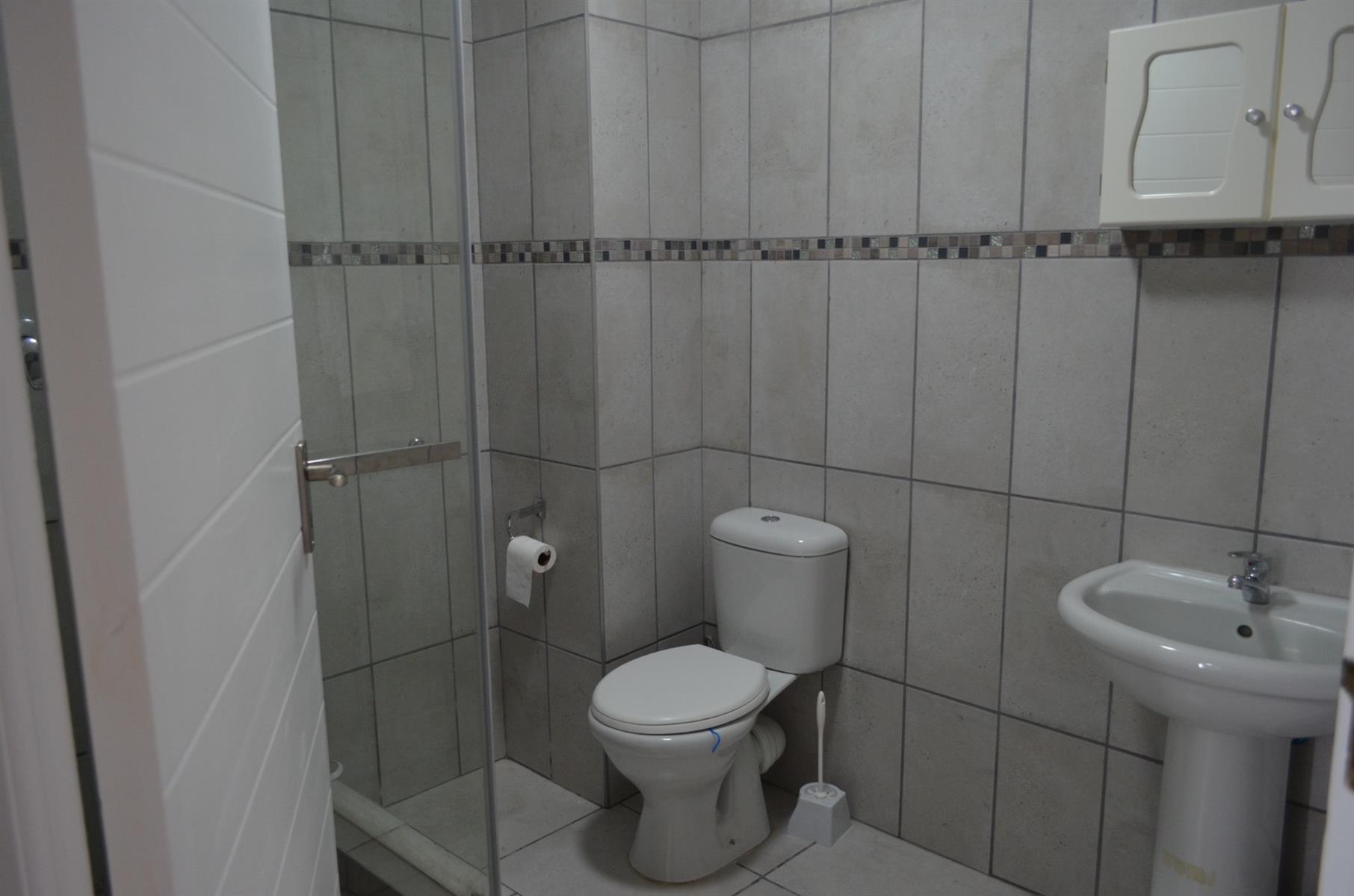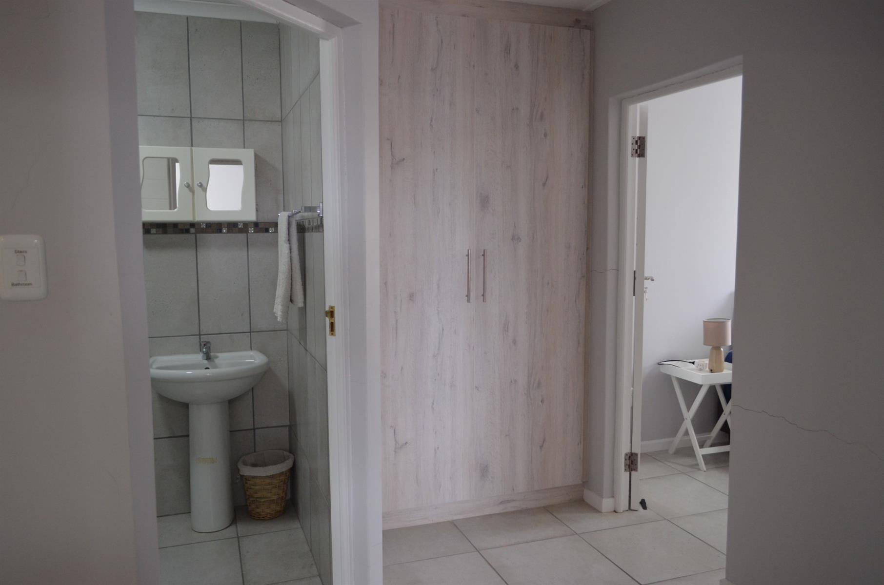 Upstairs offers two well-sized bedrooms with generous built-in cupboards, sharing a bathroom fitted with a shower, basin, and toilet.