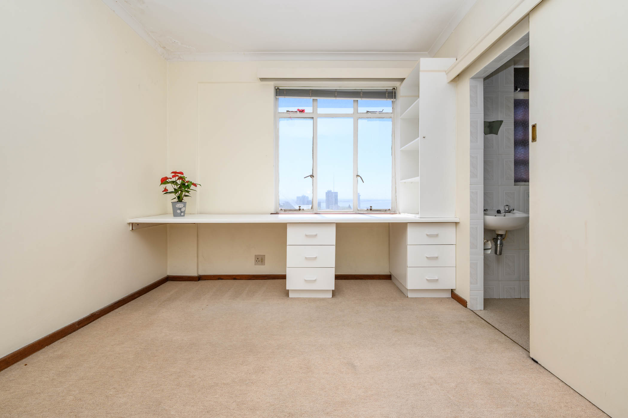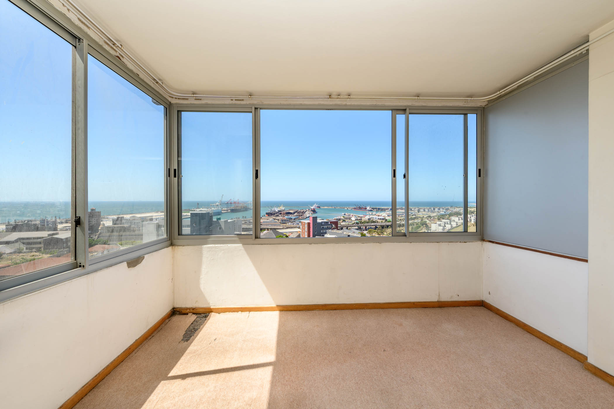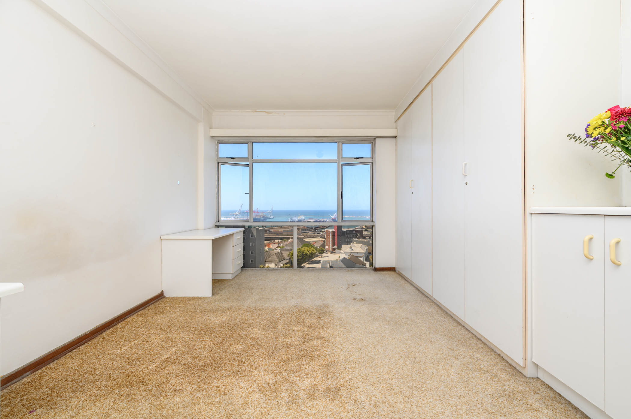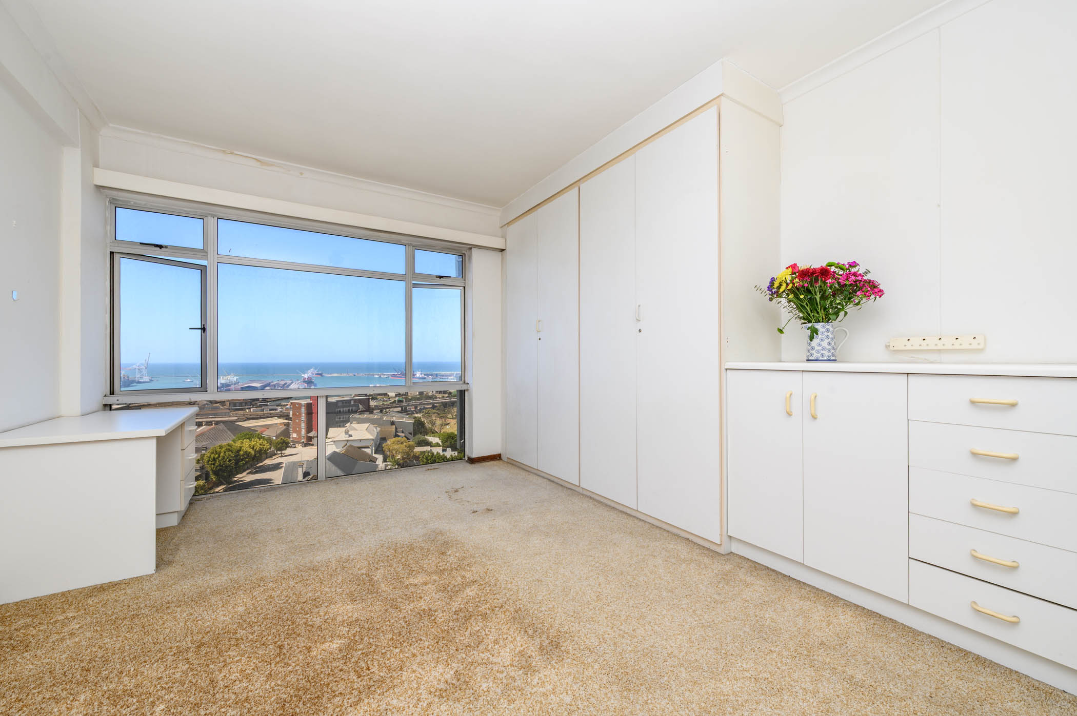Both bedrooms are a good size, with the main bedroom benefiting from full harbour and sea views. Both bedrooms have built in cupboards with an extra set of cupboards in the passage area.