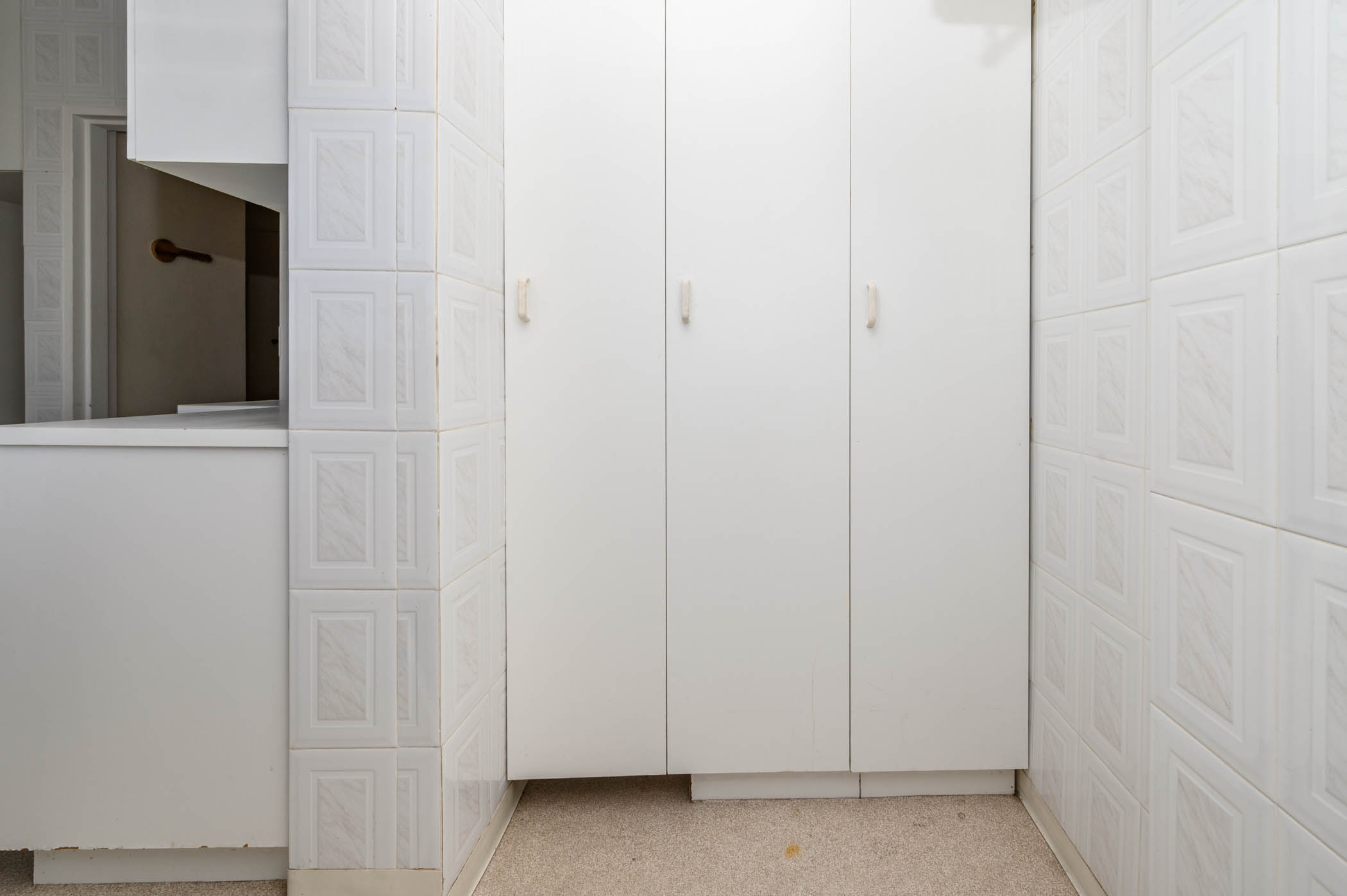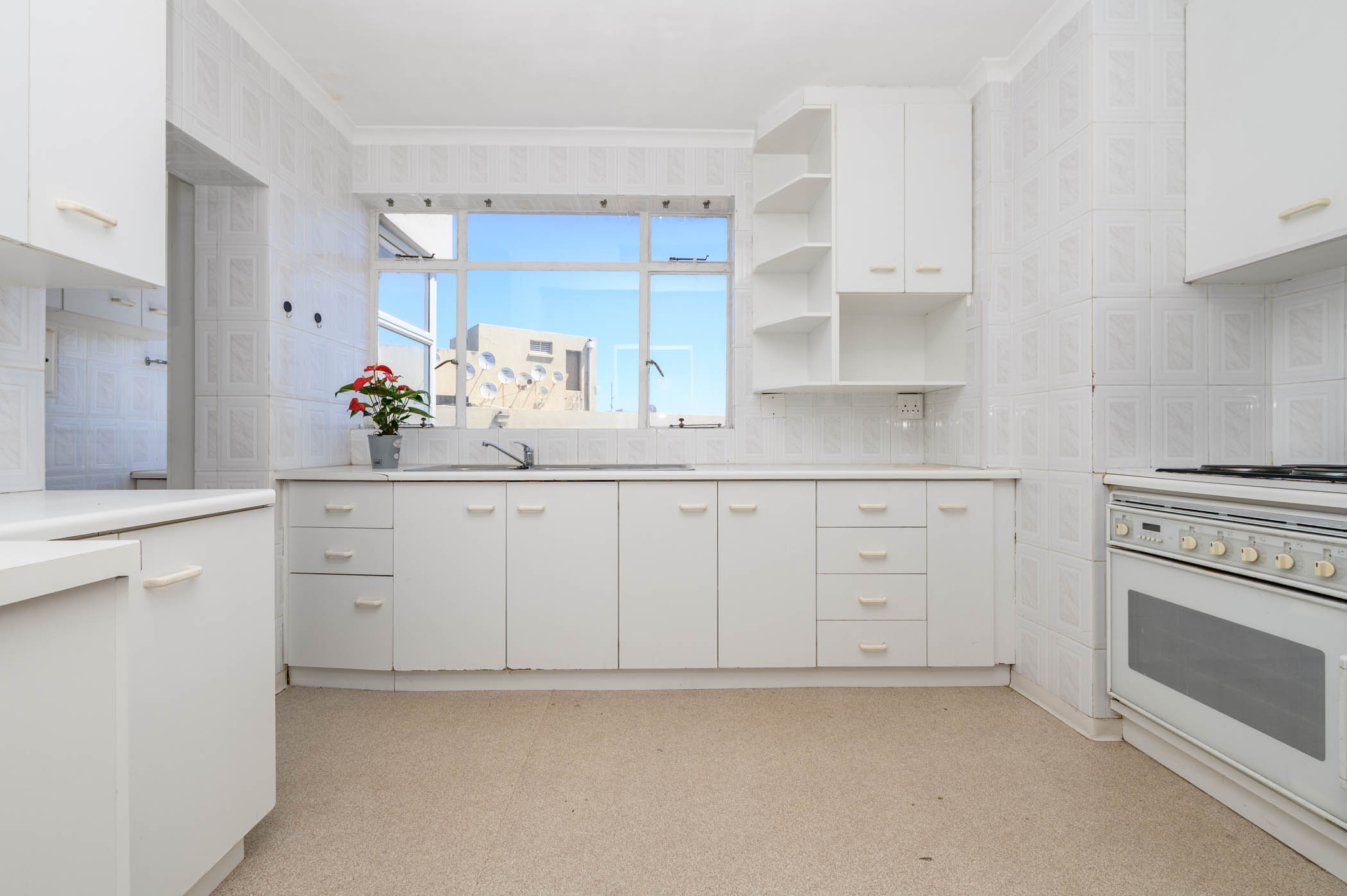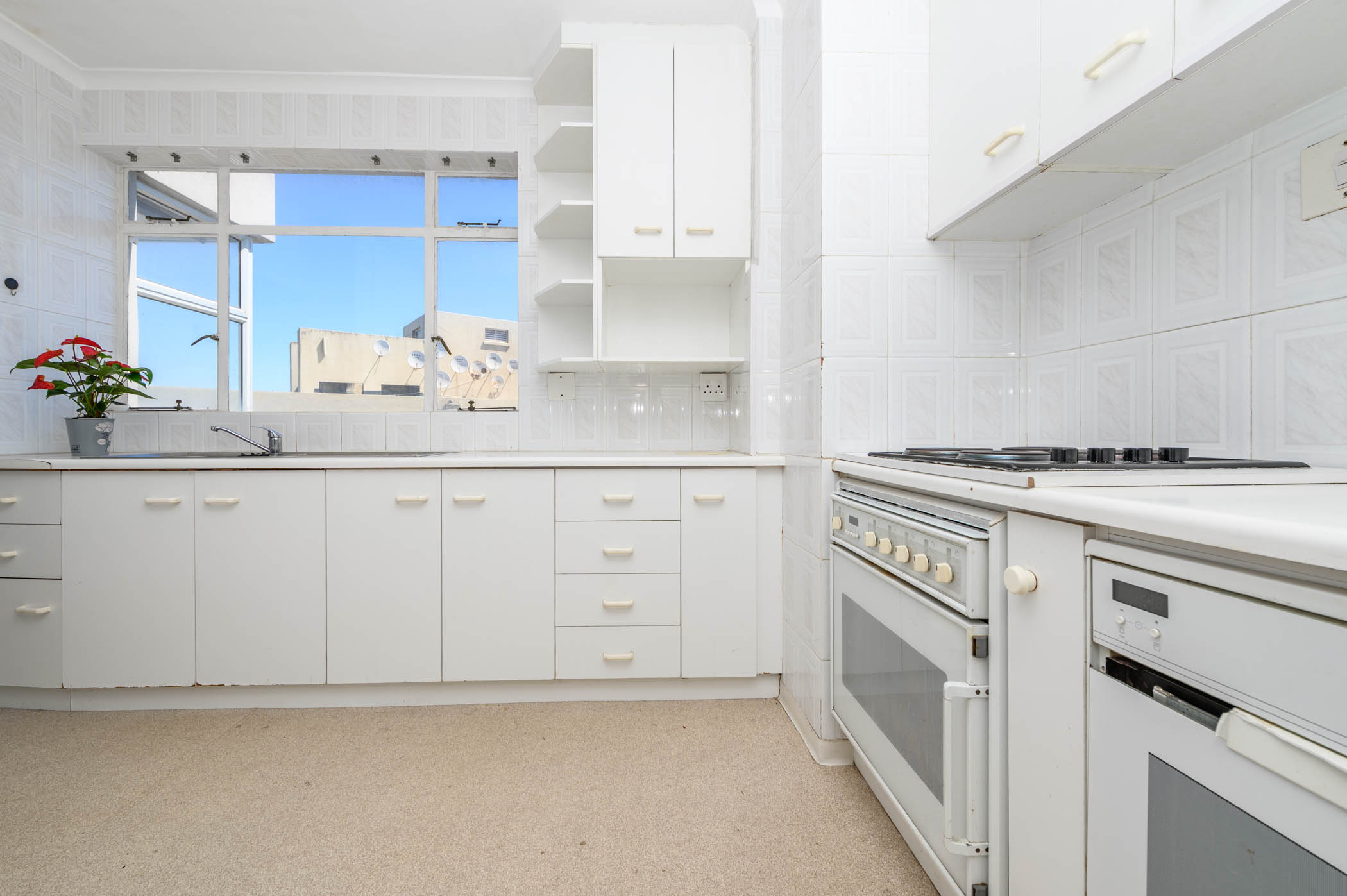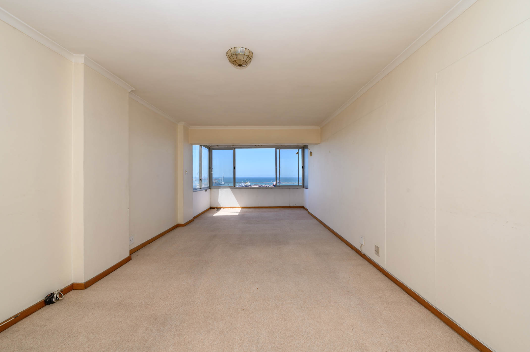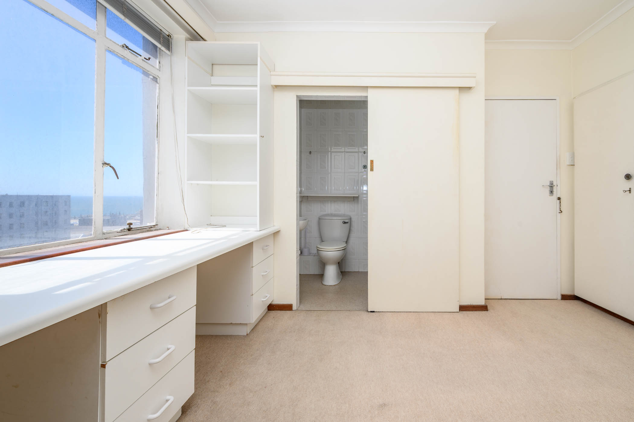 Both bedrooms are a good size, with the main bedroom benefiting from full harbour and sea views. Both bedrooms have built in cupboards with an extra set of cupboards in the passage area.