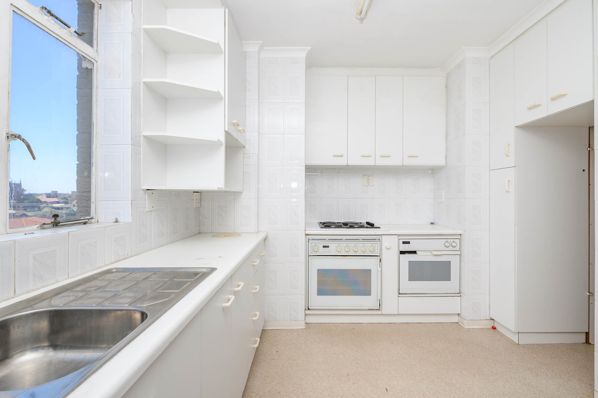 The kitchen boasts ample white cabinetry, good counter spaces, and a large window that invites natural light. It is equipped with an electric stovetop and oven.