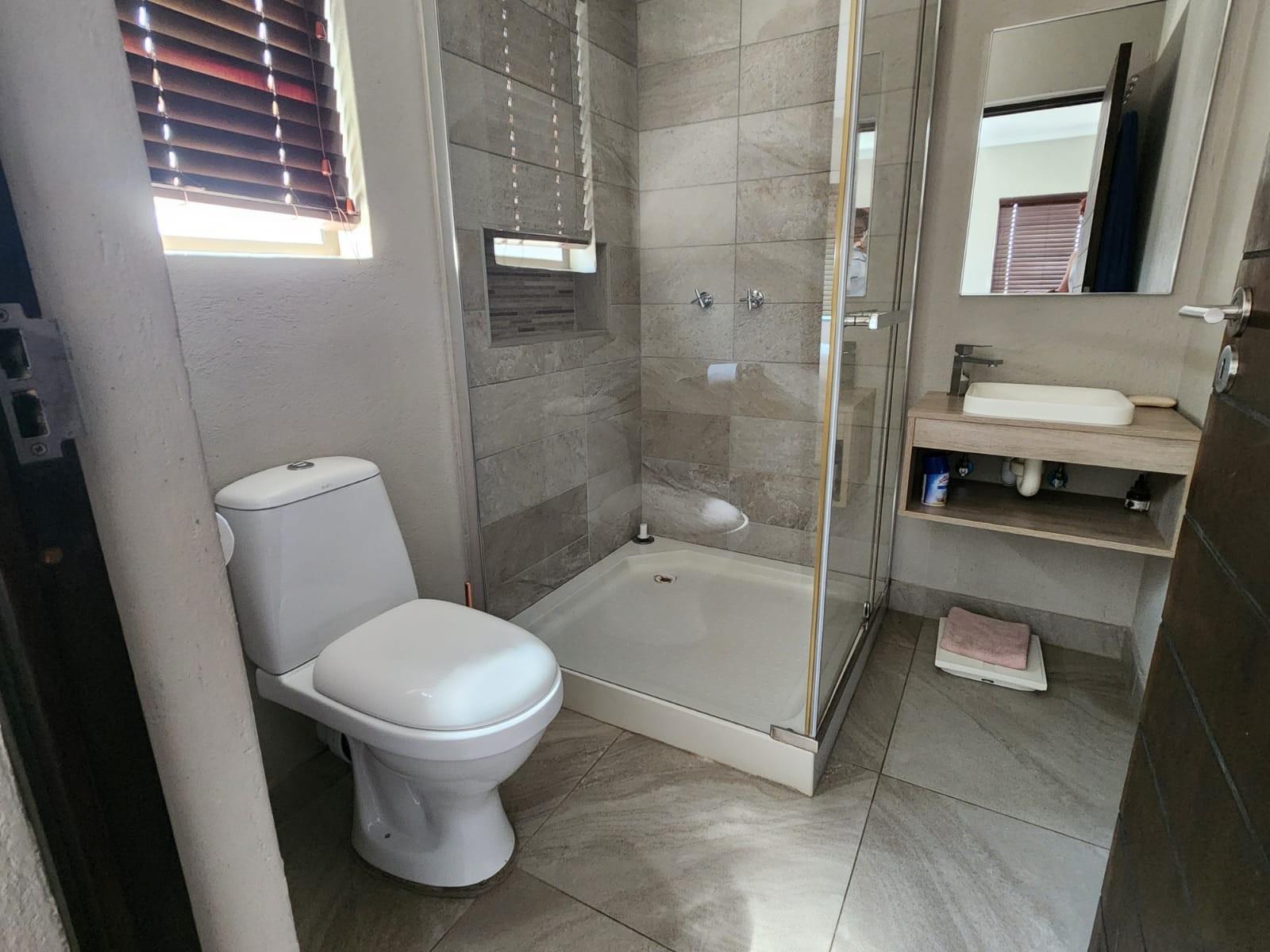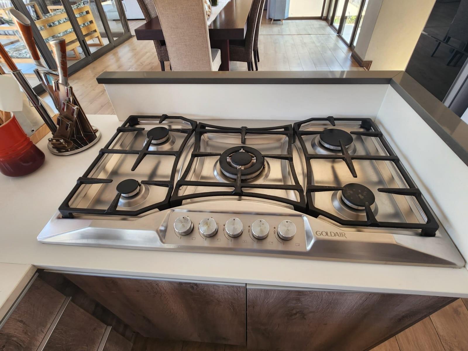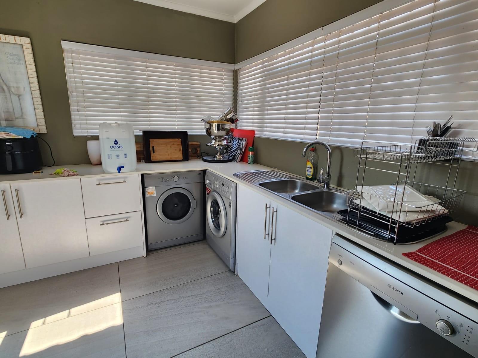 This modern designed home with accent on open areas and natural light has an easy flow from the kitchen to the lounge and outside patio. The kitchen has build-in appliances, lovely cupboard space; included is a fridge and freezer, microwave oven, oven, gas hob and oven. There is a scullery (with laundry) a bit separate.