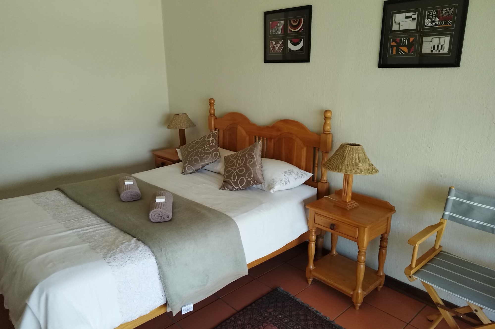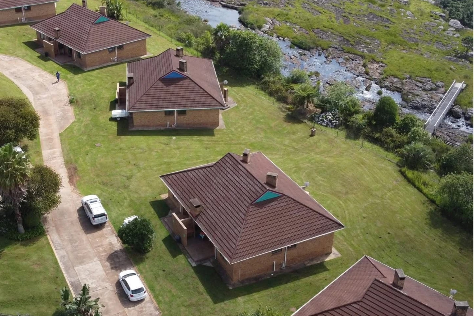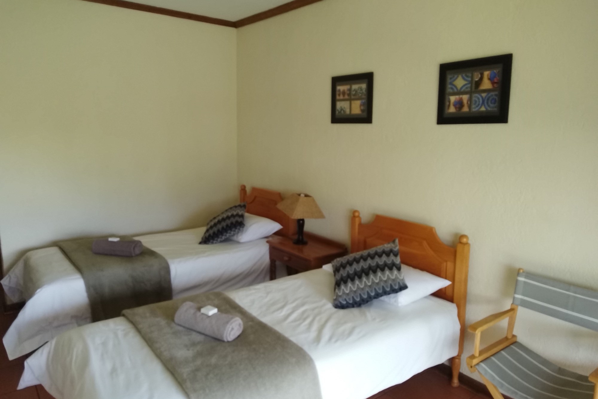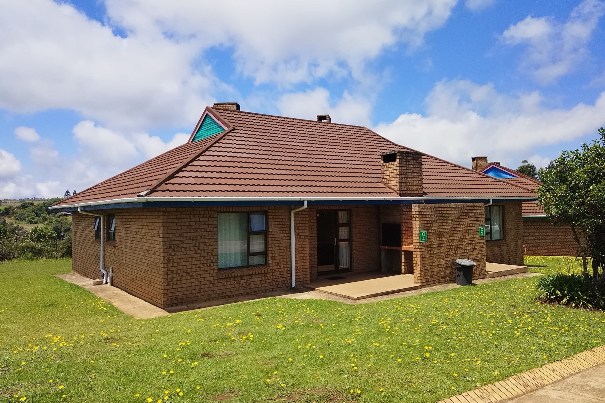 10 x 2 Bedroom Self-catering Chalets - Each chalet has: 2 bedrooms (one with double bed, other with 2 single beds, build-in cupboards, panel heater), 11⁄2 bathroom (one with shower, toilet, basin, other bath, basin), build-in cupboards, Fully Equipped kitchen (breakfast nook, hob, microwave, fridge/freezer, build-in cupboards, necessary cutlery, kettle, toaster), Living room (furnished, TV, fireplace); Braai facilities outside.