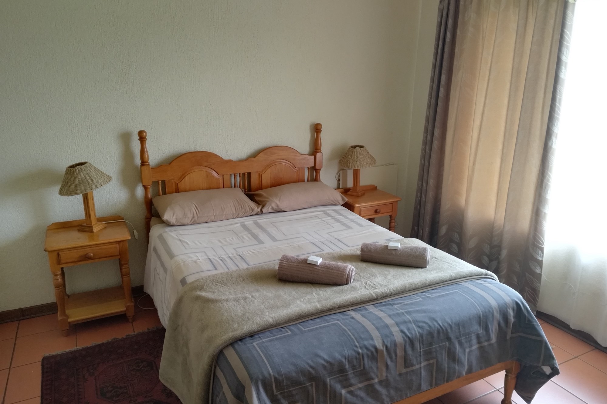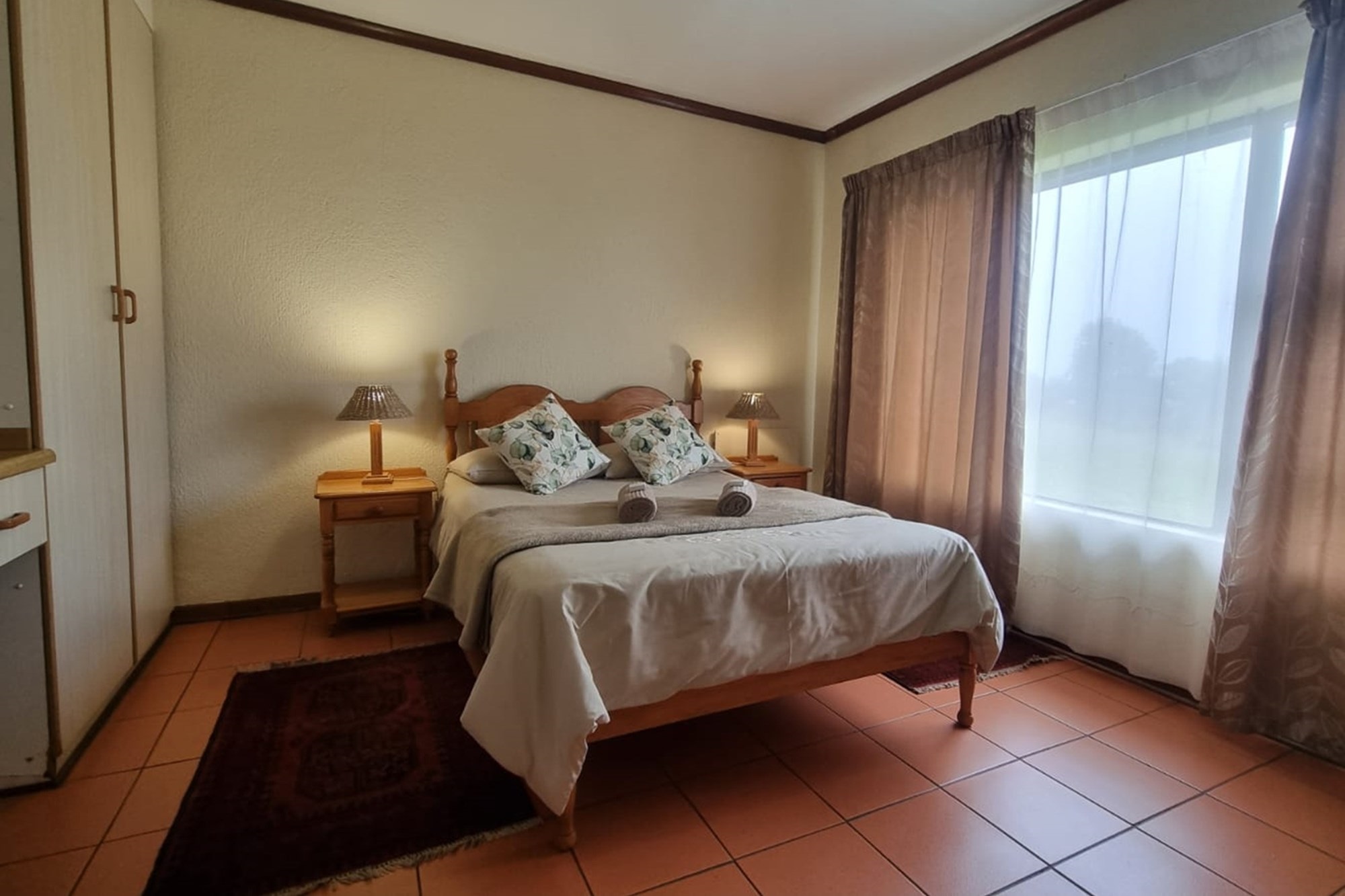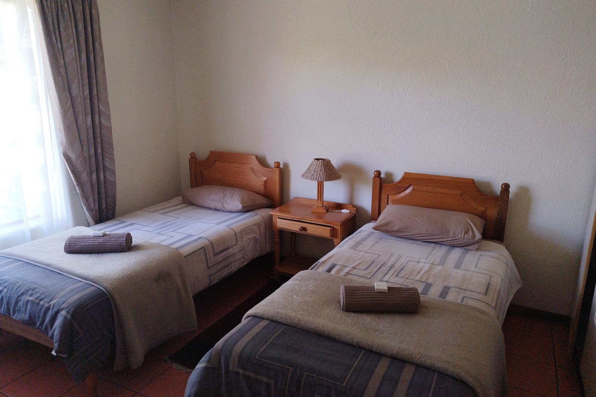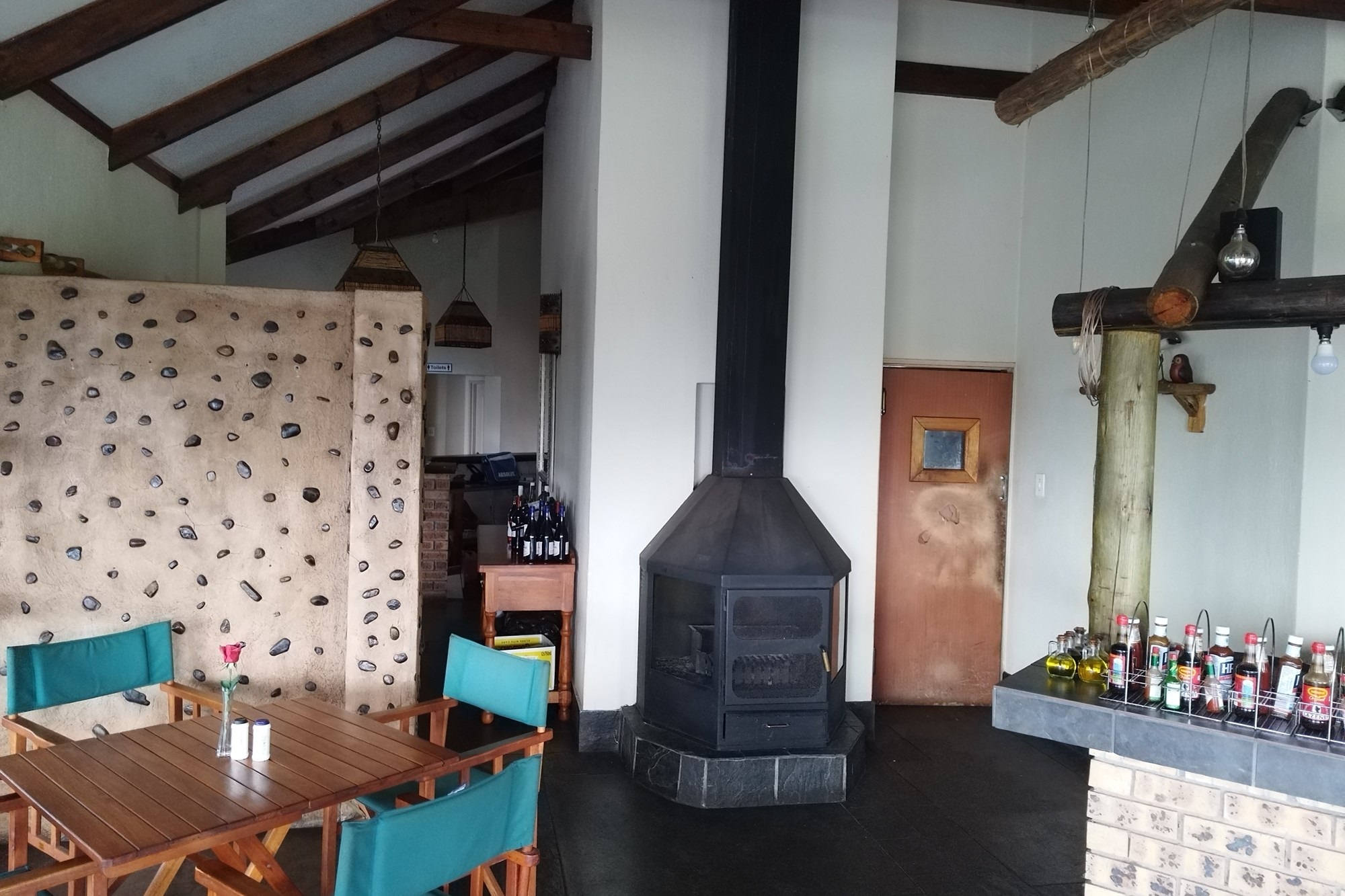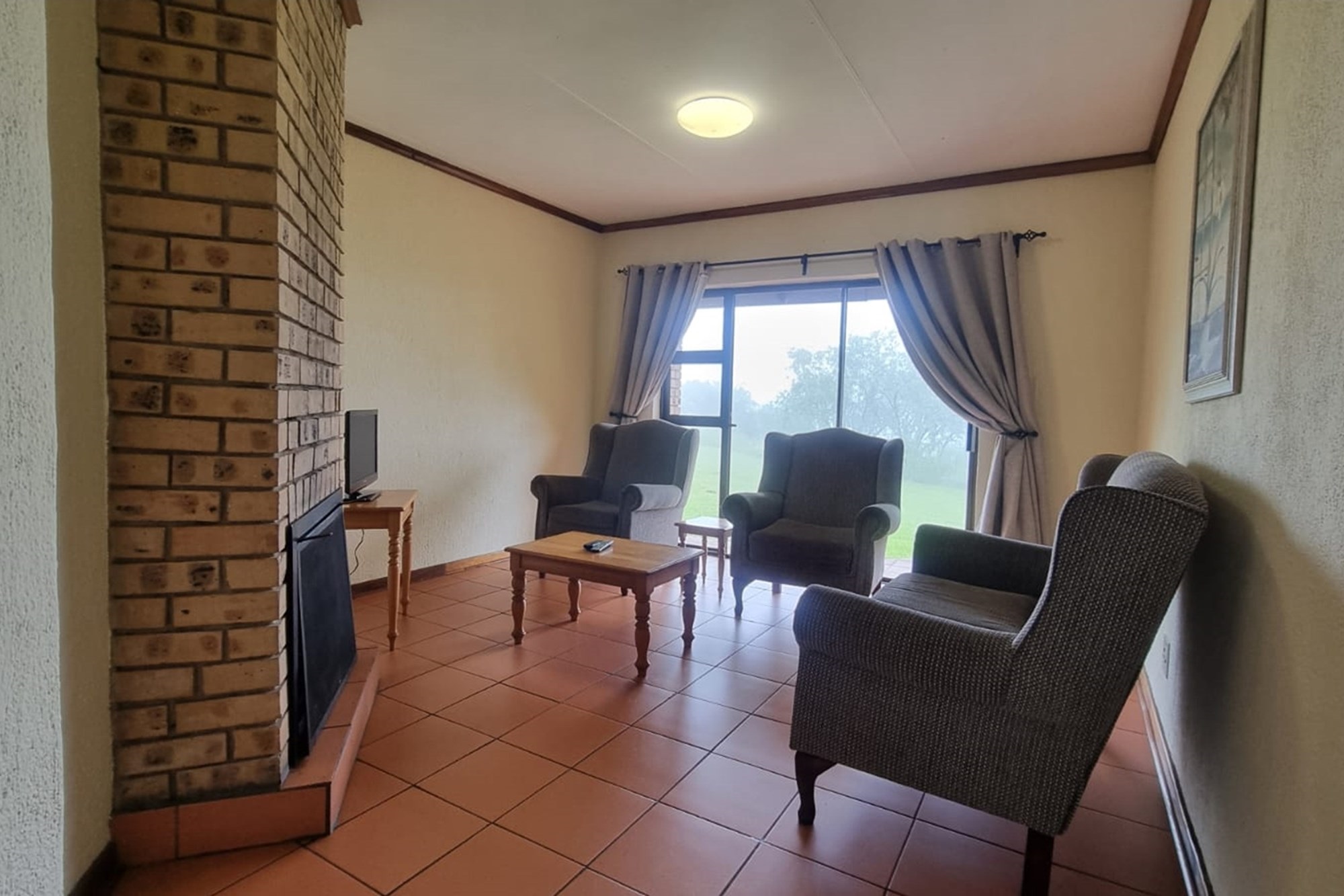 10 x 2 Bedroom Self-catering Chalets - Each chalet has: 2 bedrooms (one with double bed, other with 2 single beds, build-in cupboards, panel heater), 11⁄2 bathroom (one with shower, toilet, basin, other bath, basin), build-in cupboards, Fully Equipped kitchen (breakfast nook, hob, microwave, fridge/freezer, build-in cupboards, necessary cutlery, kettle, toaster), Living room (furnished, TV, fireplace); Braai facilities outside.