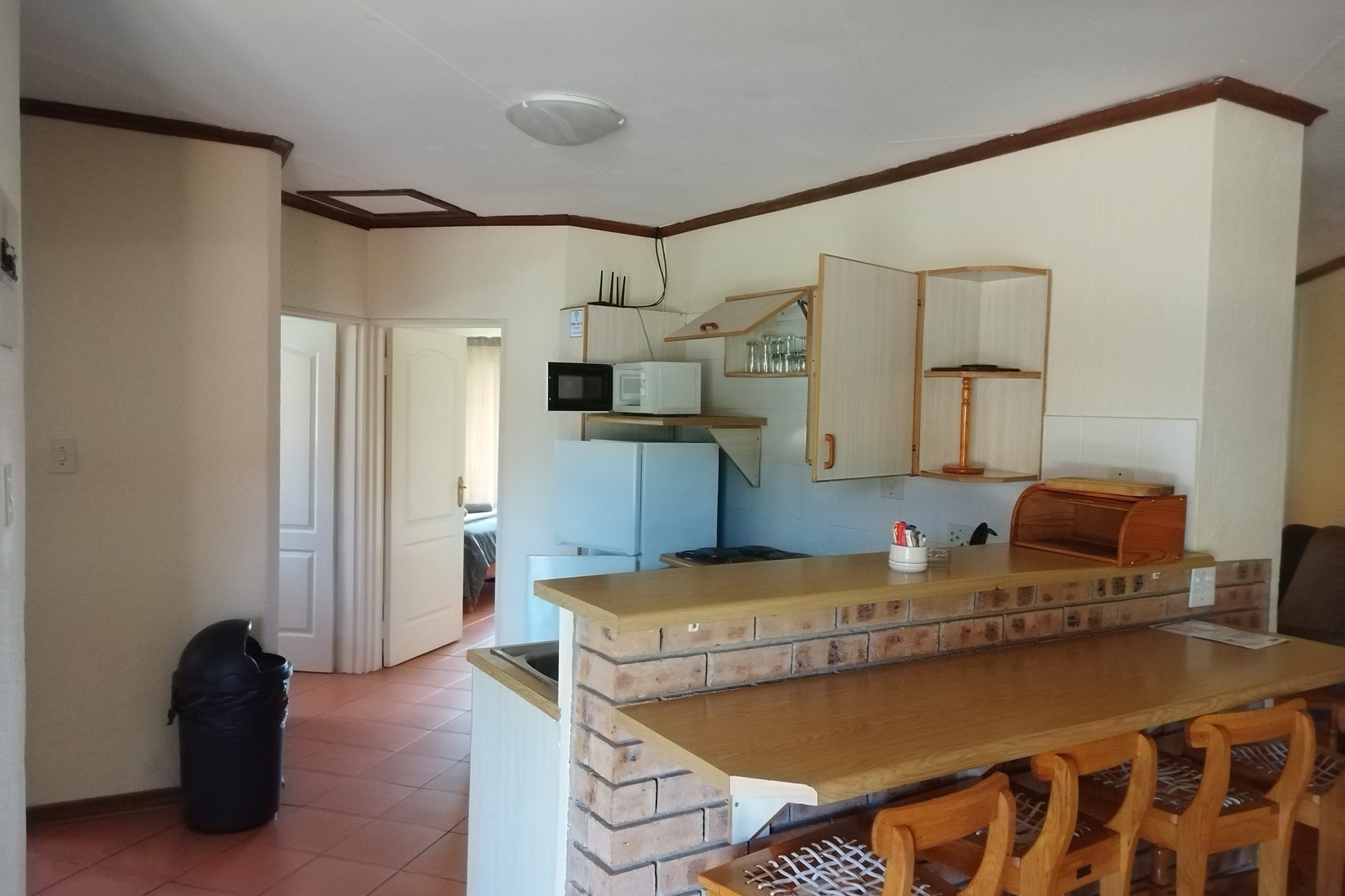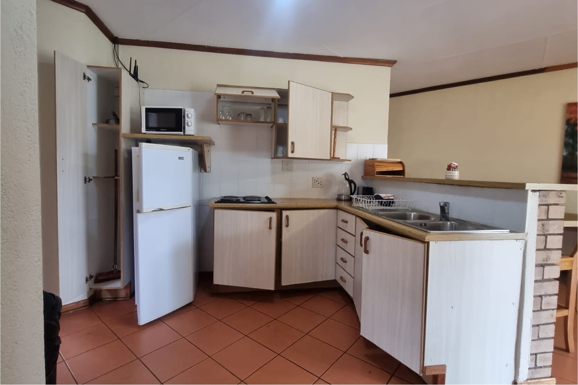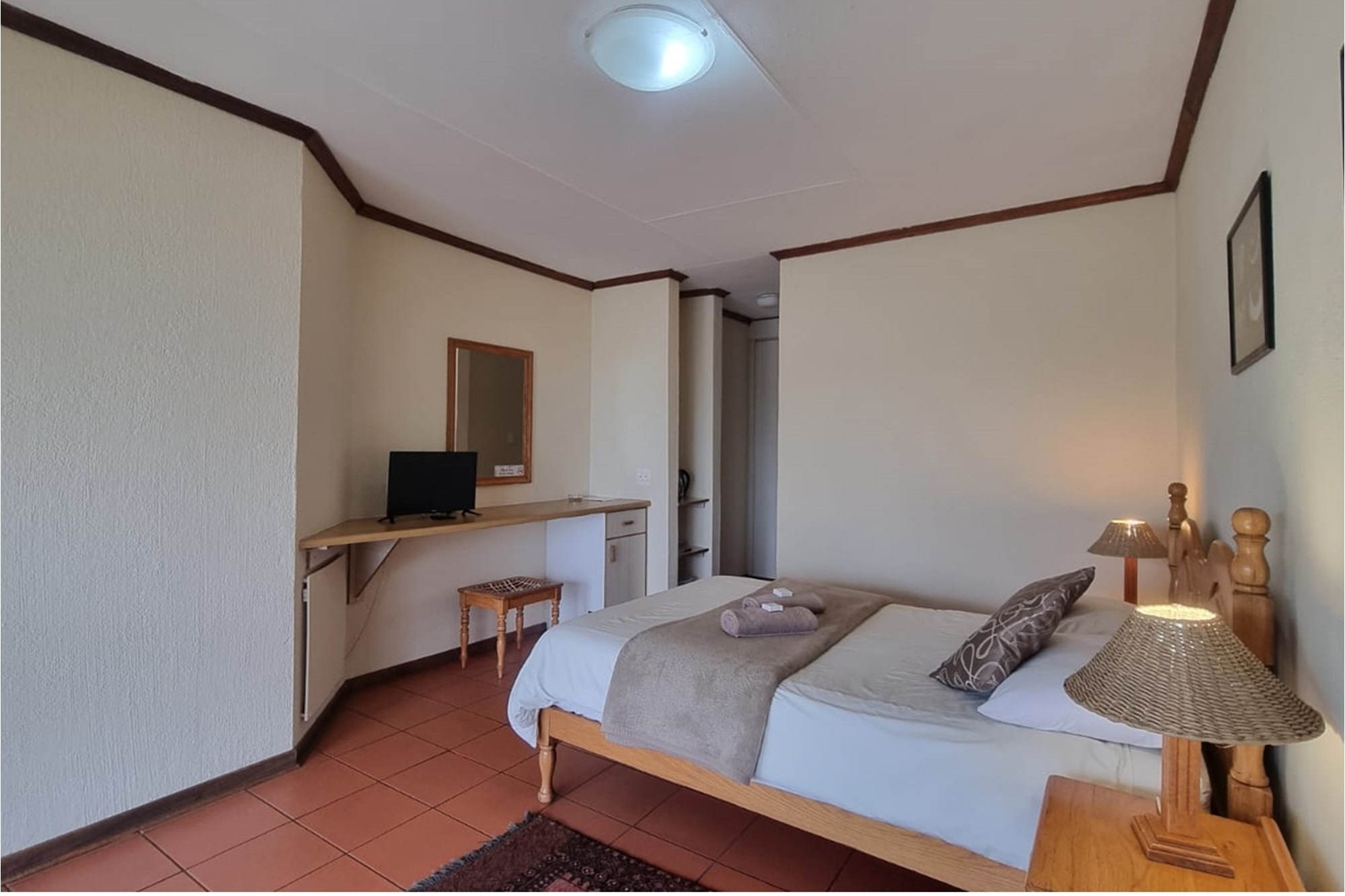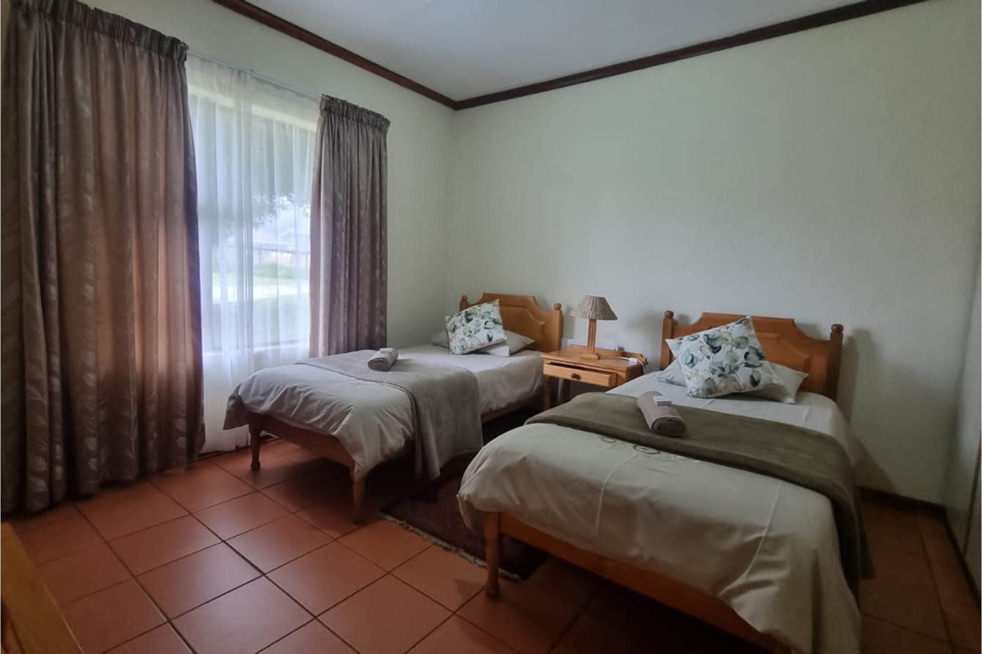 10 x 2 Bedroom Self-catering Chalets - Each chalet has: 2 bedrooms (one with double bed, other with 2 single beds, build-in cupboards, panel heater), 11⁄2 bathroom (one with shower, toilet, basin, other bath, basin), build-in cupboards, Fully Equipped kitchen (breakfast nook, hob, microwave, fridge/freezer, build-in cupboards, necessary cutlery, kettle, toaster), Living room (furnished, TV, fireplace); Braai facilities outside.