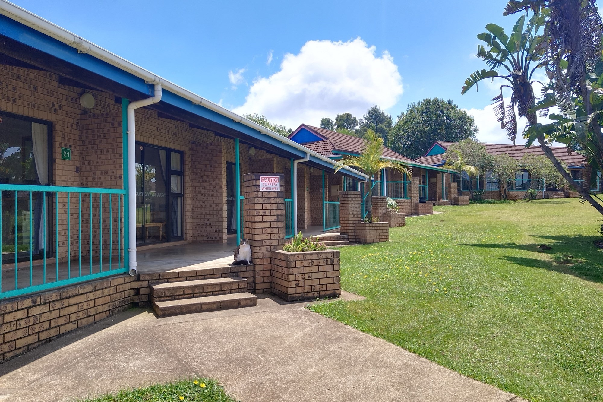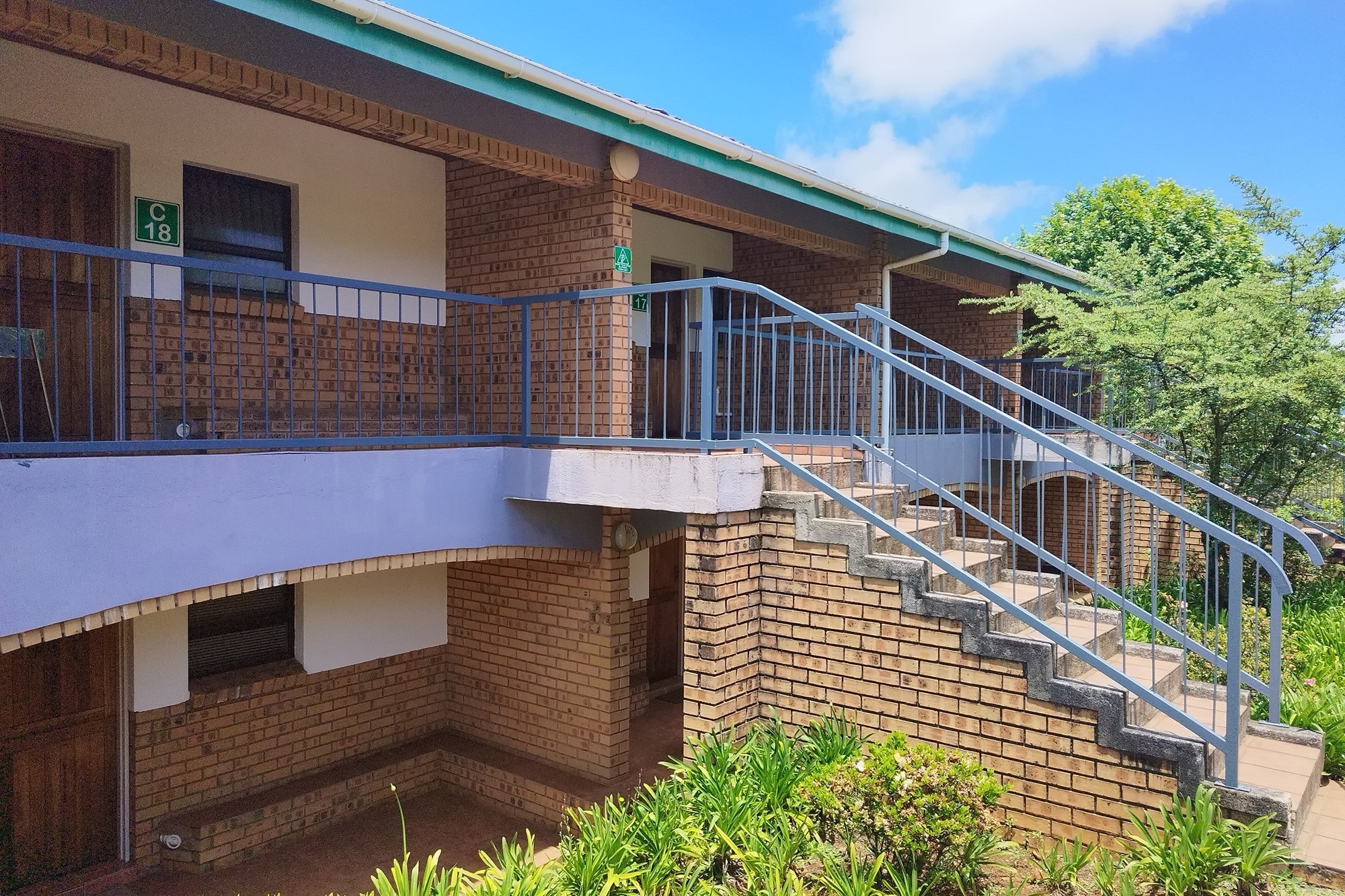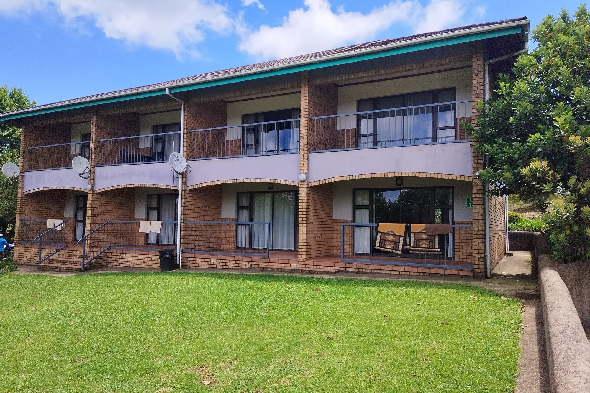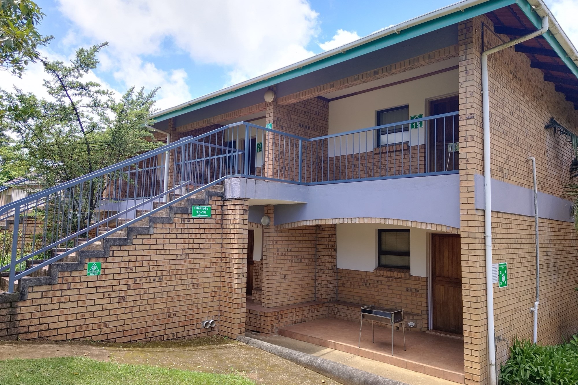 8 x One Bedroom Chalets(self catering) – Double storey building with 4 units on the top level and 4 units on the ground level. Each chalet has: Open plan bedroom (with queen bed), bathroom (shower, bath, toilet, basin), Equipped kitchenette (breakfast nook, hob, microwave, fridge/freezer, necessary cutlery, kettle, toaster), TV, panel heaters, Stoep/Balcony area.