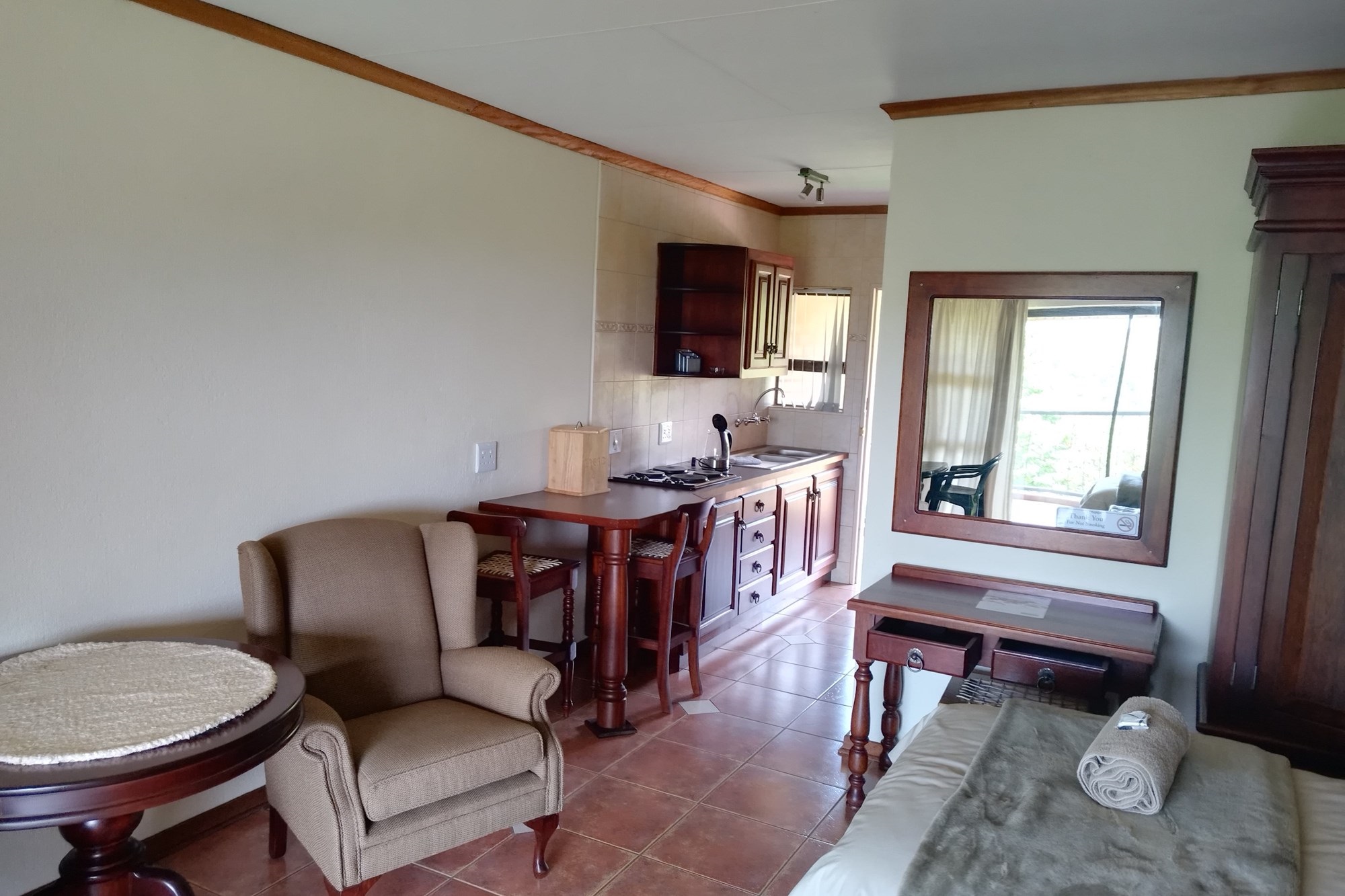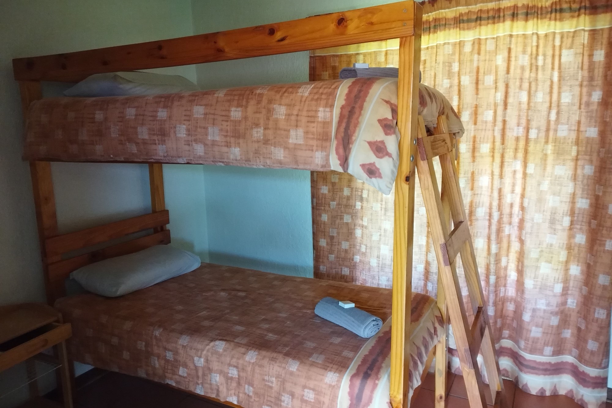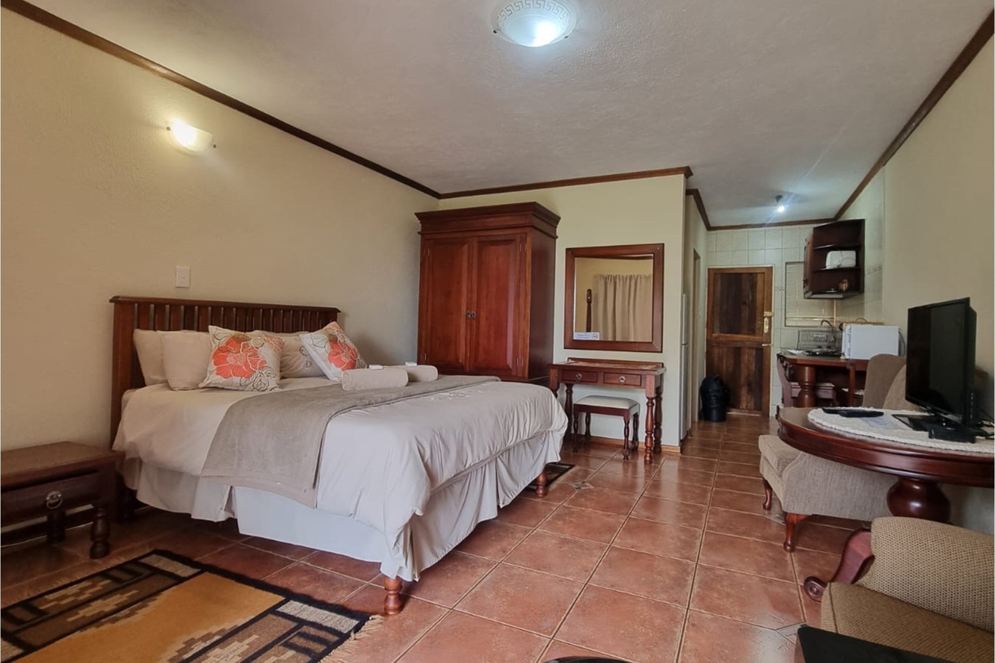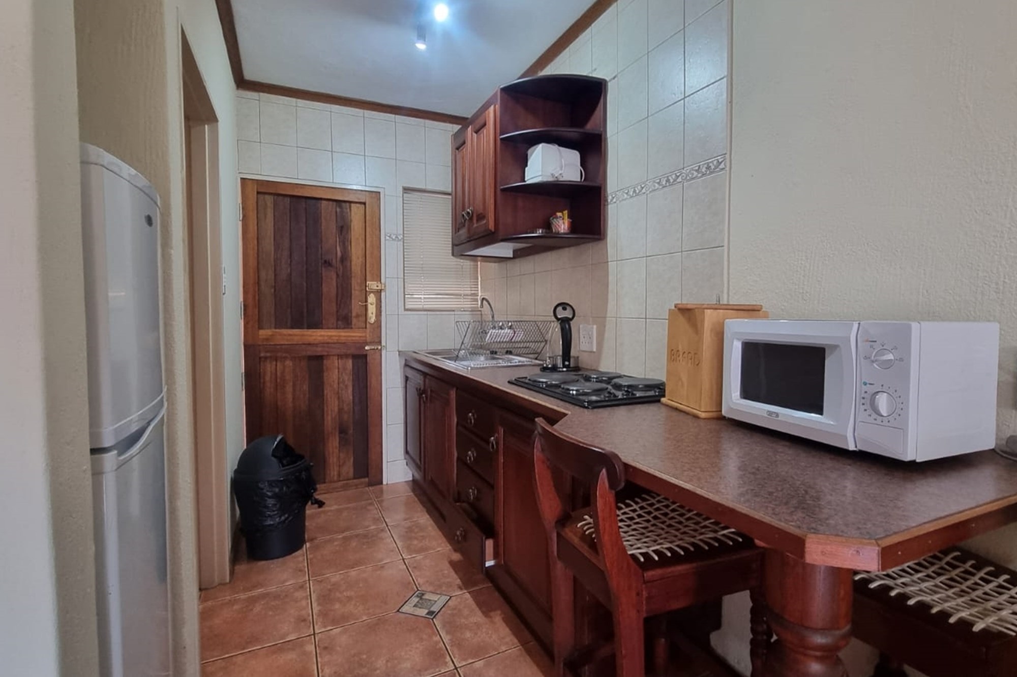 8 x One Bedroom Chalets(self catering) – Double storey building with 4 units on the top level and 4 units on the ground level. Each chalet has: Open plan bedroom (with queen bed), bathroom (shower, bath, toilet, basin), Equipped kitchenette (breakfast nook, hob, microwave, fridge/freezer, necessary cutlery, kettle, toaster), TV, panel heaters, Stoep/Balcony area.