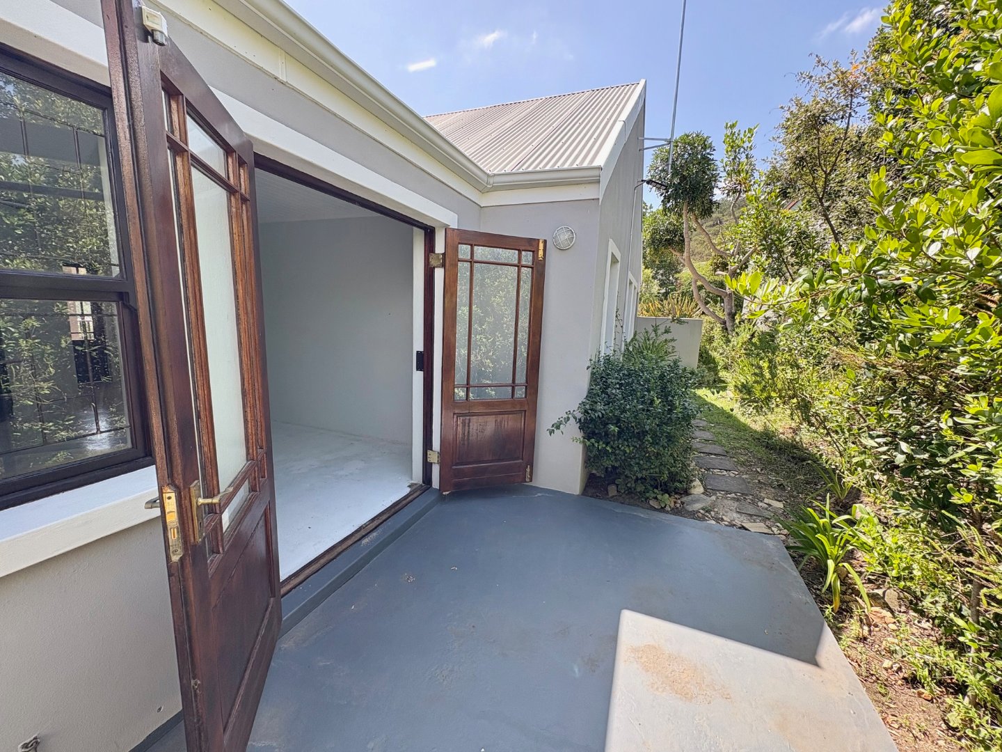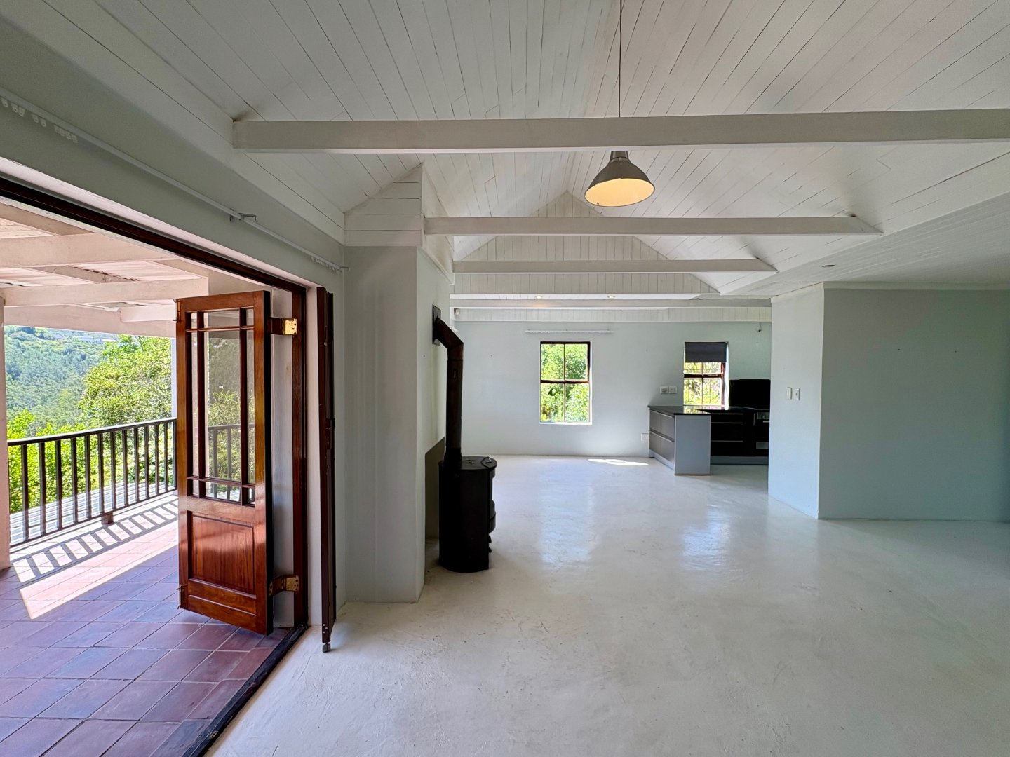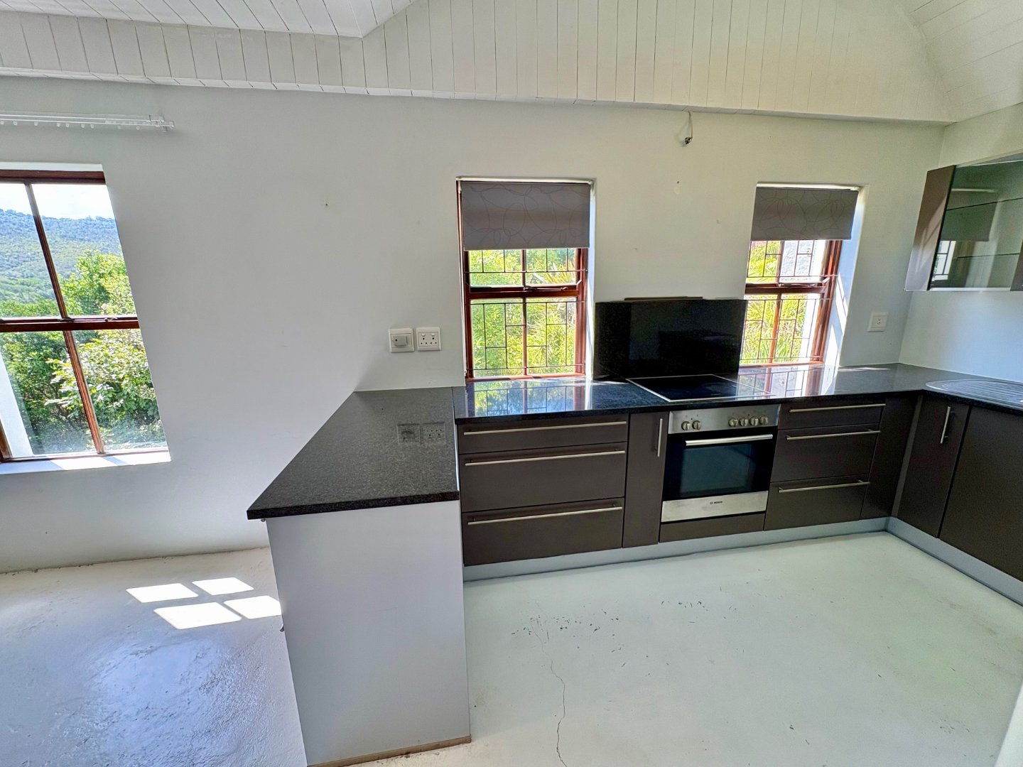 Step into the main level and you’re greeted by vaulted ceilings, exposed beams, and an airy open- plan layout that instantly feels like home. The lounge, dining area, and sleek modern kitchen flow effortlessly, with a wood burning stove adding warmth and character. Large glass doors open to the patio and garden, creating the perfect indoor outdoor lifestyle Knysna is known for. The main bedroom with en suite bathroom also enjoys direct garden access, making it a peaceful retreat.
