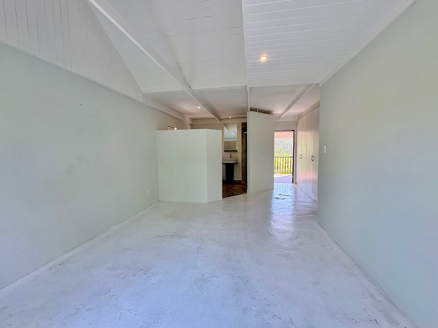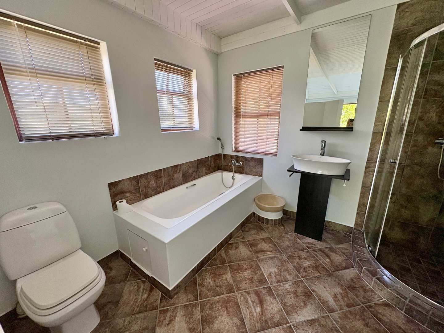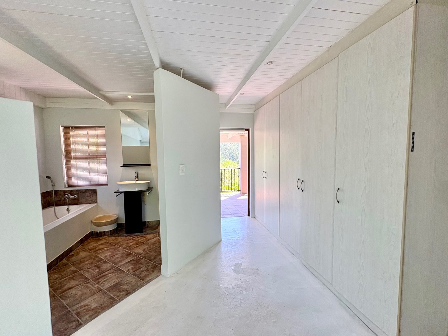 Step into the main level and you’re greeted by vaulted ceilings, exposed beams, and an airy open- plan layout that instantly feels like home. The lounge, dining area, and sleek modern kitchen flow effortlessly, with a wood burning stove adding warmth and character. Large glass doors open to the patio and garden, creating the perfect indoor outdoor lifestyle Knysna is known for. The main bedroom with en suite bathroom also enjoys direct garden access, making it a peaceful retreat.