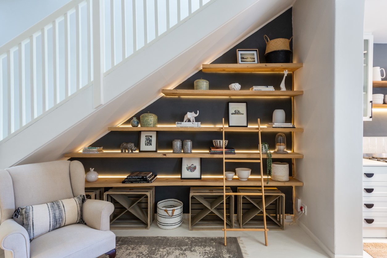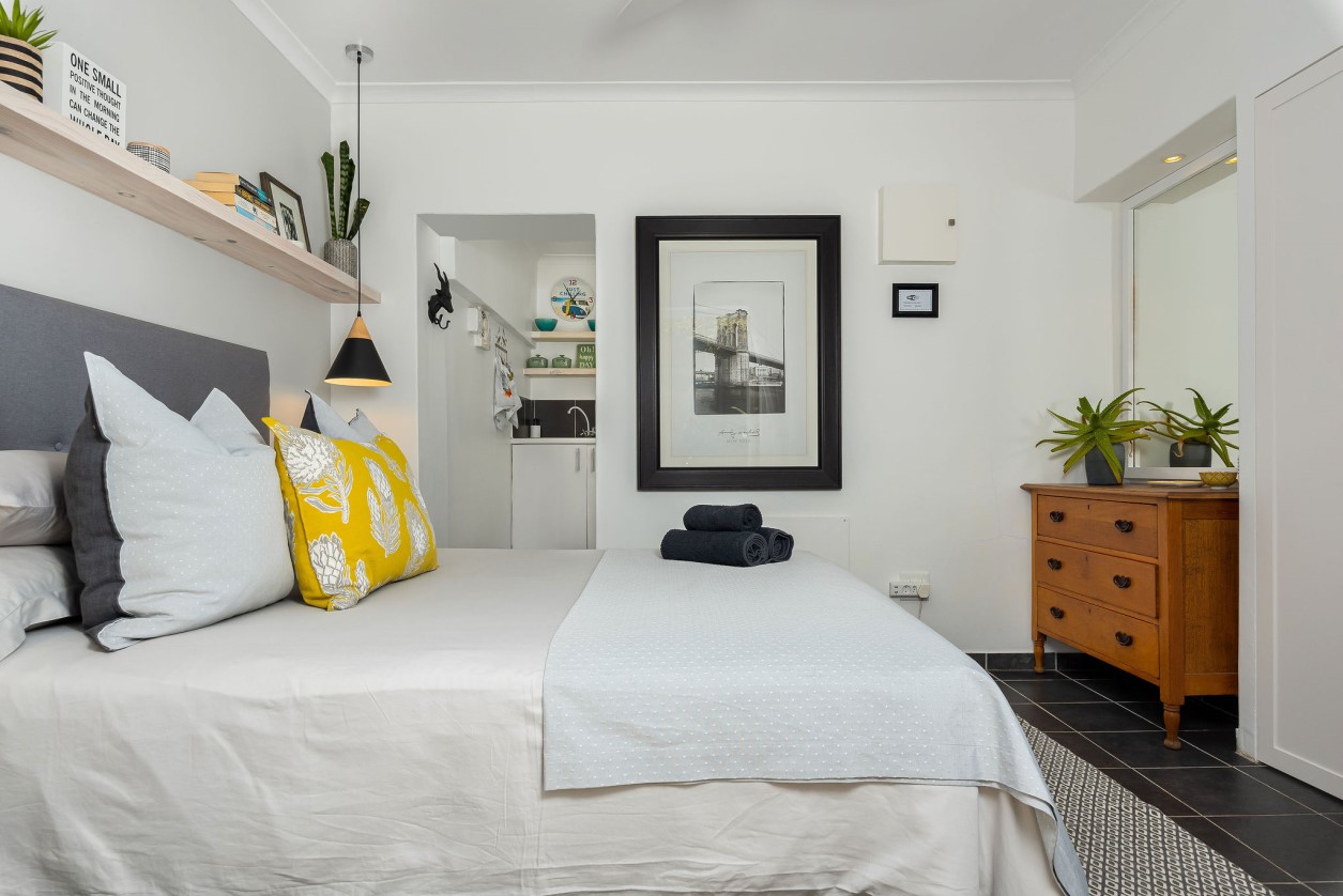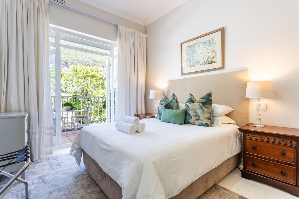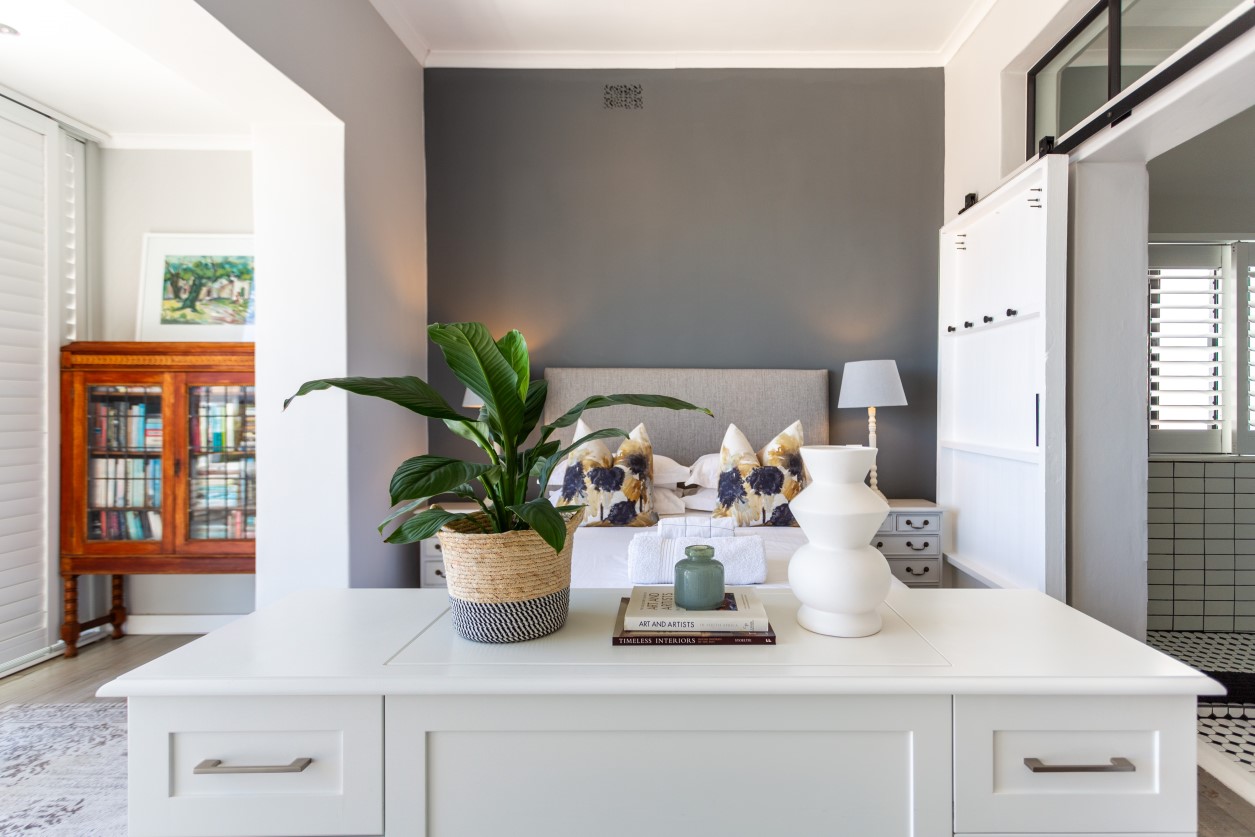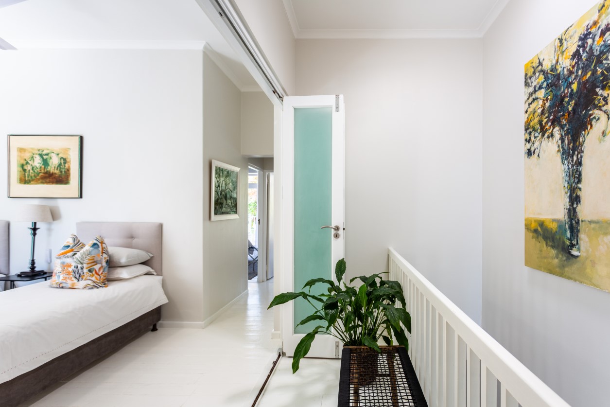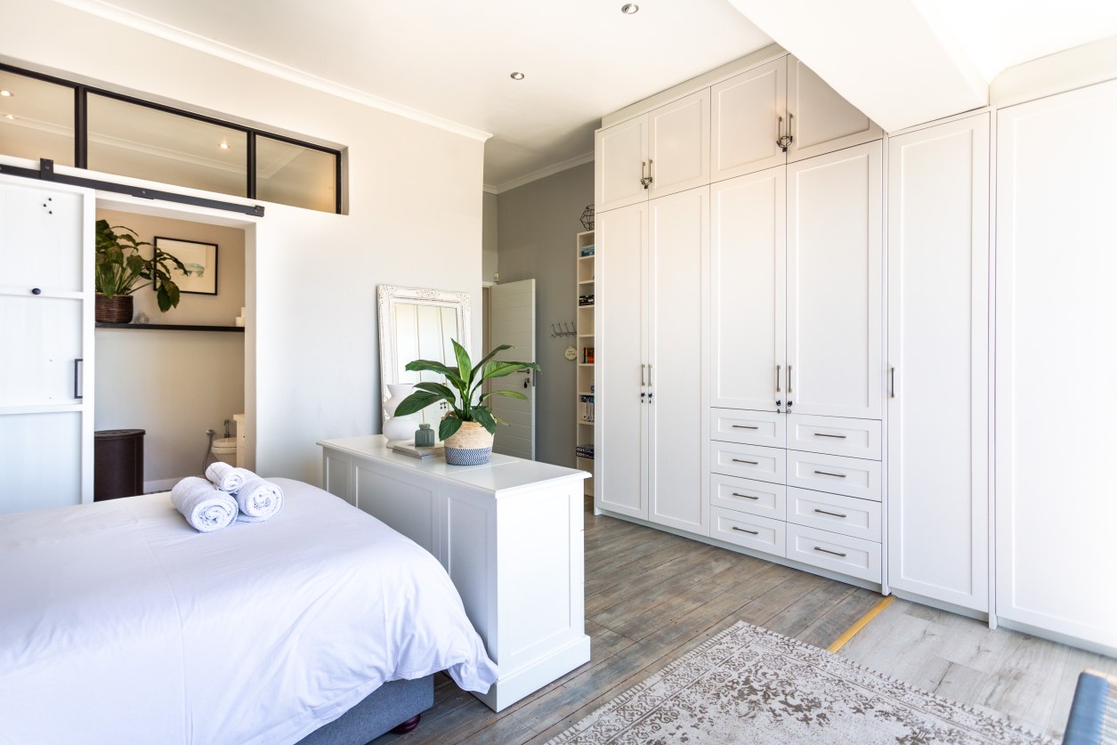 A striking white wooden staircase leads to the upper floor, where the main en-suite bedroom enjoys abundant northern light and opens through folding doors to captivating views over the roof tops towards the sea. Two additional en-suite bedrooms extend onto a balcony that overlooks Signal Hill, while a large loft-style bedroom with twin beds adds versatility for guests or family.