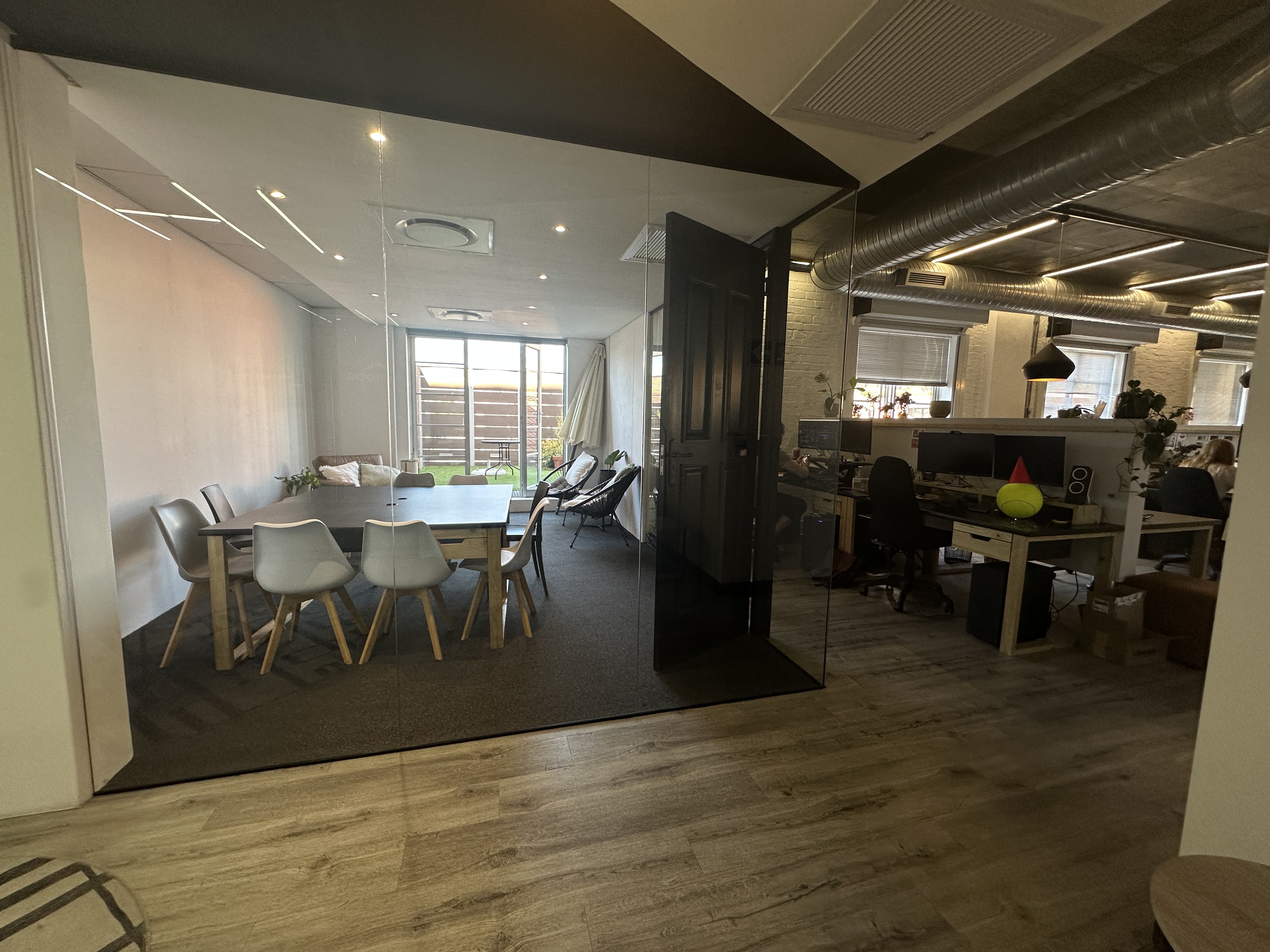 The internal layout comprises a welcoming entrance, a small boardroom, a spacious open-plan section, and two equal-sized glass-partitioned offices. The unit also includes a modern fitted kitchenette, a compact server/storage room, and a private 14m2 balcony—perfect for staff breaks or informal meetings.