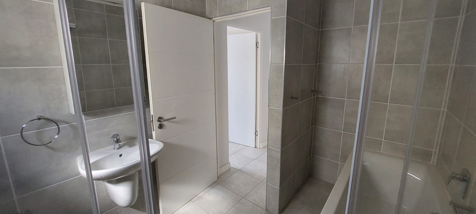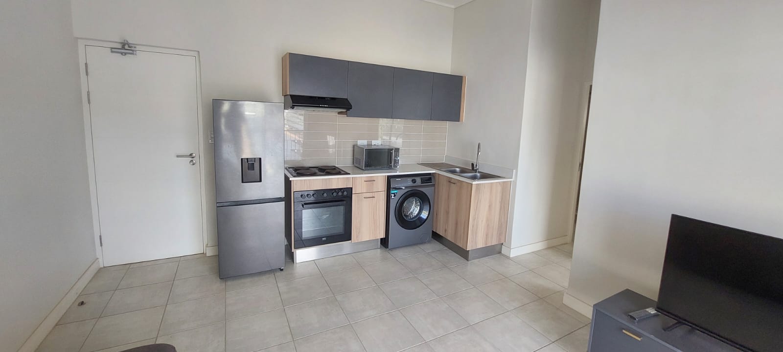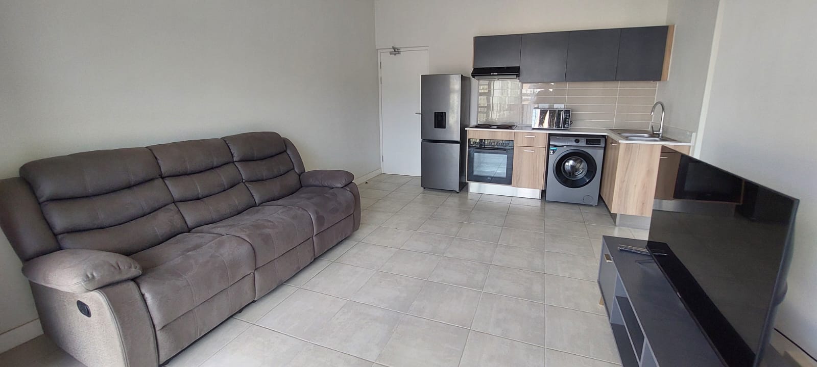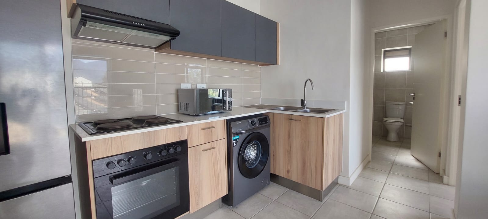 The modern kitchen is both stylish and practical, showcasing a blend of wood-look finishes and darker cabinetry complemented by quality fittings. The generously sized bedroom provides ample built-in cupboard space, while the contemporary bathroom includes a spacious glass-enclosed walk-in shower and a lovely bath to relax in.
