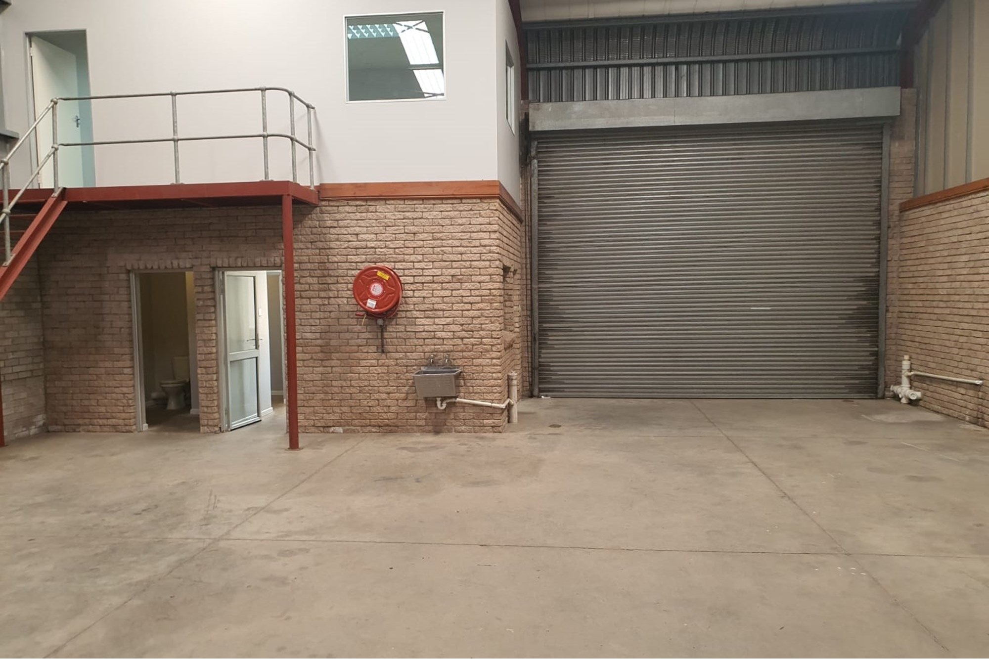 The unit includes a modern, air-conditioned reception area with a kitchen and toilet, as well as a separate toilet and basin within the warehouse section. A spacious mezzanine office provides an elevated view of the floor, ideal for overseeing operations.