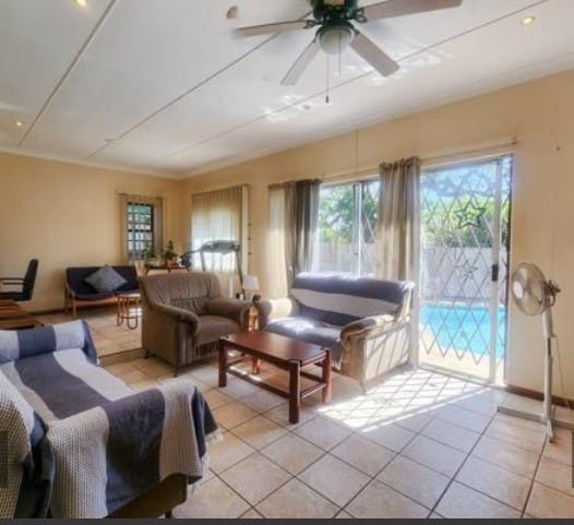 The property features a spacious open-plan lounge and dining room, perfect for entertaining or relaxing with family. This space seamlessly flows out to a sparkling pool and a covered entertainment area with a built-in braai, making it ideal for year-round enjoyment.