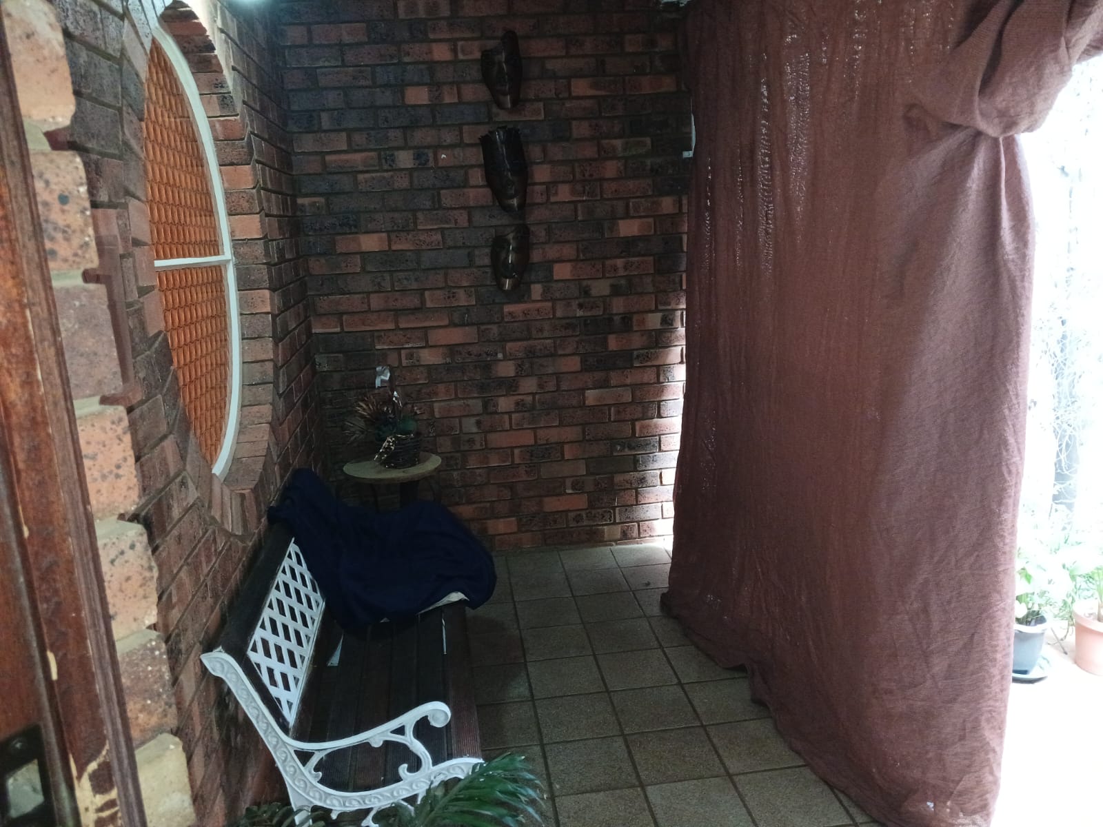 An enclosed patio with sliding doors that open onto a beautiful garden and a dedicated braai area