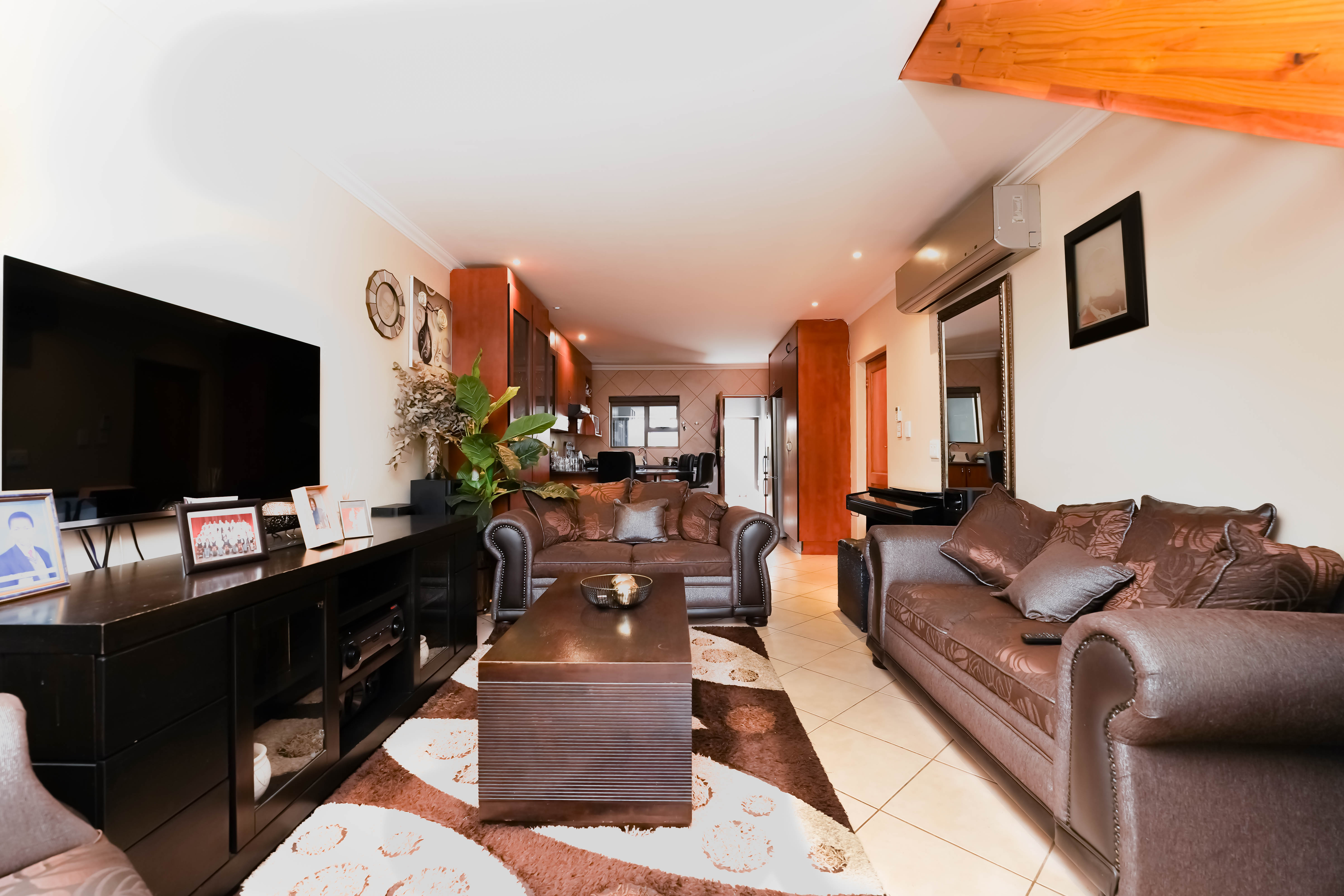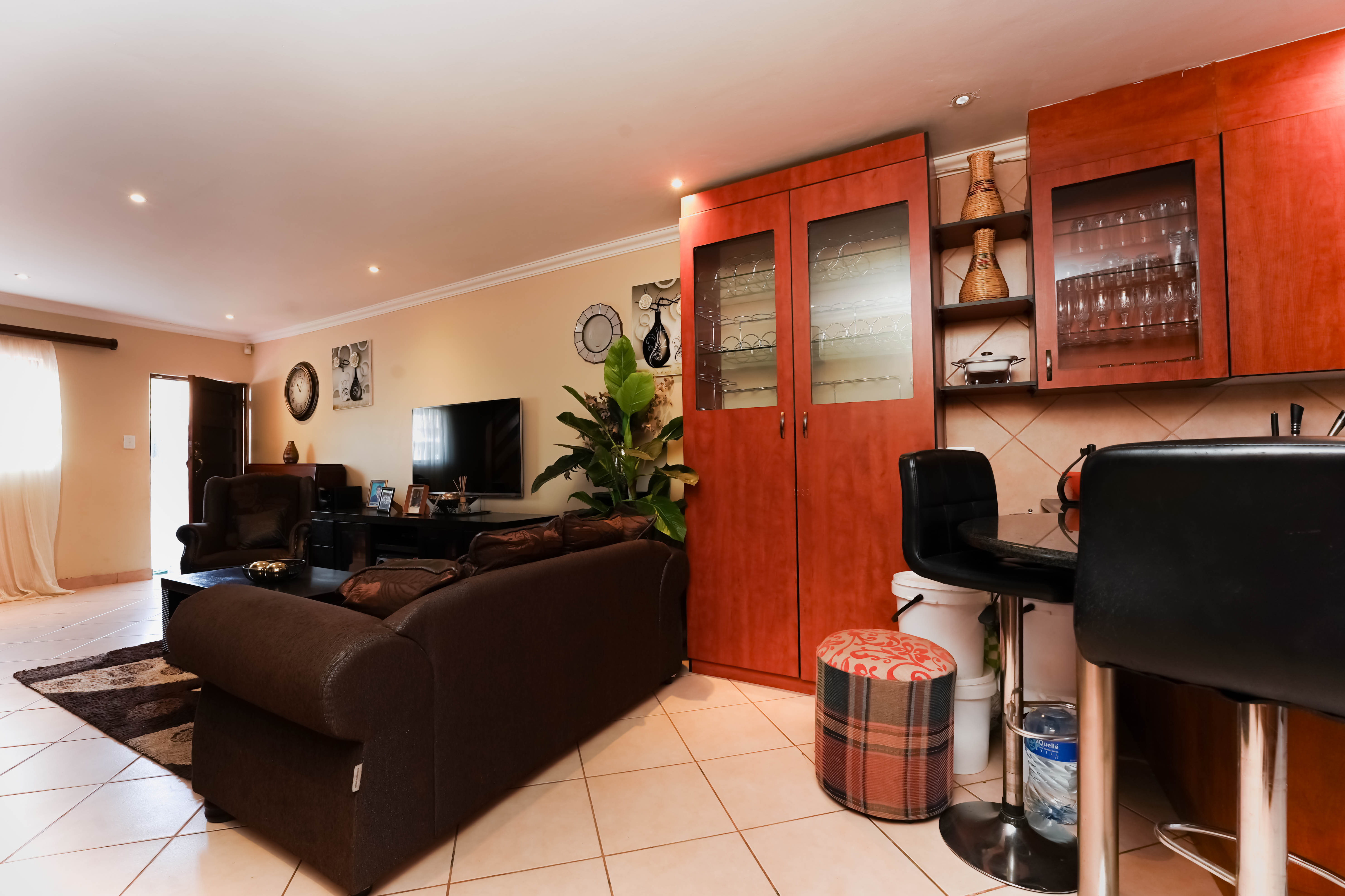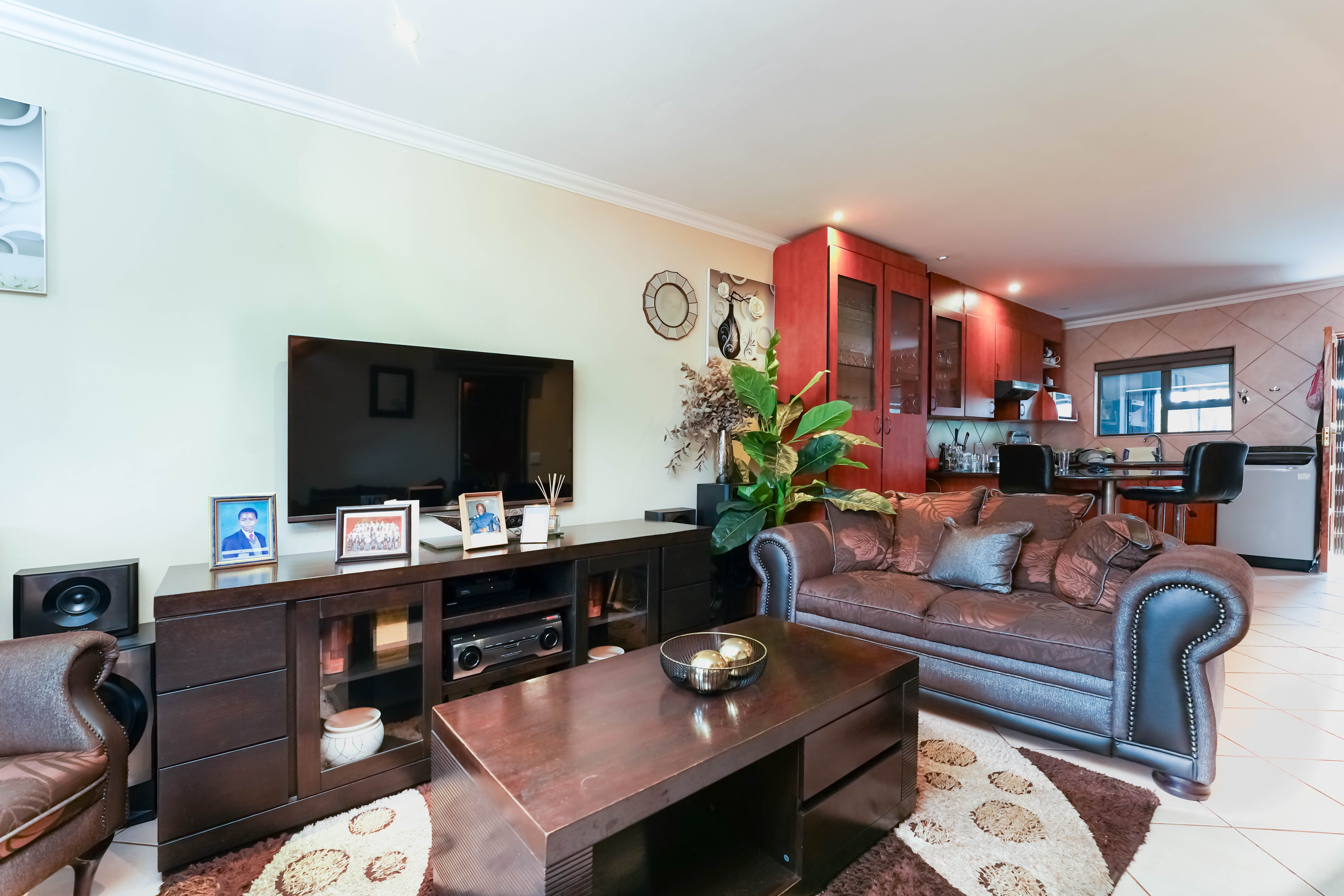 Entrance through the front door leads you to open plan tiled lounge area to kitchen, neat breakfast nook with ample rosewood finish cupboards. Plenty packing space.