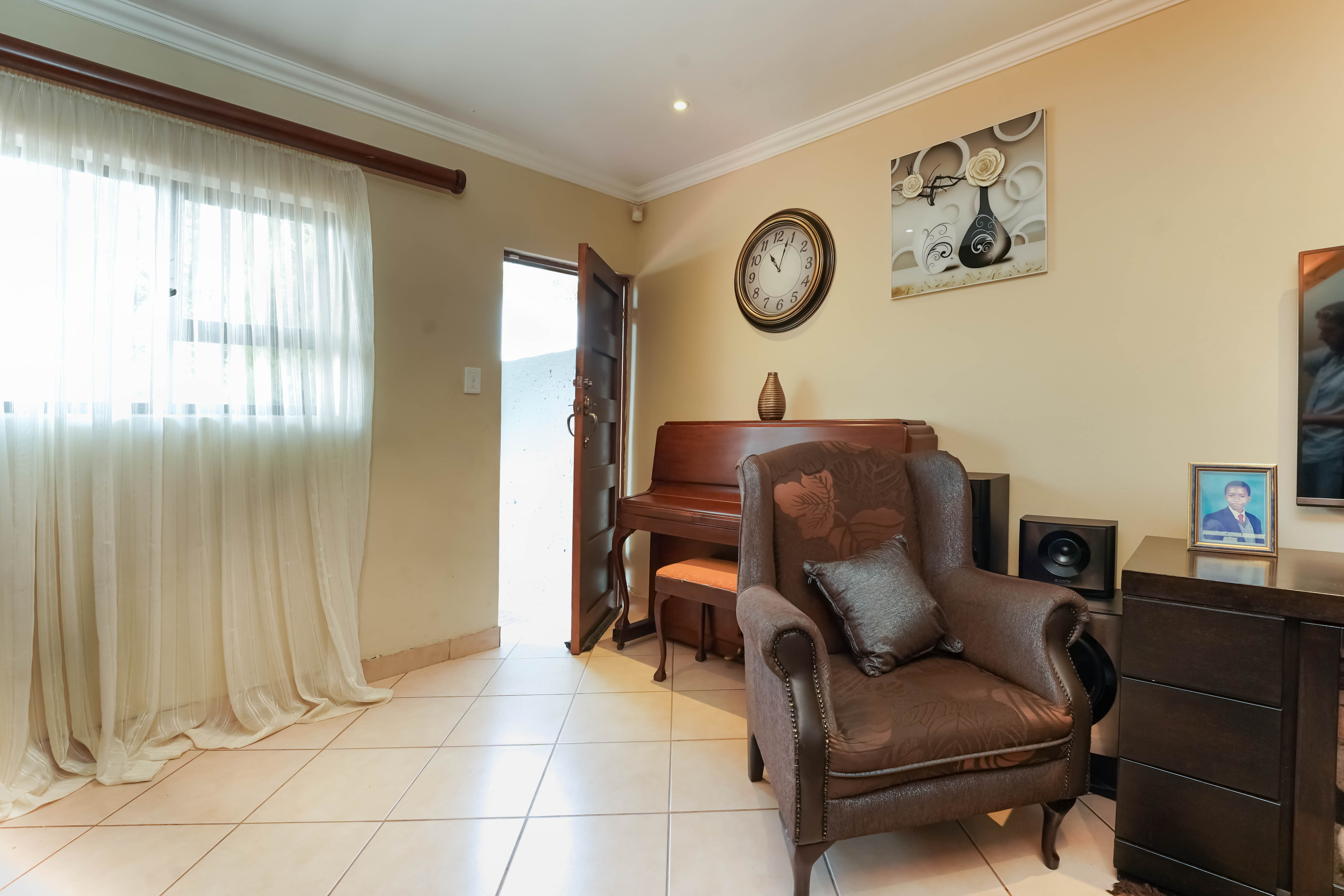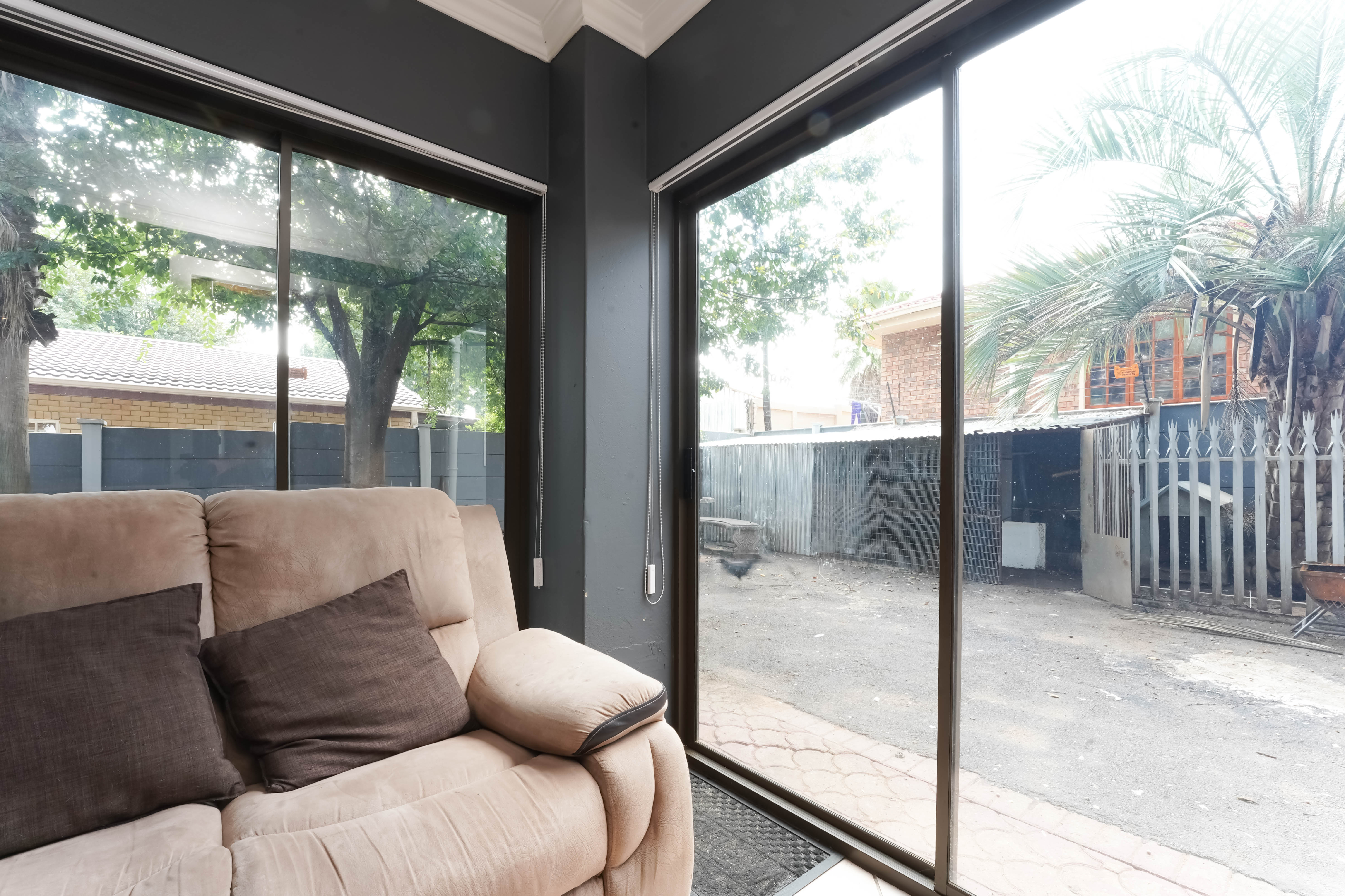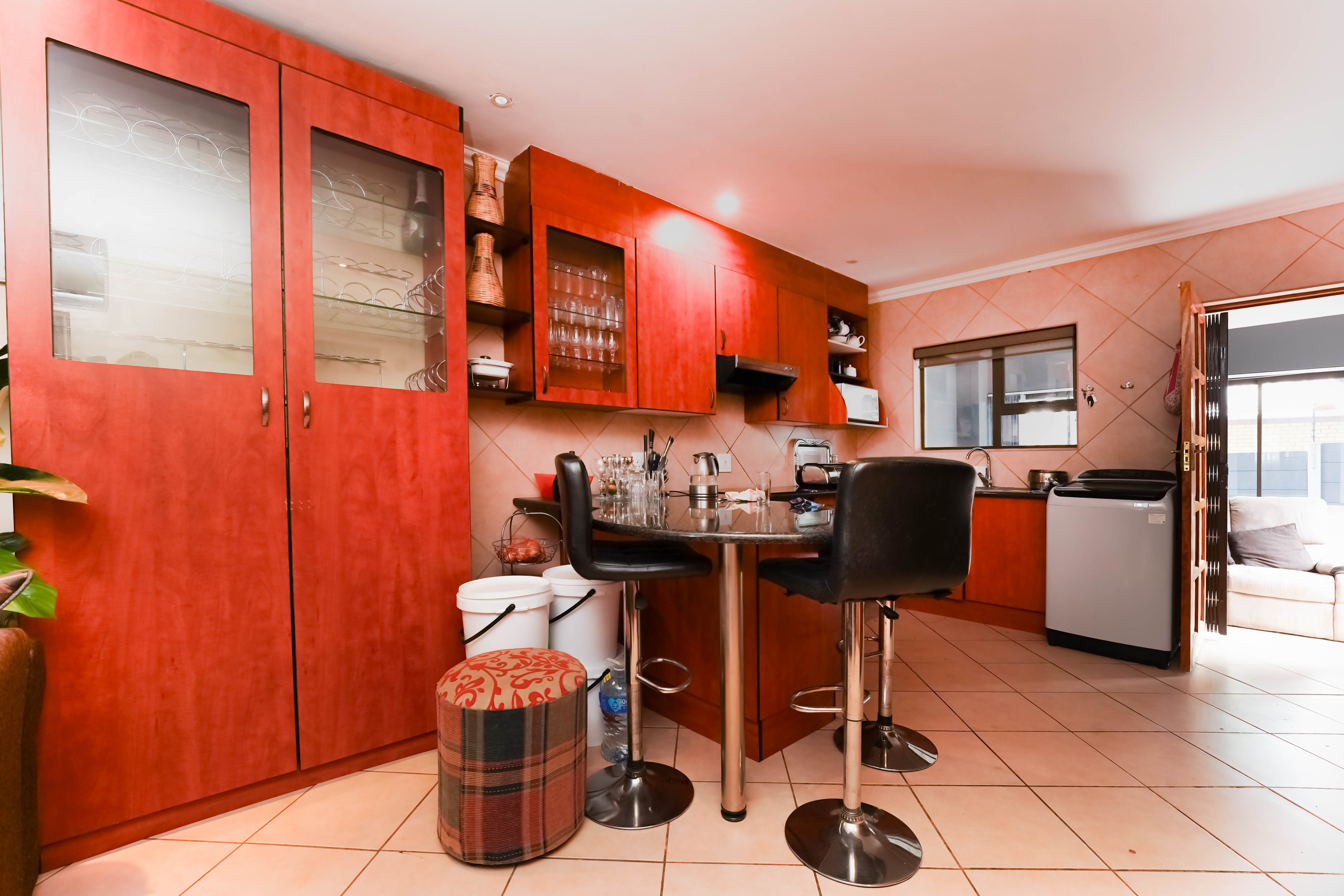 Entrance through the front door leads you to open plan tiled lounge area to kitchen, neat breakfast nook with ample rosewood finish cupboards. Plenty packing space.
