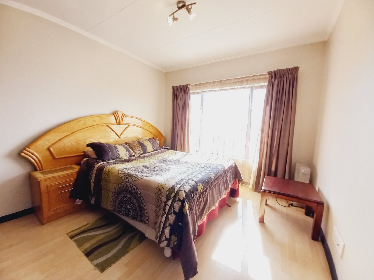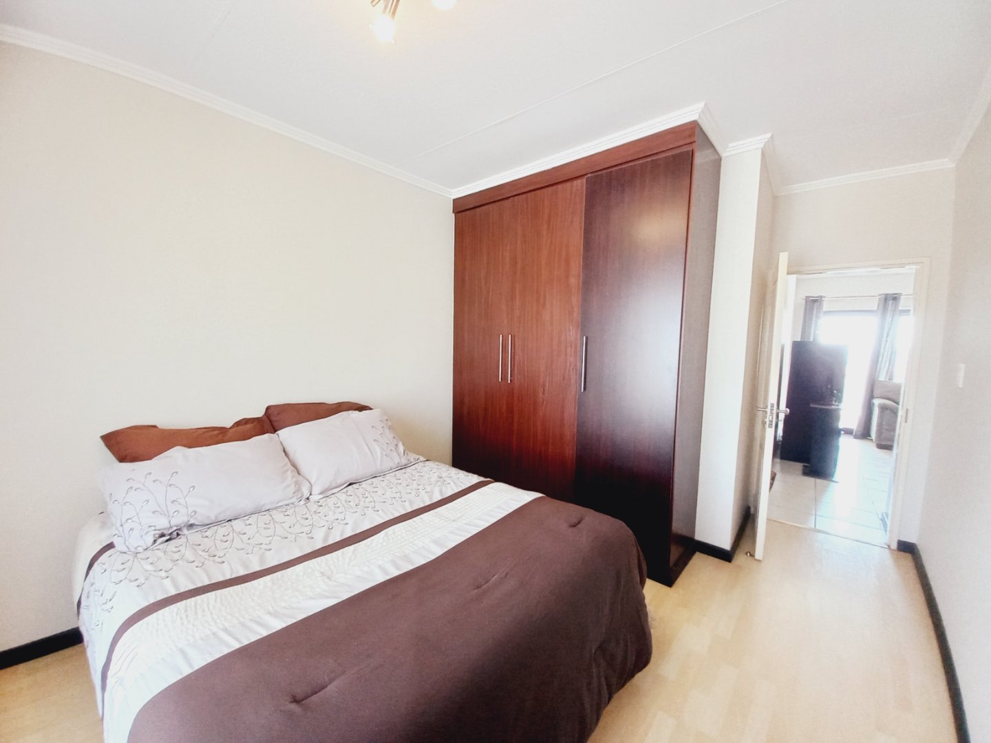 Bedrooms & Baths: Two sunny bedrooms with laminated floors and generous cupboards; stylish family bath (shower, bath, basin, toilet) plus main en-suite (shower, basin, toilet) and handy guest cloakroom