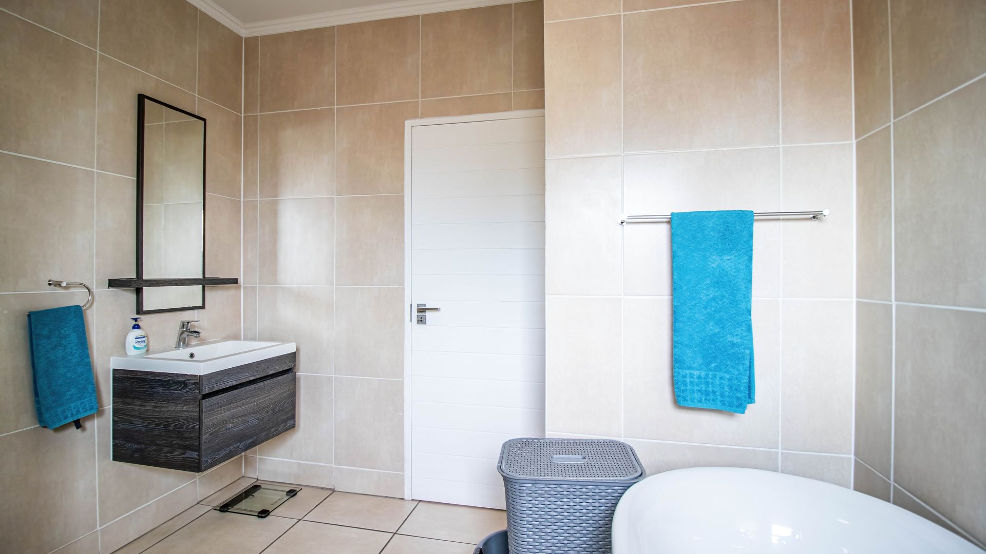 This neat unit boasts an open-plan living area that flows out to a large, partially covered patio, making it an inviting space for both relaxation and entertainment. The contemporary kitchen features elegant Caesarstone countertops, built-in cupboards, and appliances. The main bedroom has an en-suite bathroom, fitted with a shower. Both bedrooms comprise ample cupboard space. The 2nd bathroom is a full bathroom with modern finishes.