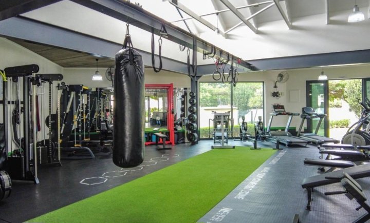 Elite Fitness Centre: A commercial-grade gym ("Attitude Fitness") featuring a functional training turf, boxing station, and comprehensive strength and cardio equipment.