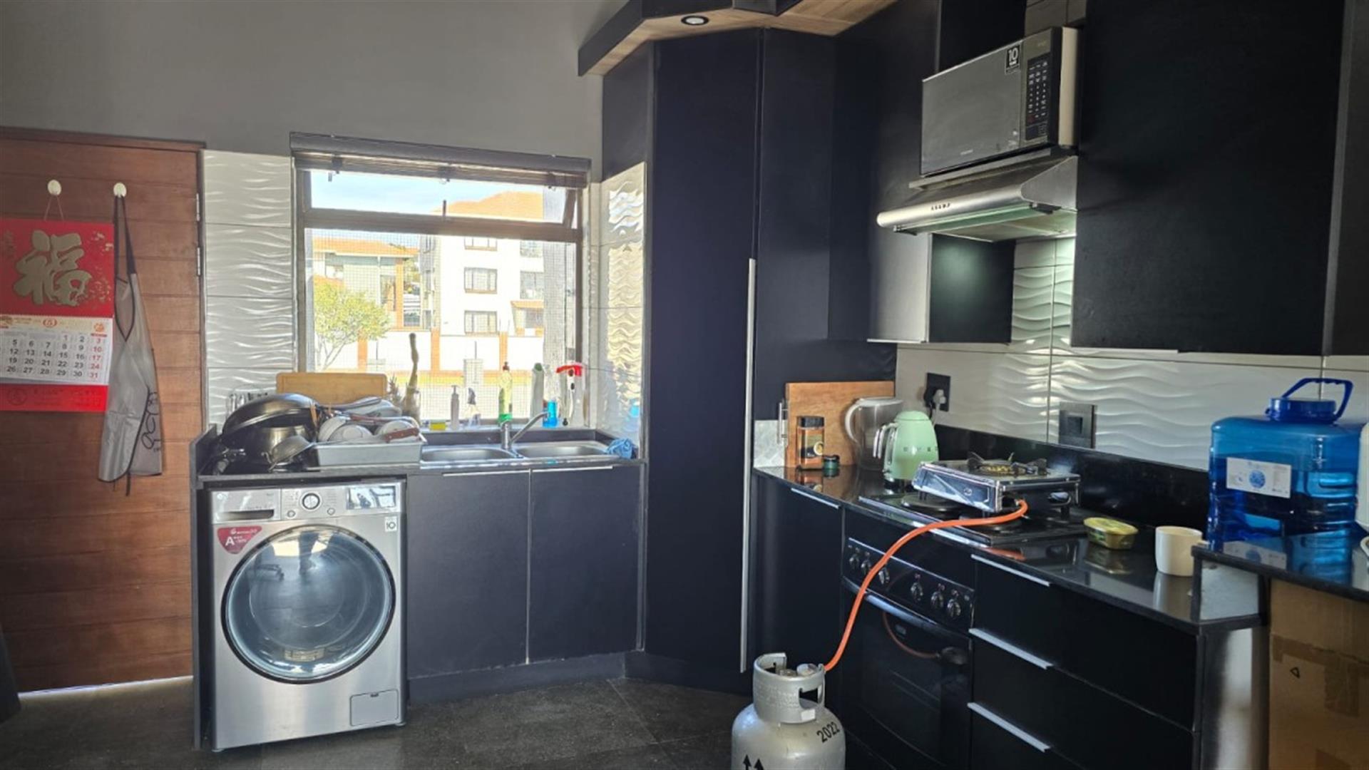 The open-plan design features a modern kitchen with granite countertops and space for a washing machine, flowing effortlessly into a spacious lounge and out to a private balcony — ideal for entertaining or enjoying peaceful sundowners.