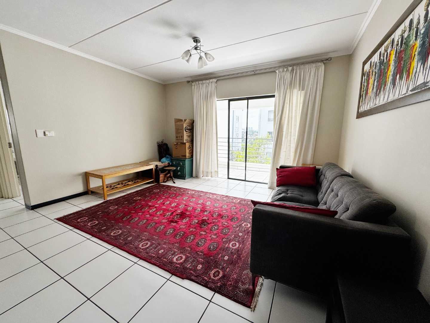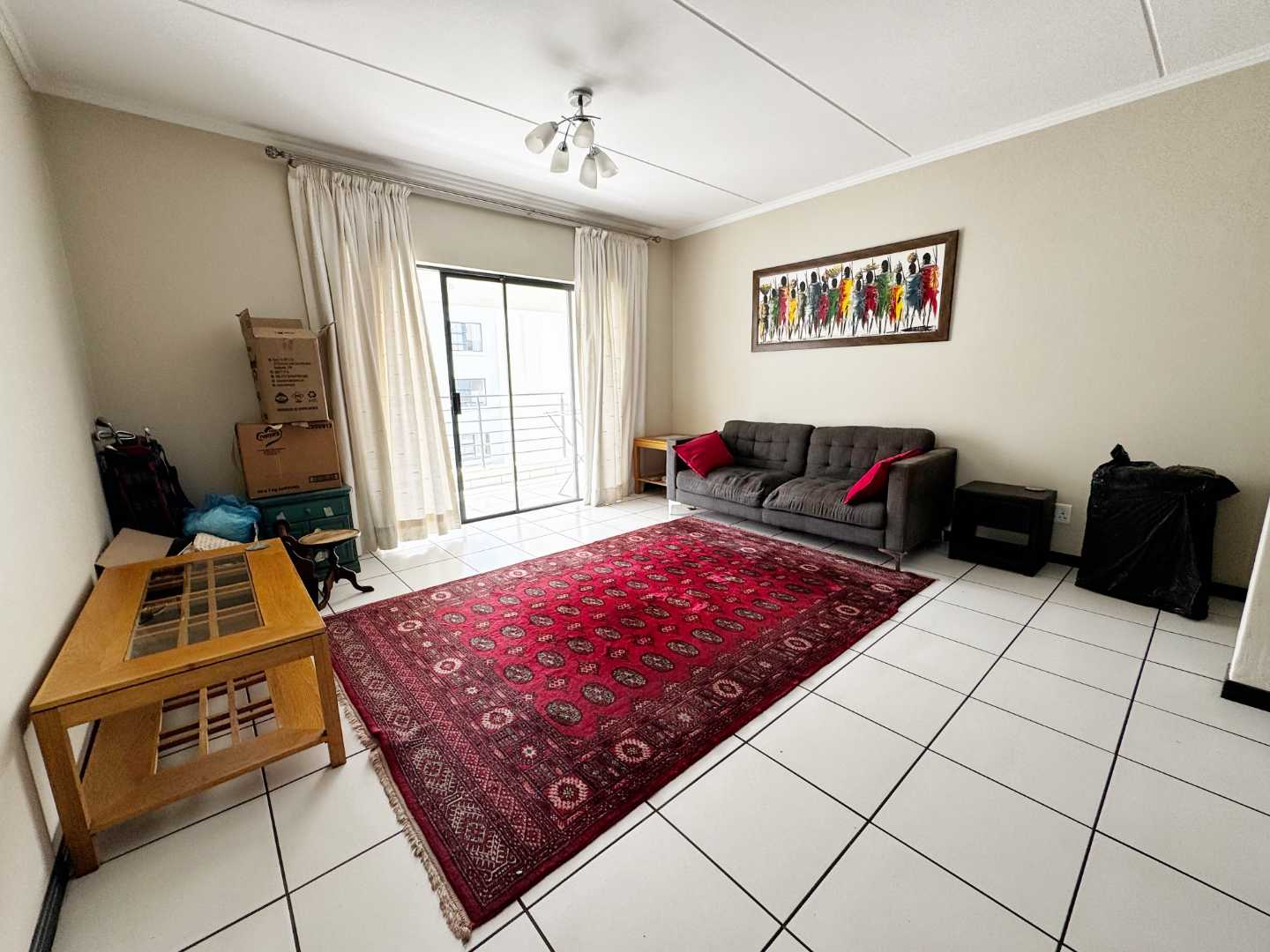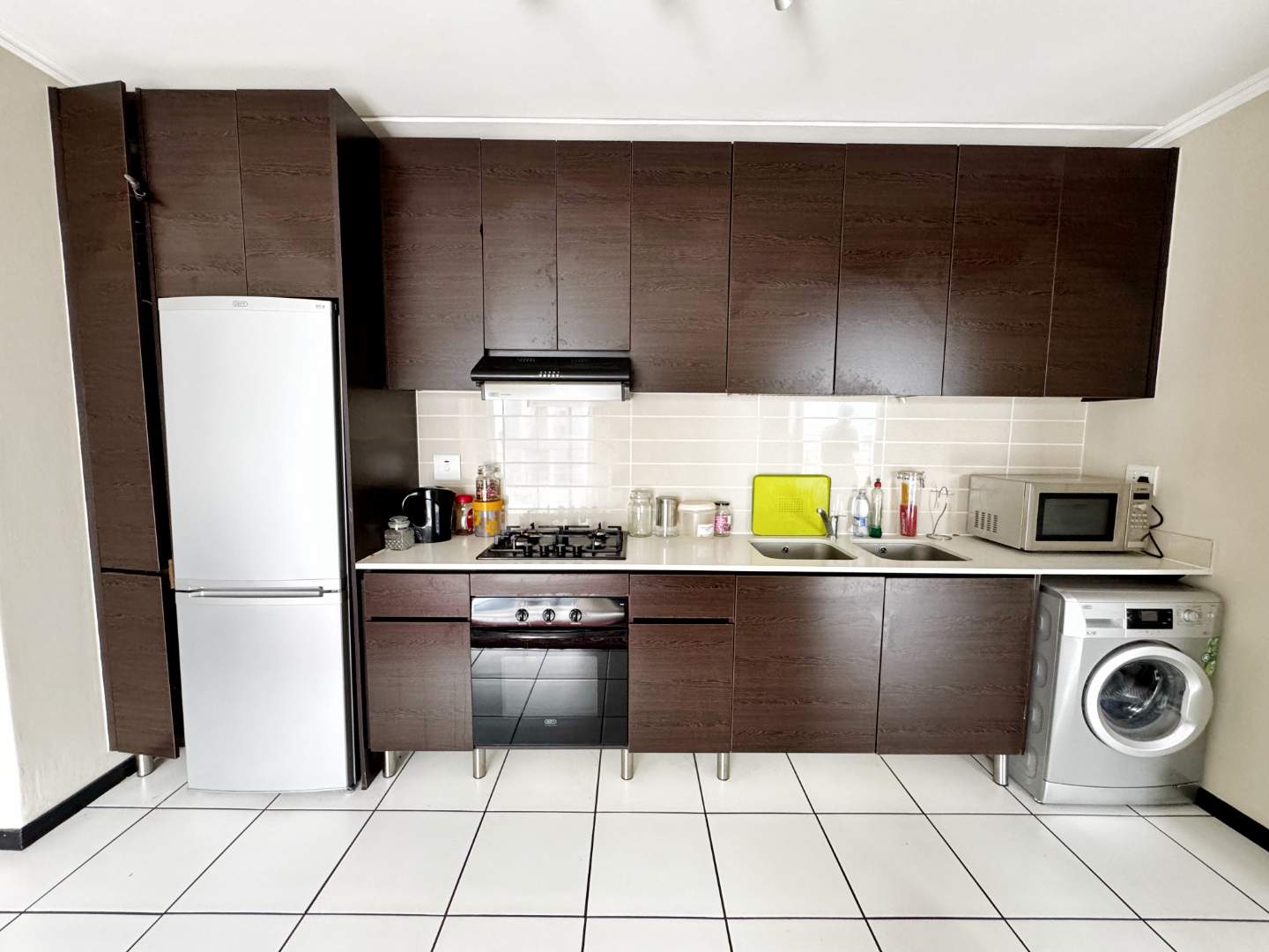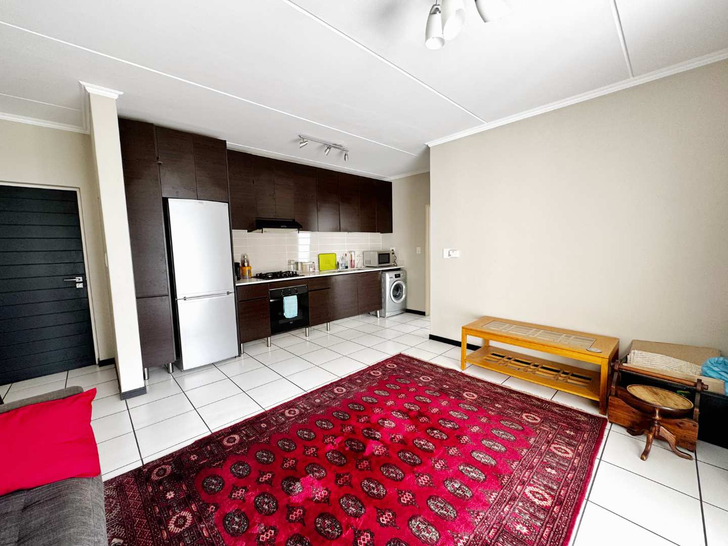Chic one- bedroom apartment in a secure complex, featuring an open- plan lounge and kitchen adorned with modern fittings.