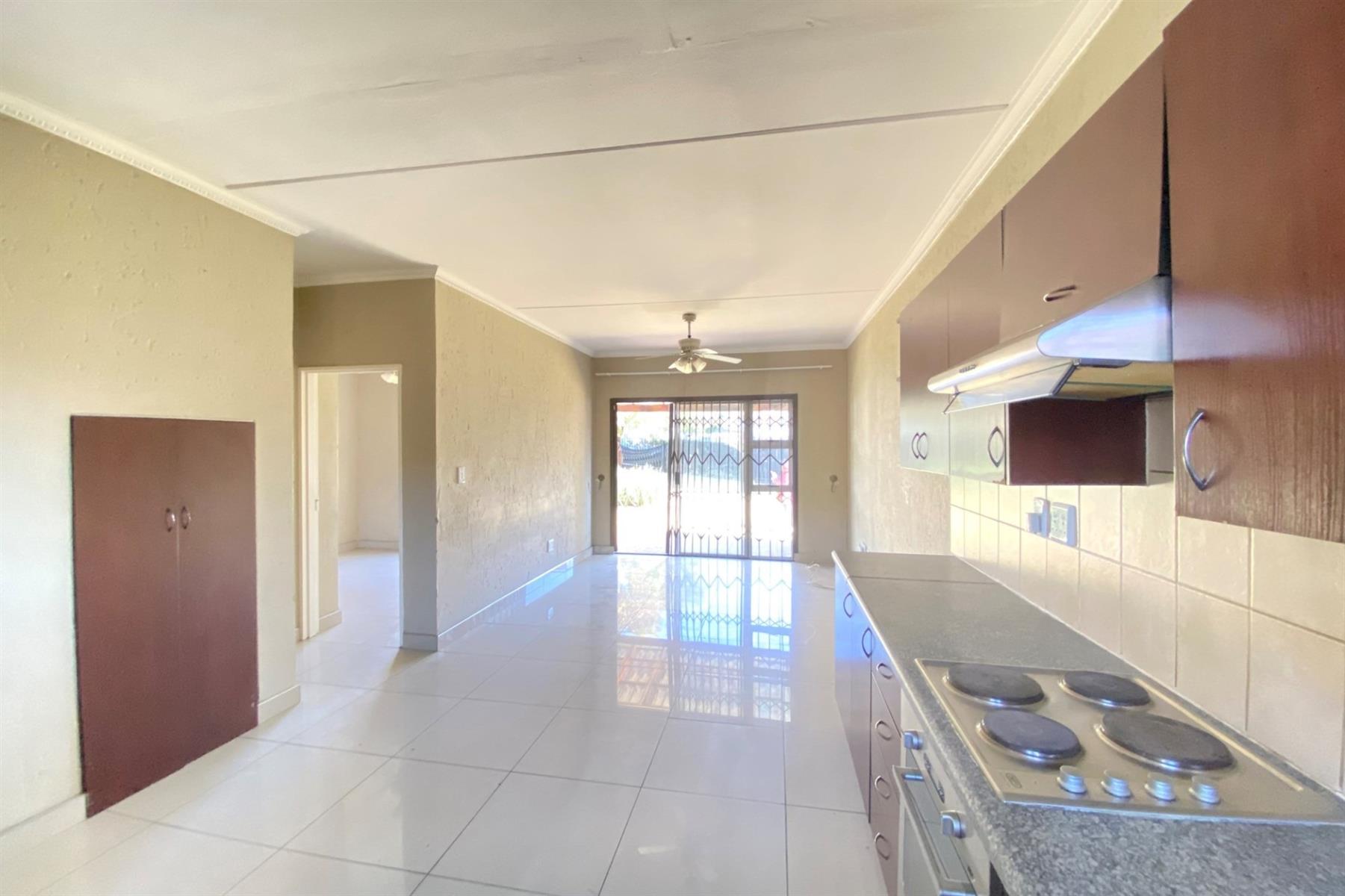 Neat open plan kitchen and lounge leading to a covered patio